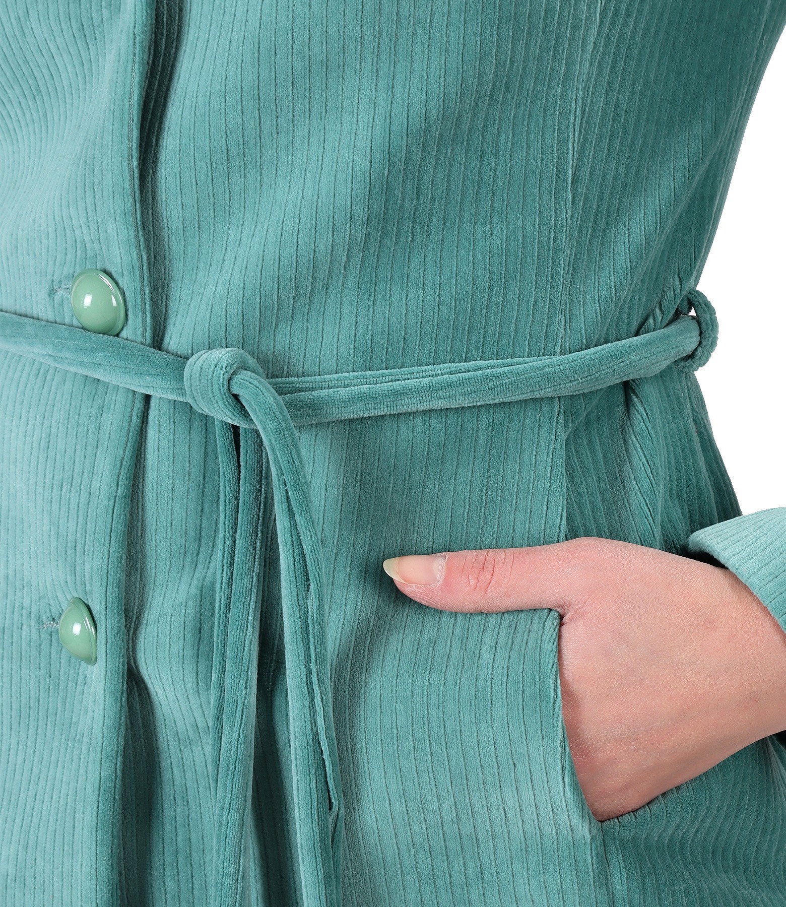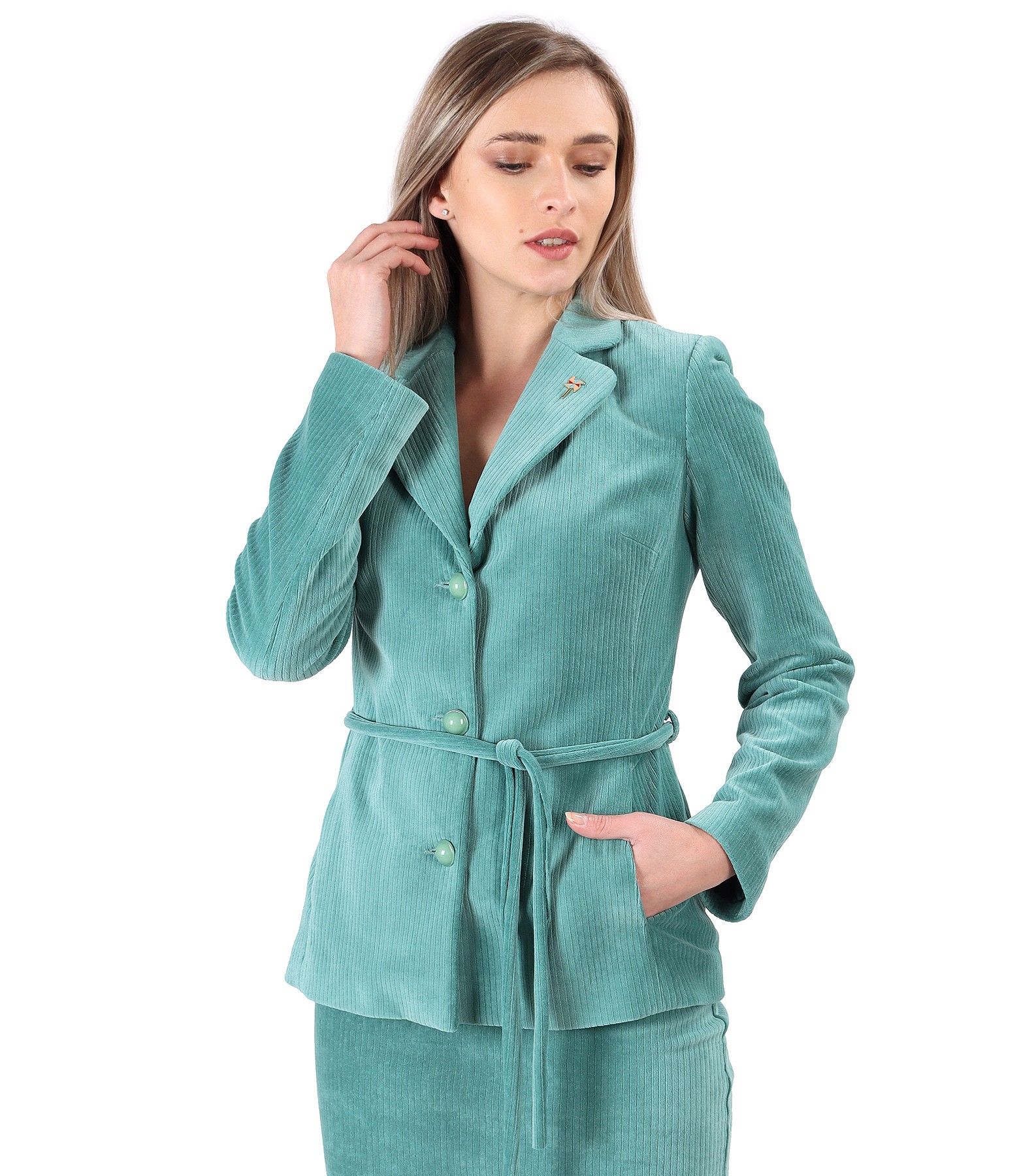 Jacket with velvet cord, with side pockets and deep V decolletage. Round collar and lapels with decorative pine. Closes with 3 buttons in the middle of the front.