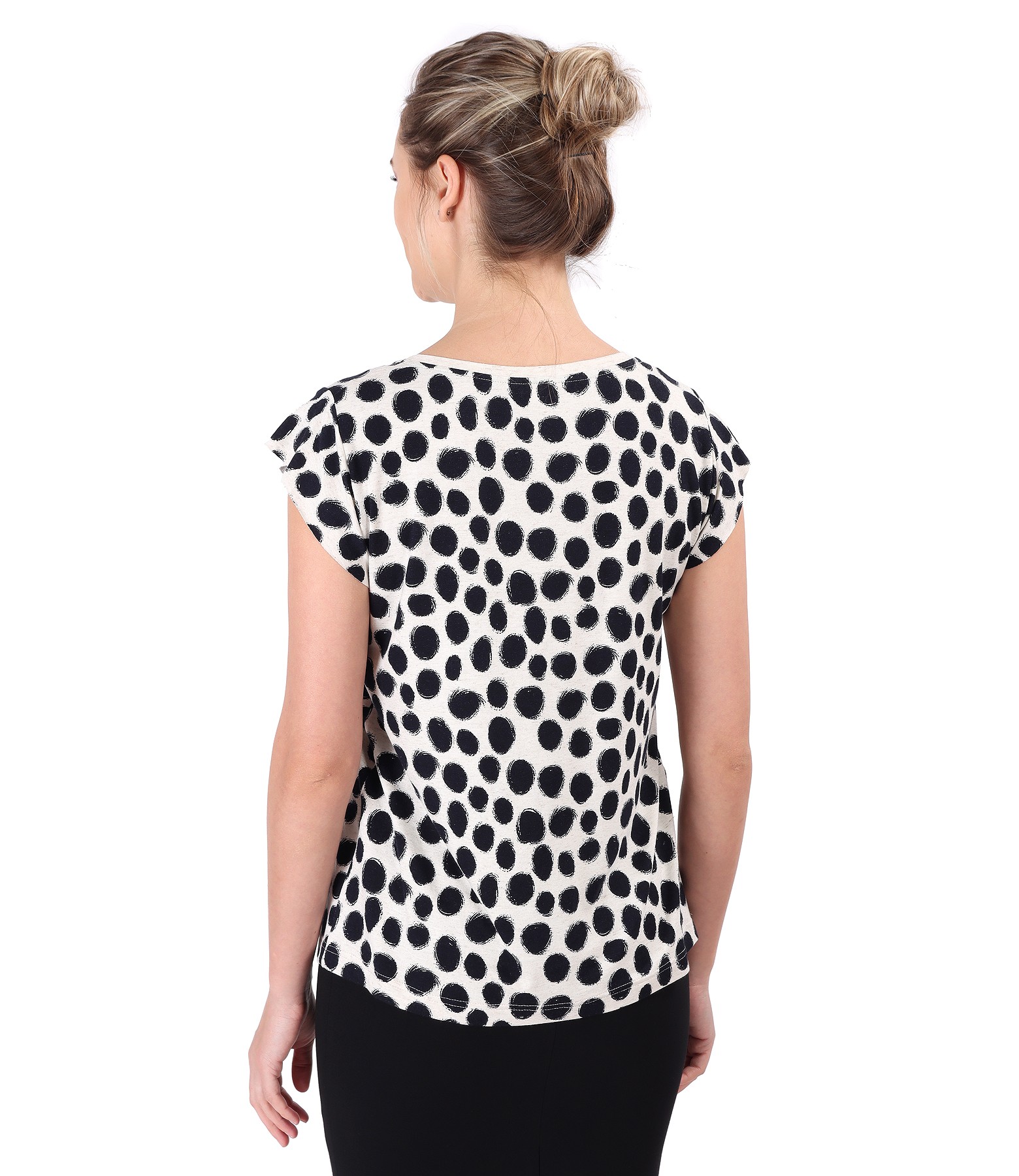 Elastic jersey blouse of viscose and flax, printed with dots, short sleeves and V neckline.