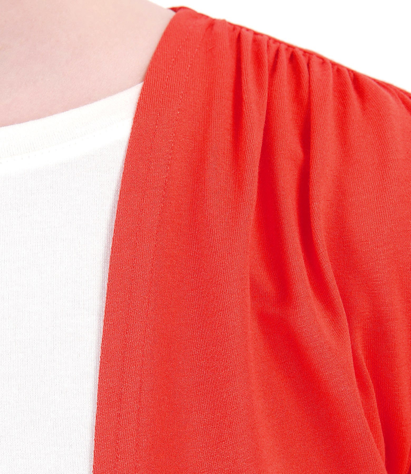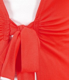 Elastic jersey blouse, open in front and wrinkled around the waist. Ties in front with a cord.