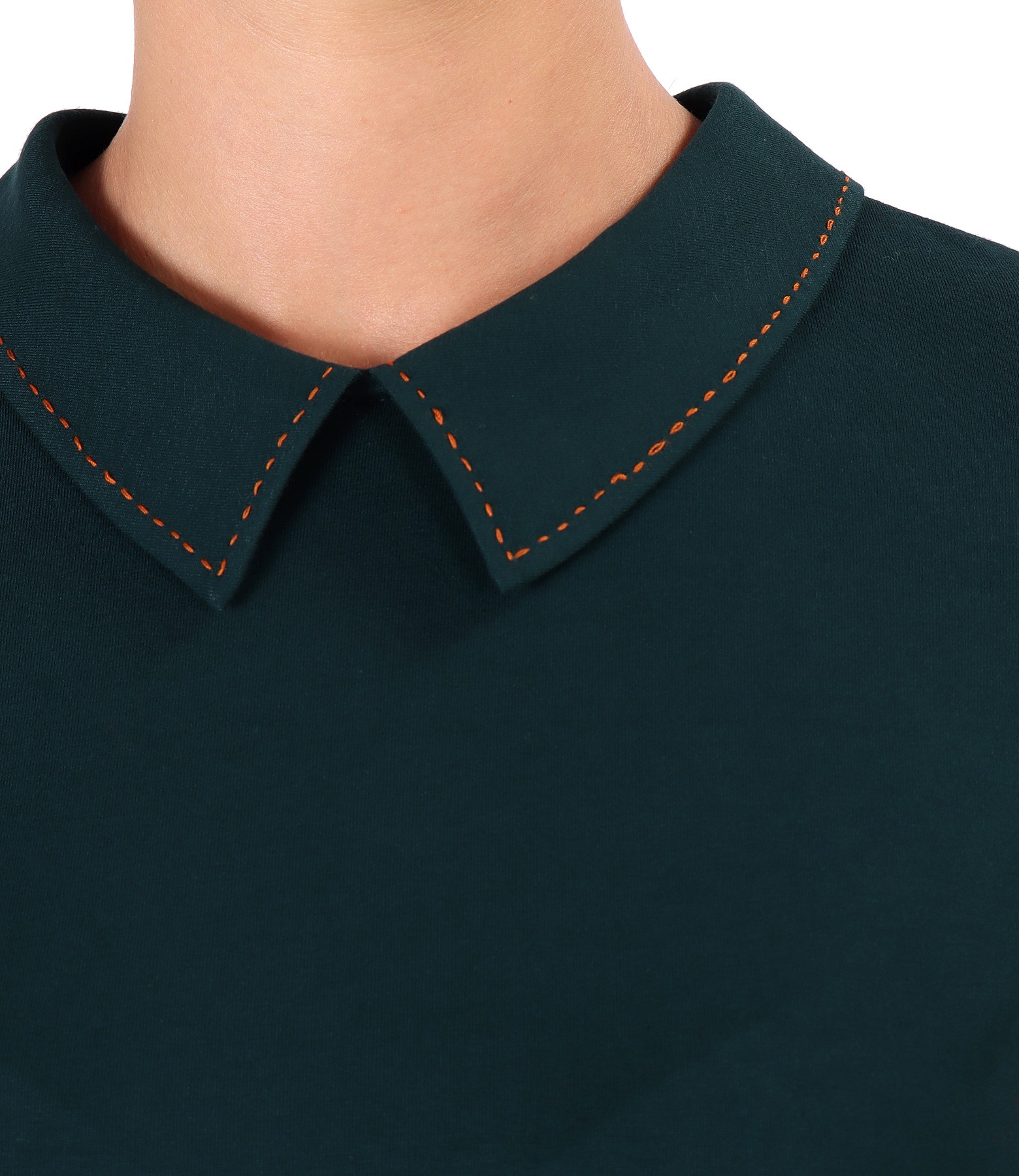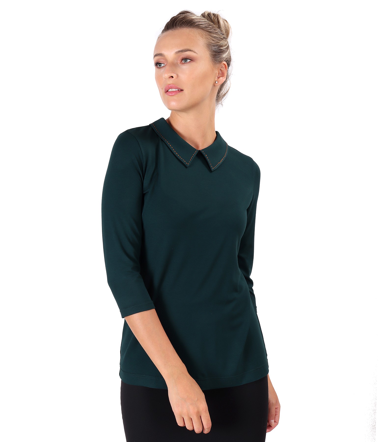 Elastic jersey blouse , with 3/4 sleeves and sharp collar with contrasting stitch. Closes with a button on the back.