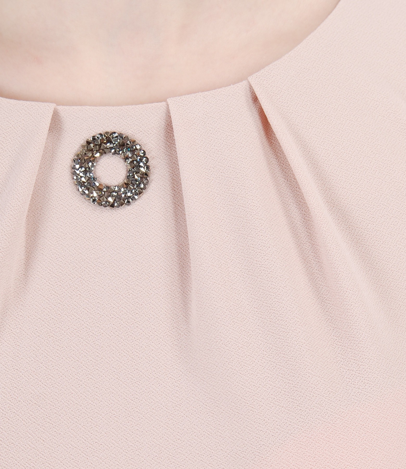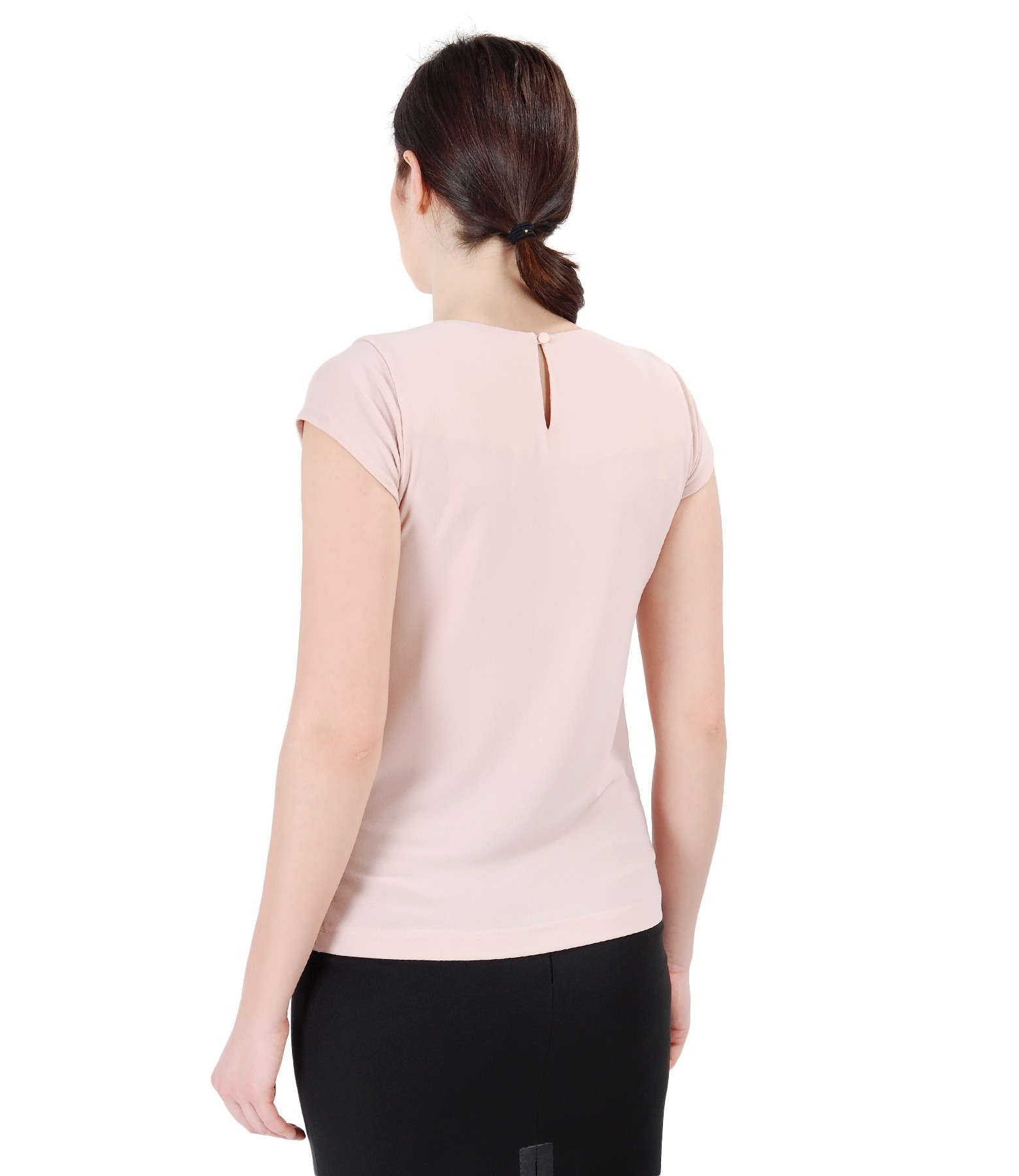 Elastic jersey blouse with short sleeves, round low-cut neck with folds, embellished with crystals. Closes with a button on the middle back.