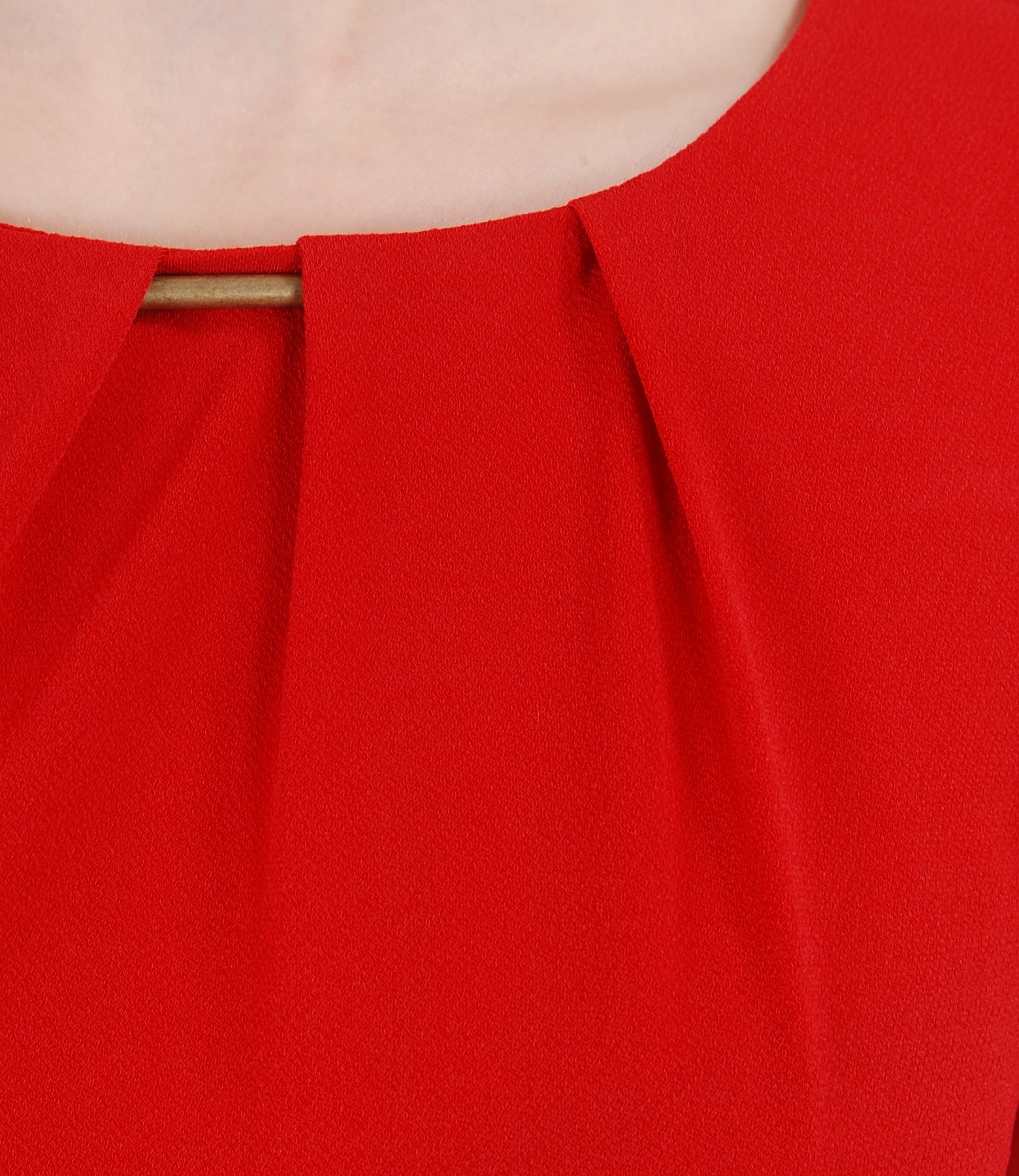 Elastic jersey blouse with sleeves, with round neckline, folds and trim. Closes with one button on middle-back.