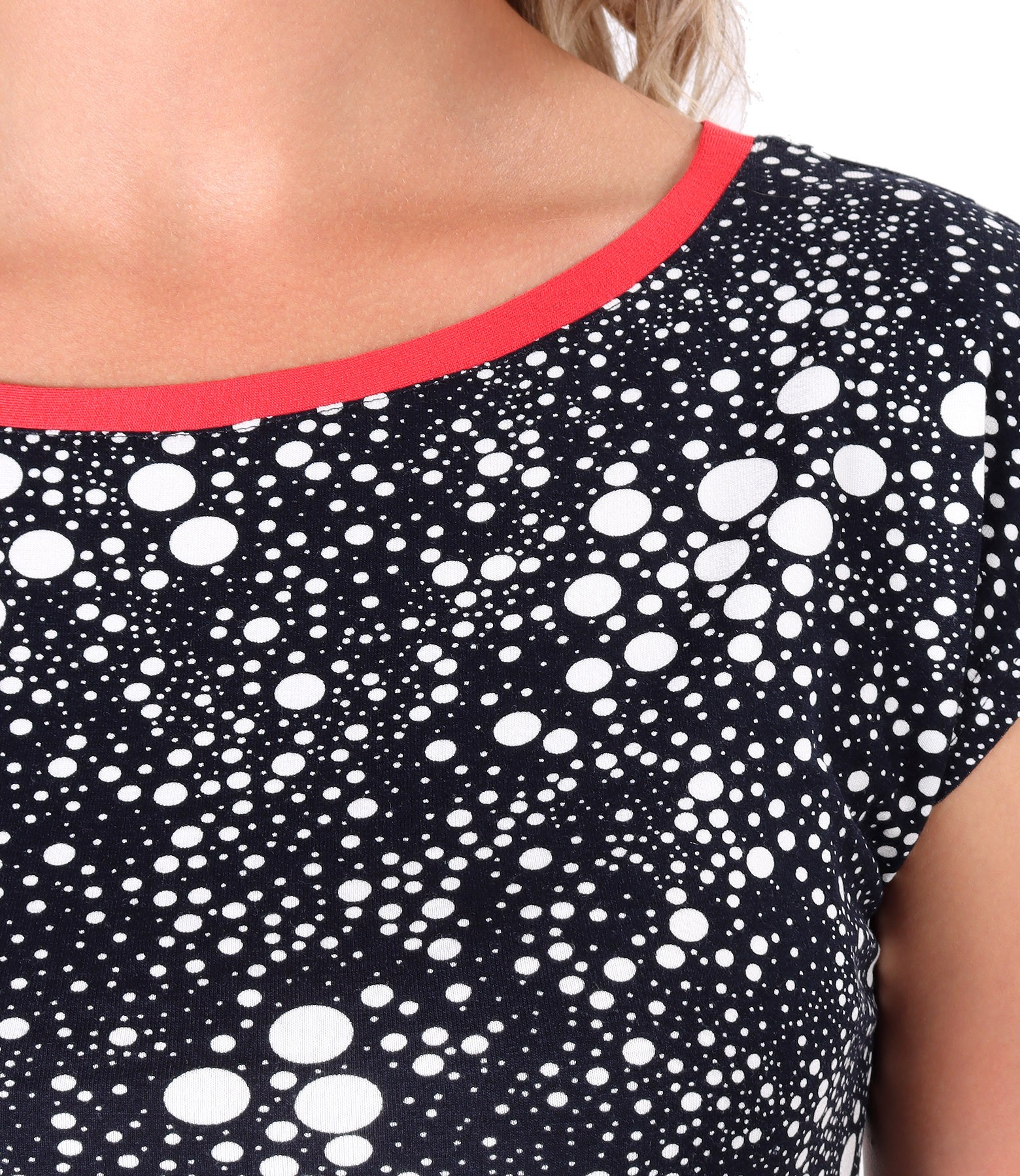 Soft elastic jersey dress printed with lace corner, unlined, with boat neckline, dropped shoulders and decorative hearts sewn at the sleeves.