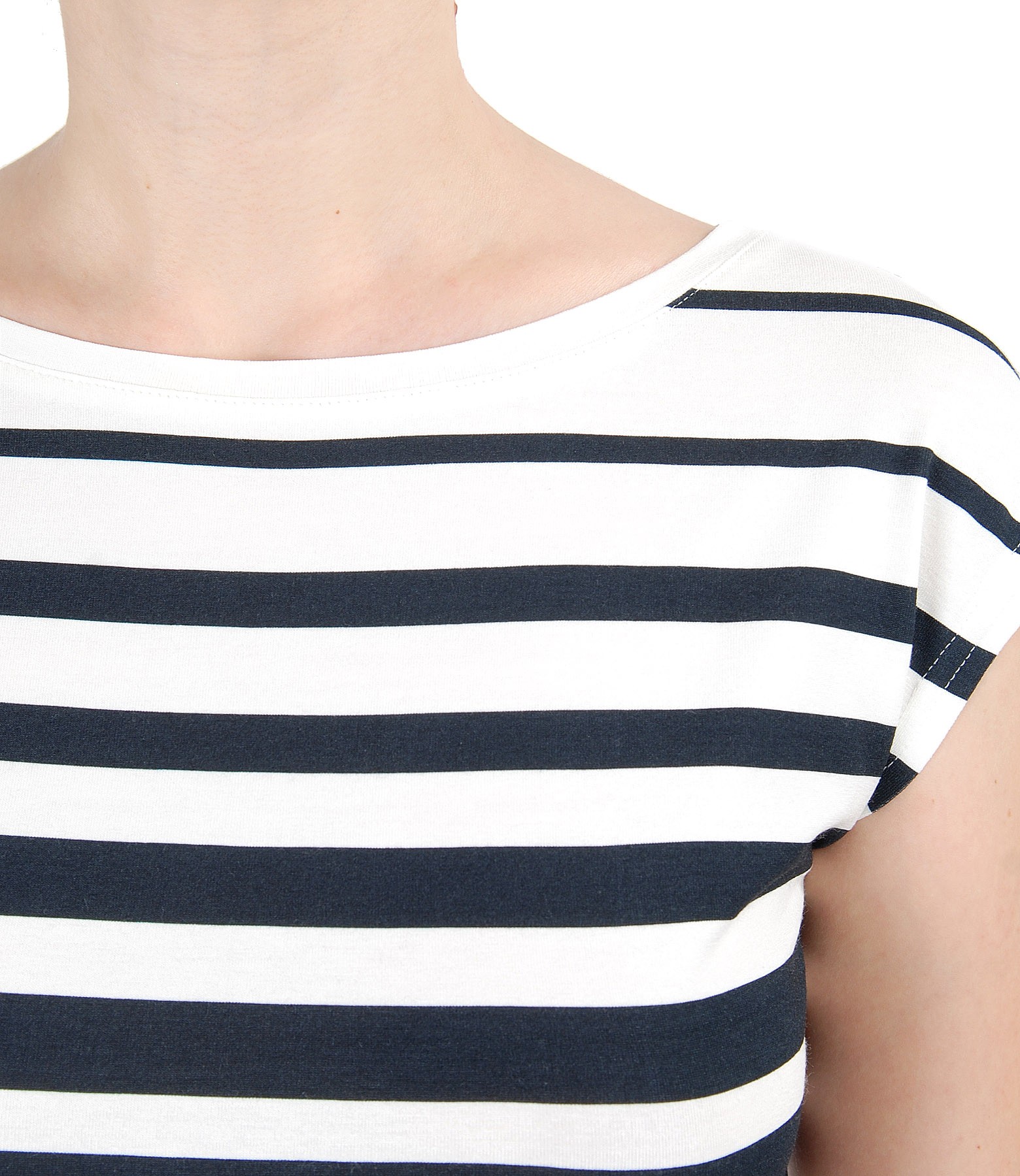 T-shirt with boat decolletage, with stripes print and draped shoulders.