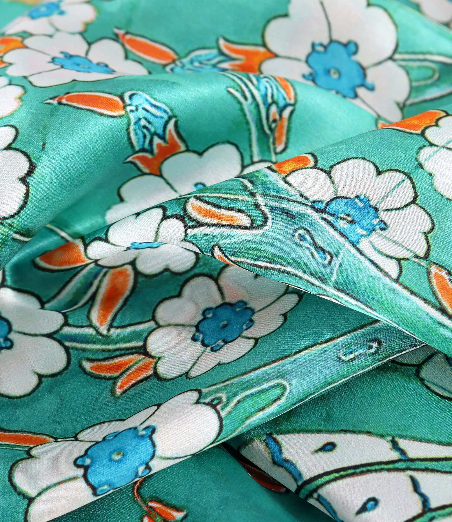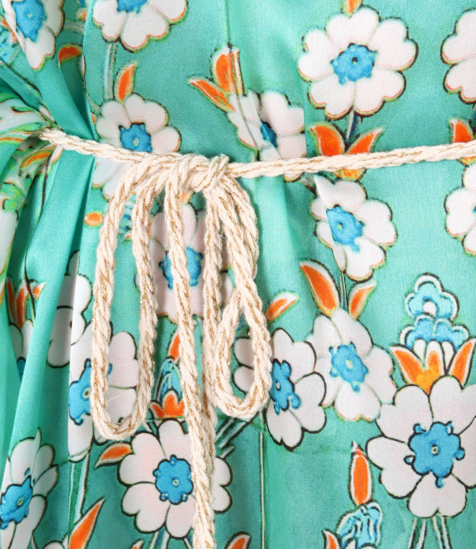 Kaftan dress in fine natural silk, unlined. It is digitally printed with floral motifs specially designed in Italy, Como. It has a removable cord in the waist, thick lace type, with golden thread inserted.