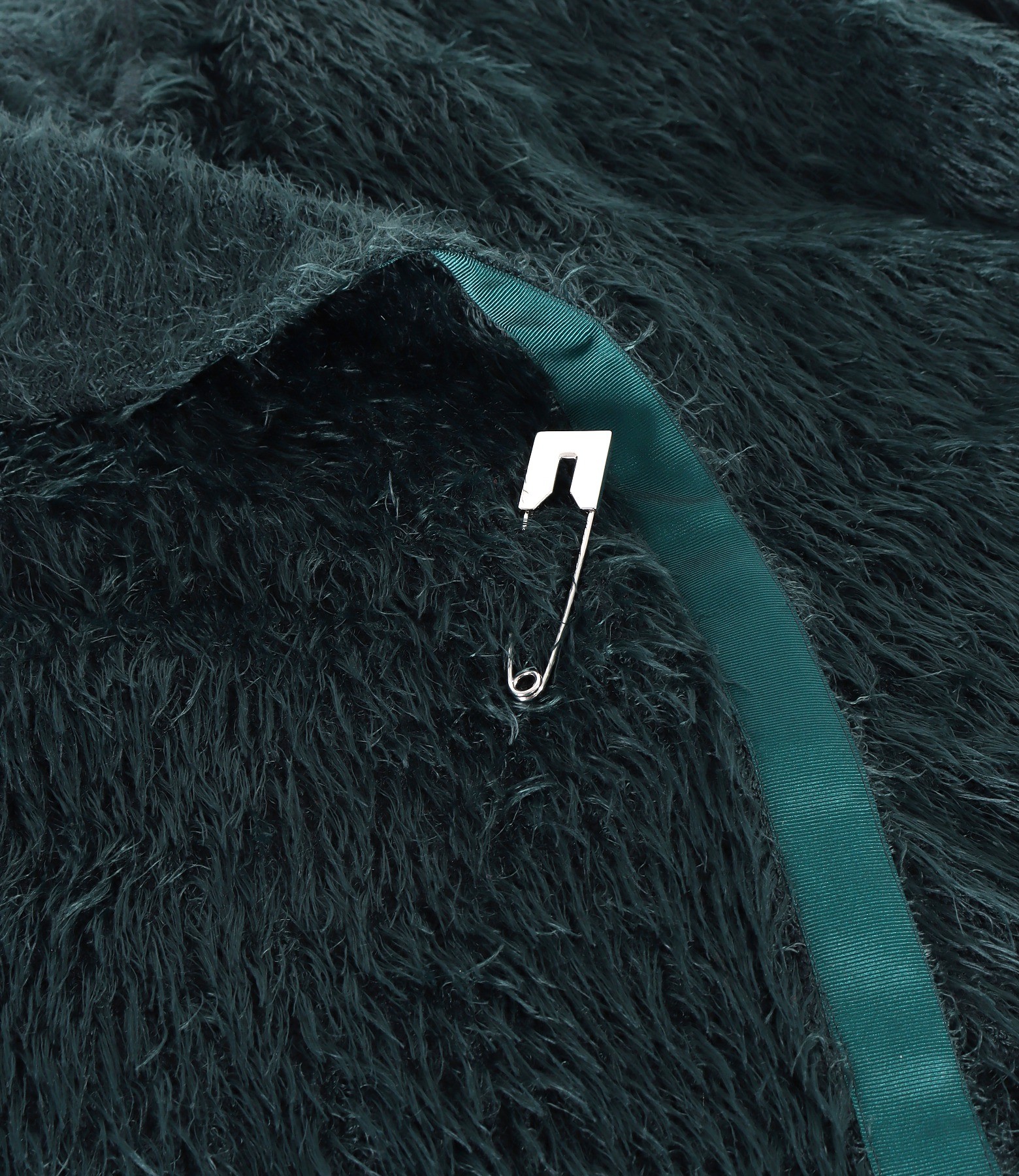 Knitted cardigan with rips on the face, unlined, with long sleeves and applied pockets. Closes with a decorative safety pin.