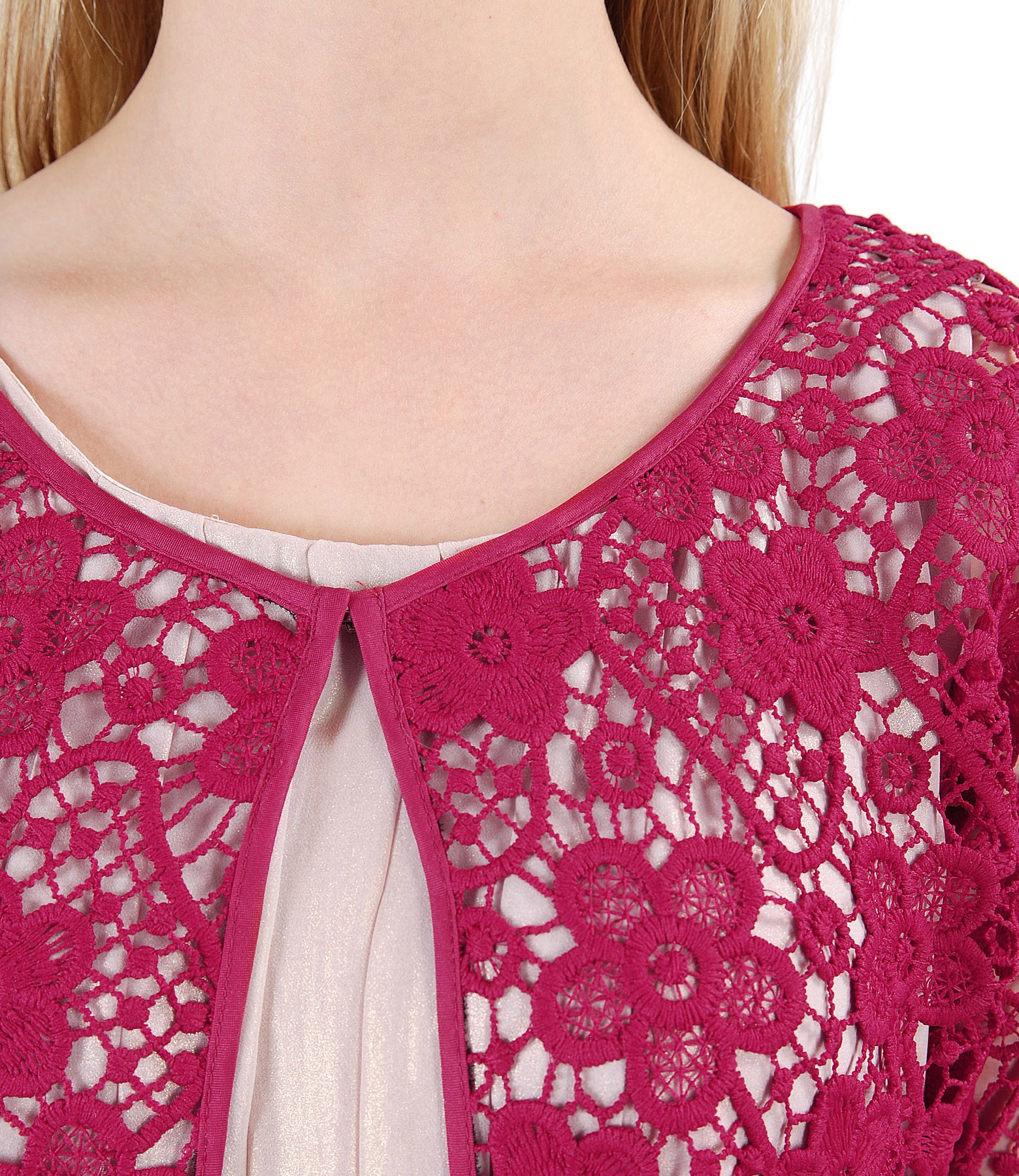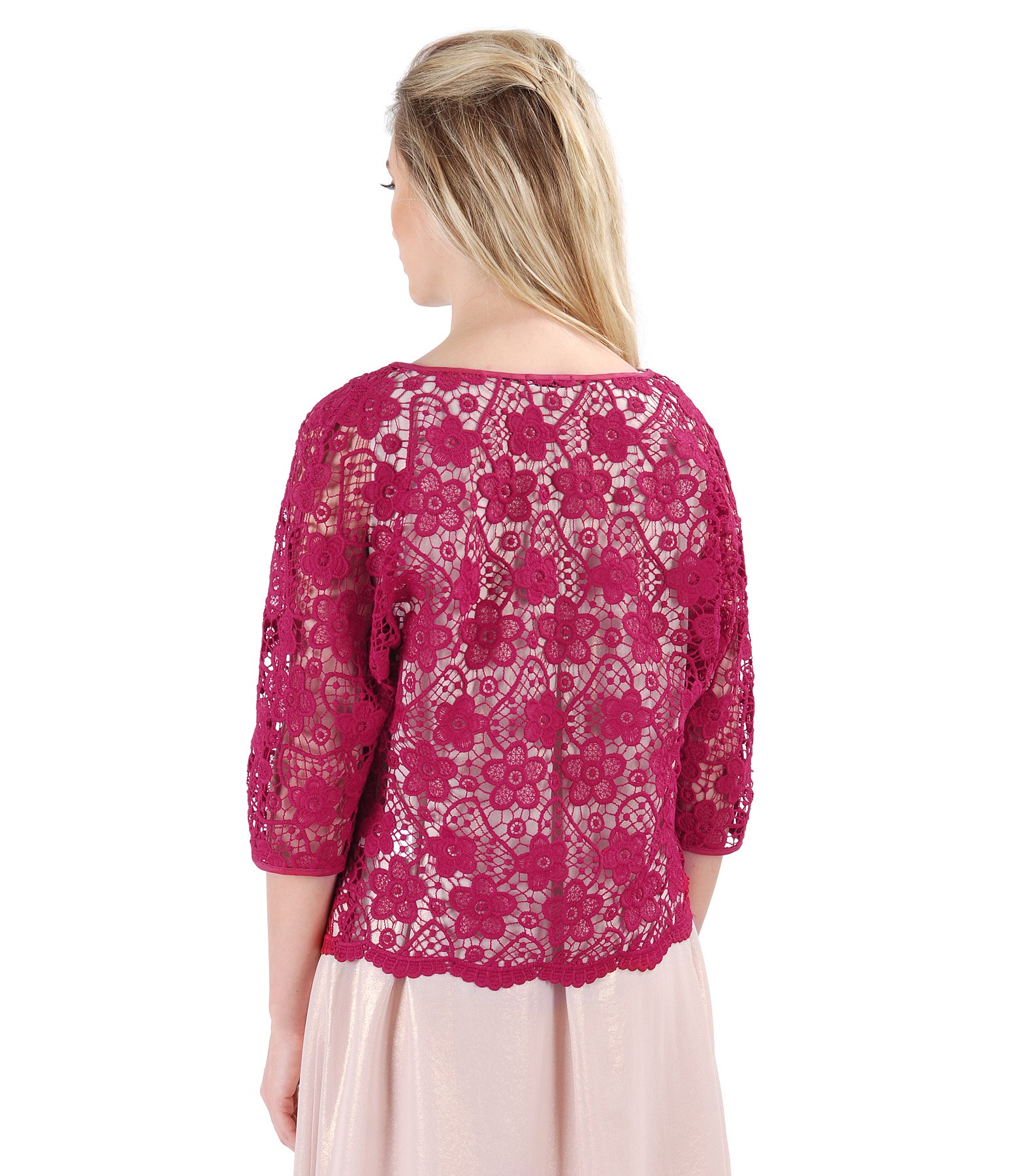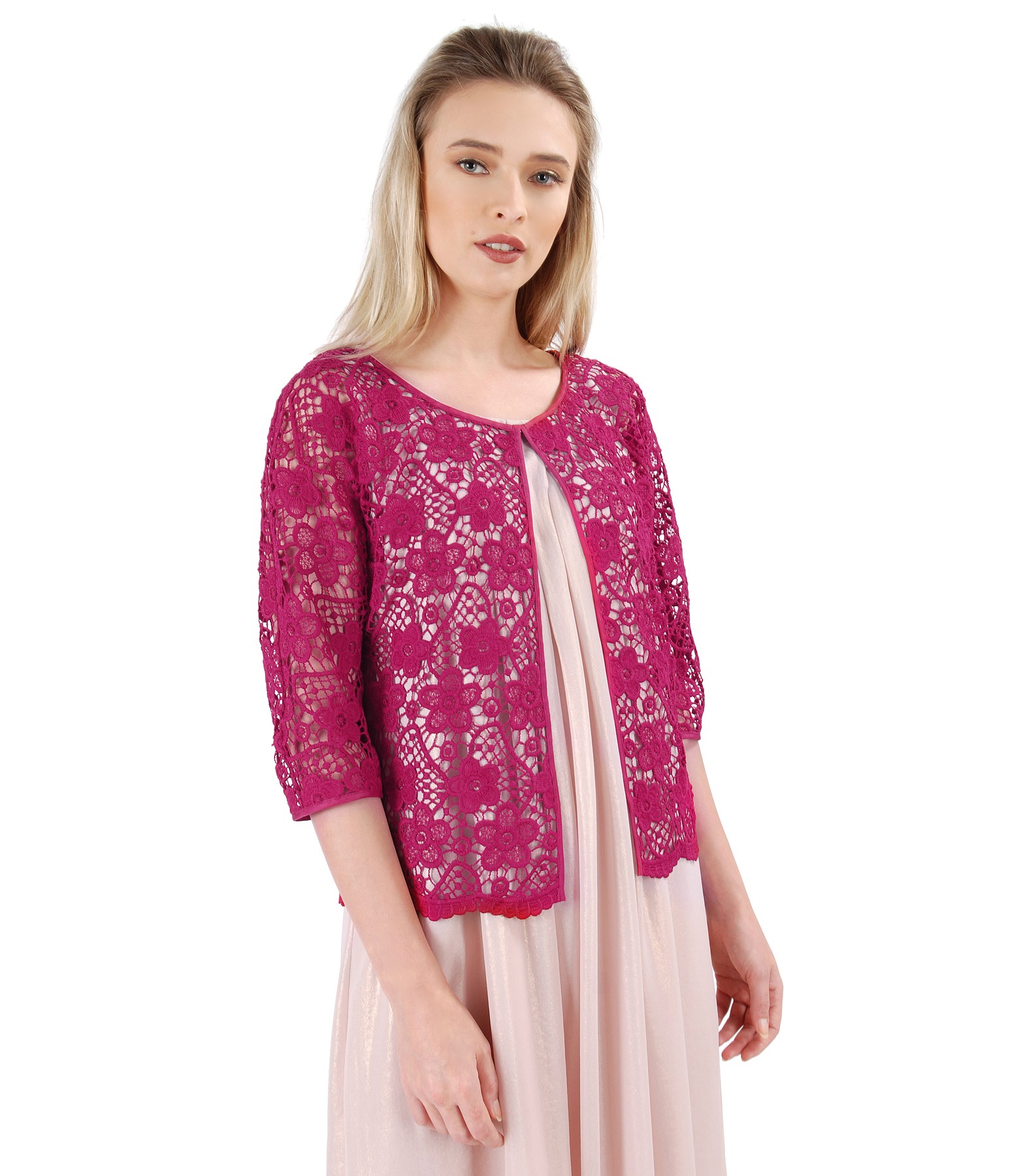 Lace bolero with floral motifs, 3/4 kimono sleeves. Closes with a front staple.