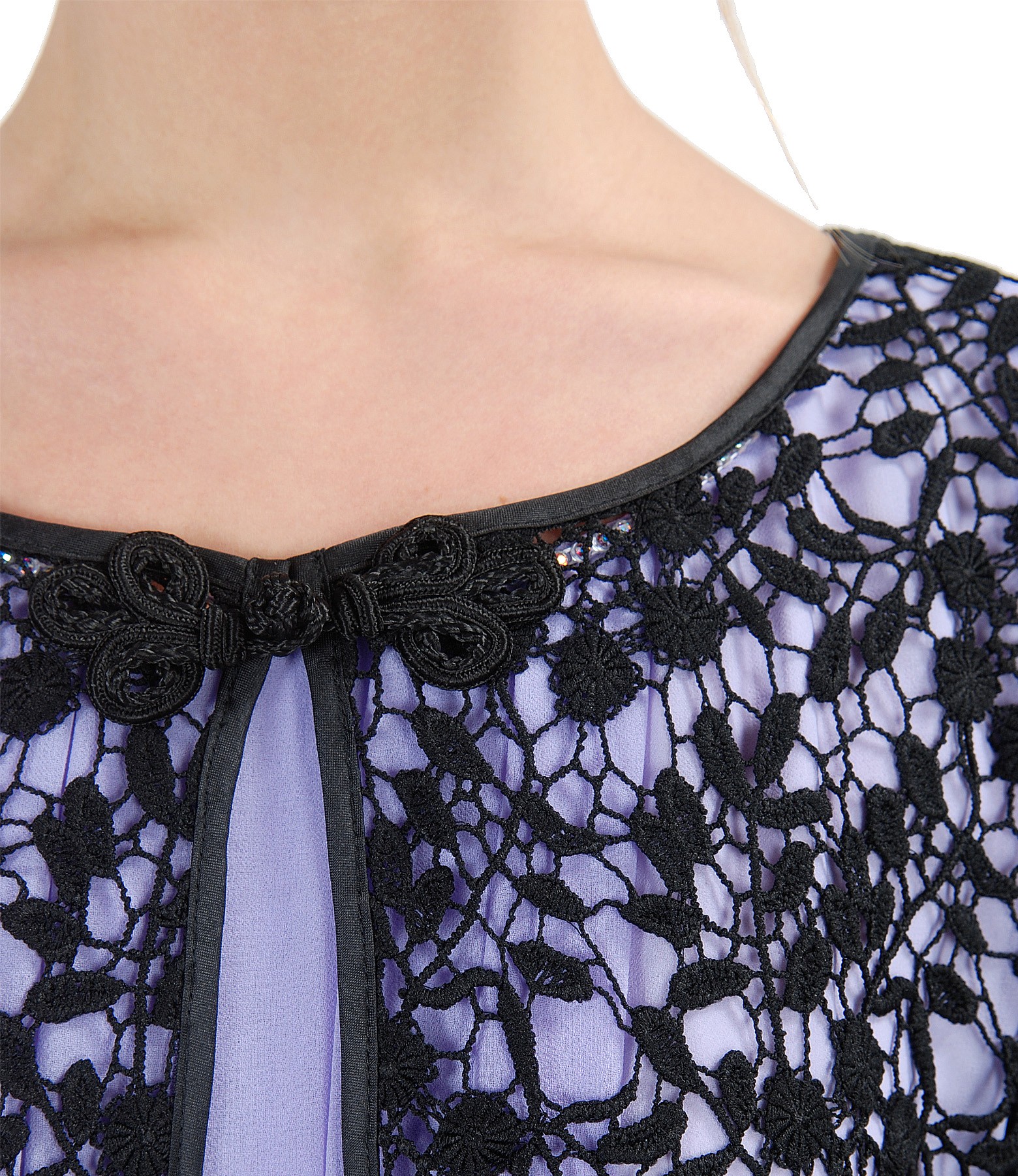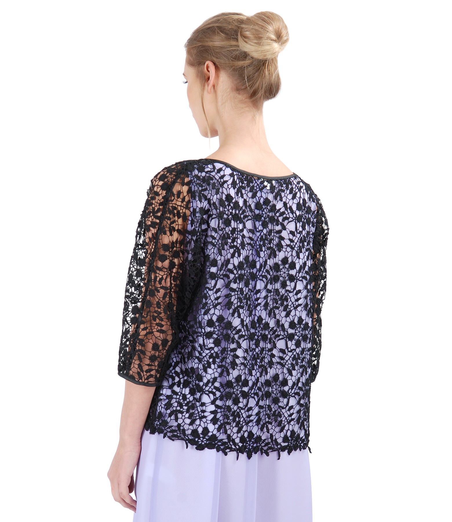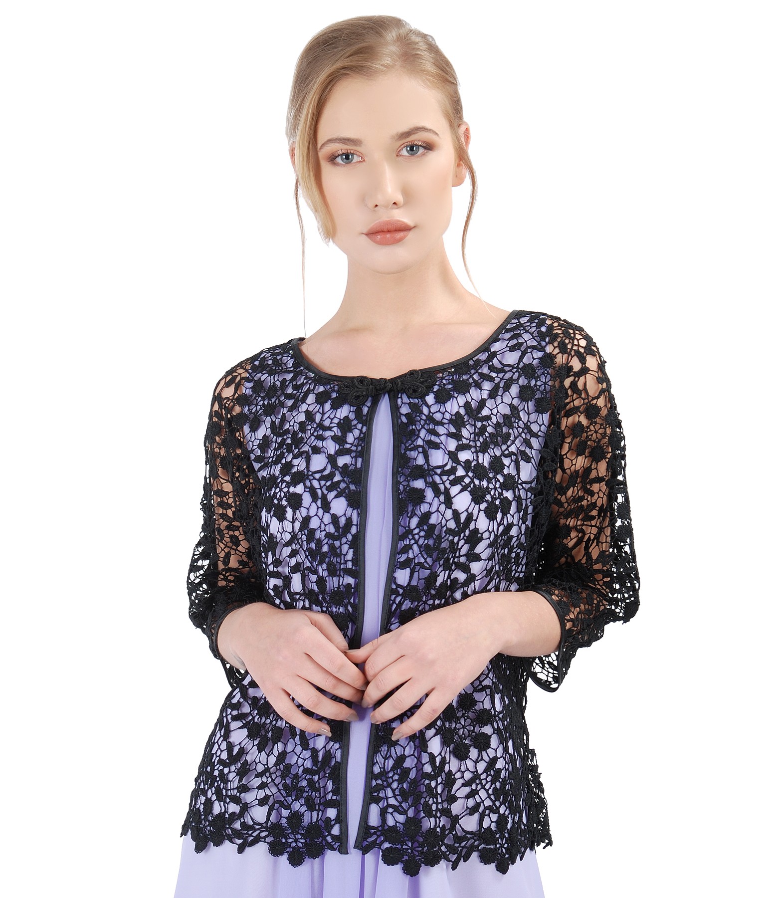 Lace bolero with floral motifs, with 3/4 kimono sleeves. Closes with a front bandenburg.