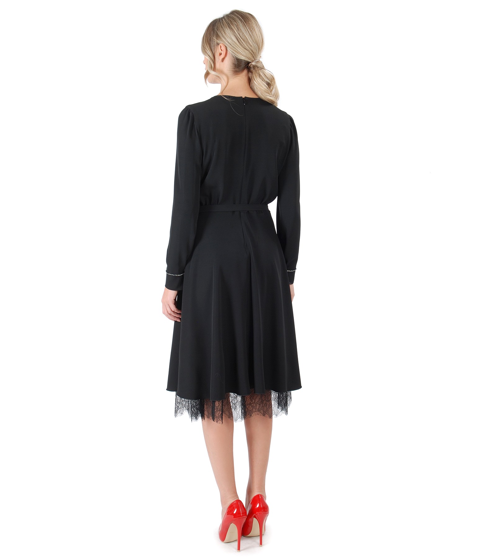 Elegant dress, padded, with long sleeves with wristbands, lace on edge and waist belt, embellished with crystals on the wristbands. Closes with hidden zipper on the middle back.