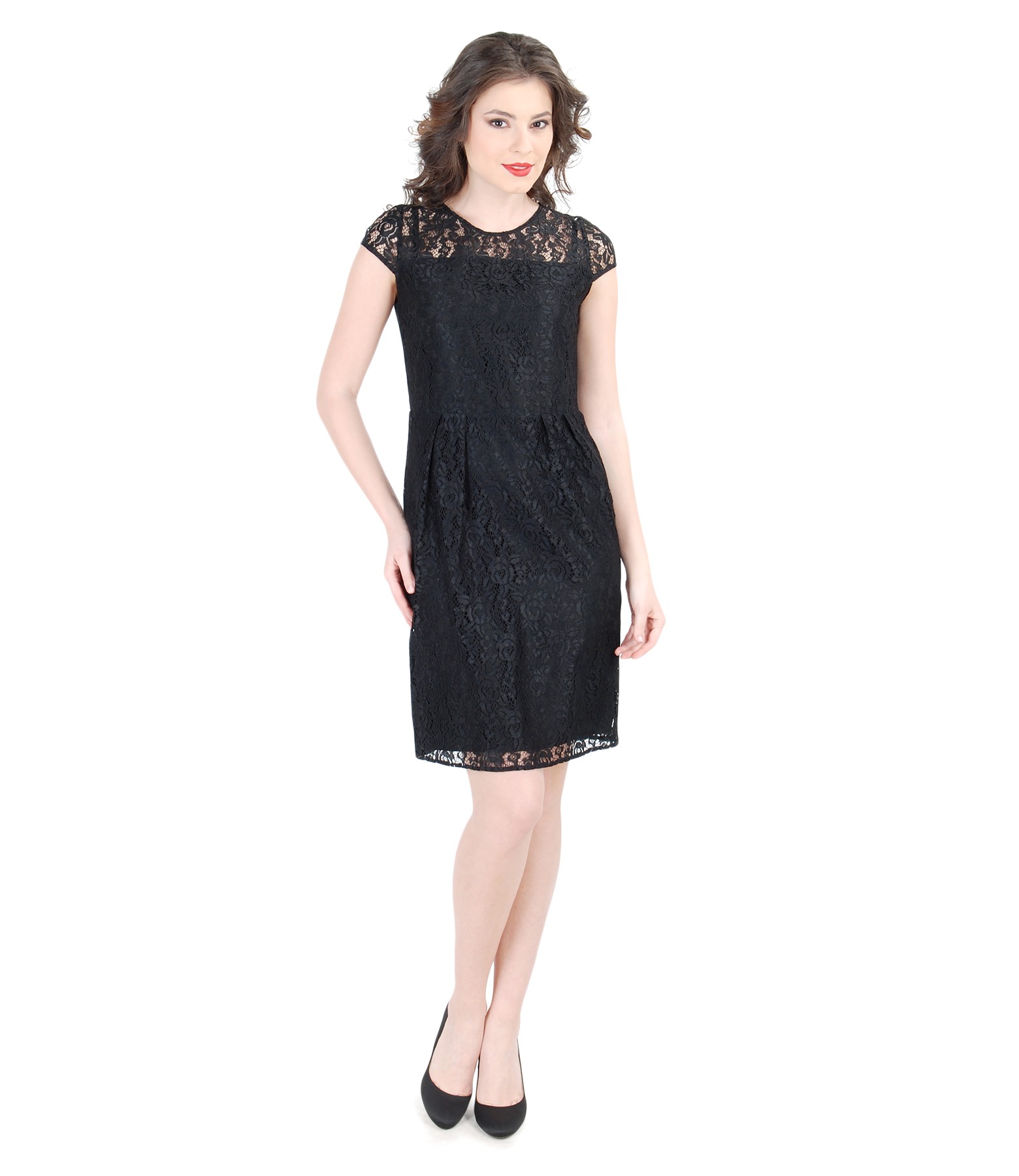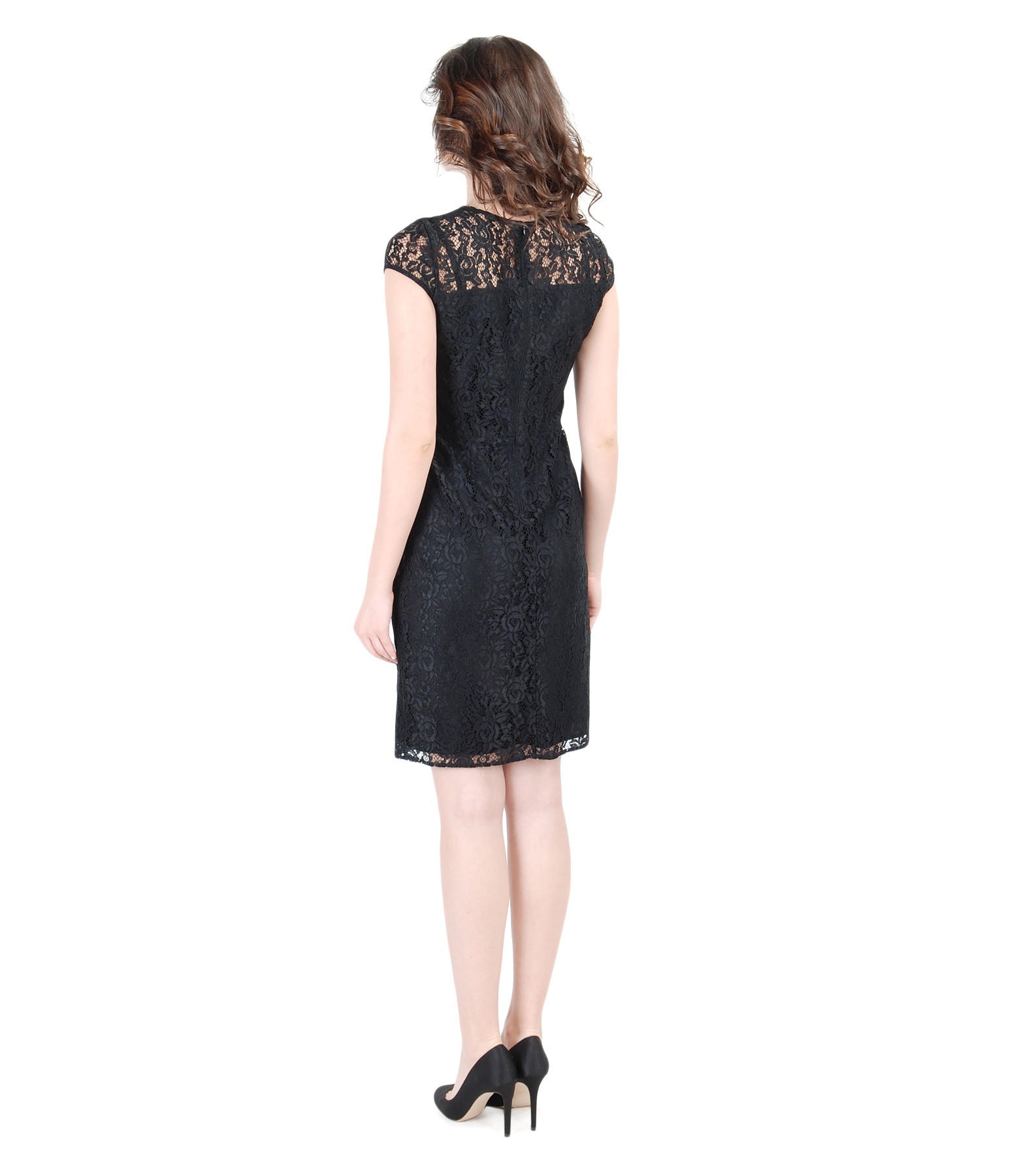 Elastic lace dress, with fins and side folds in waist. Doubled with soft elastic knit. Middle-back concealed zip fastening.