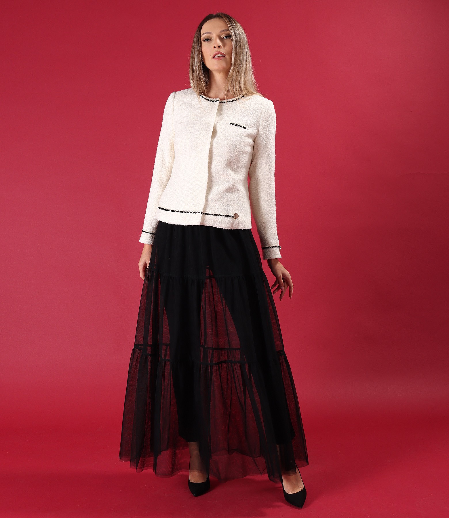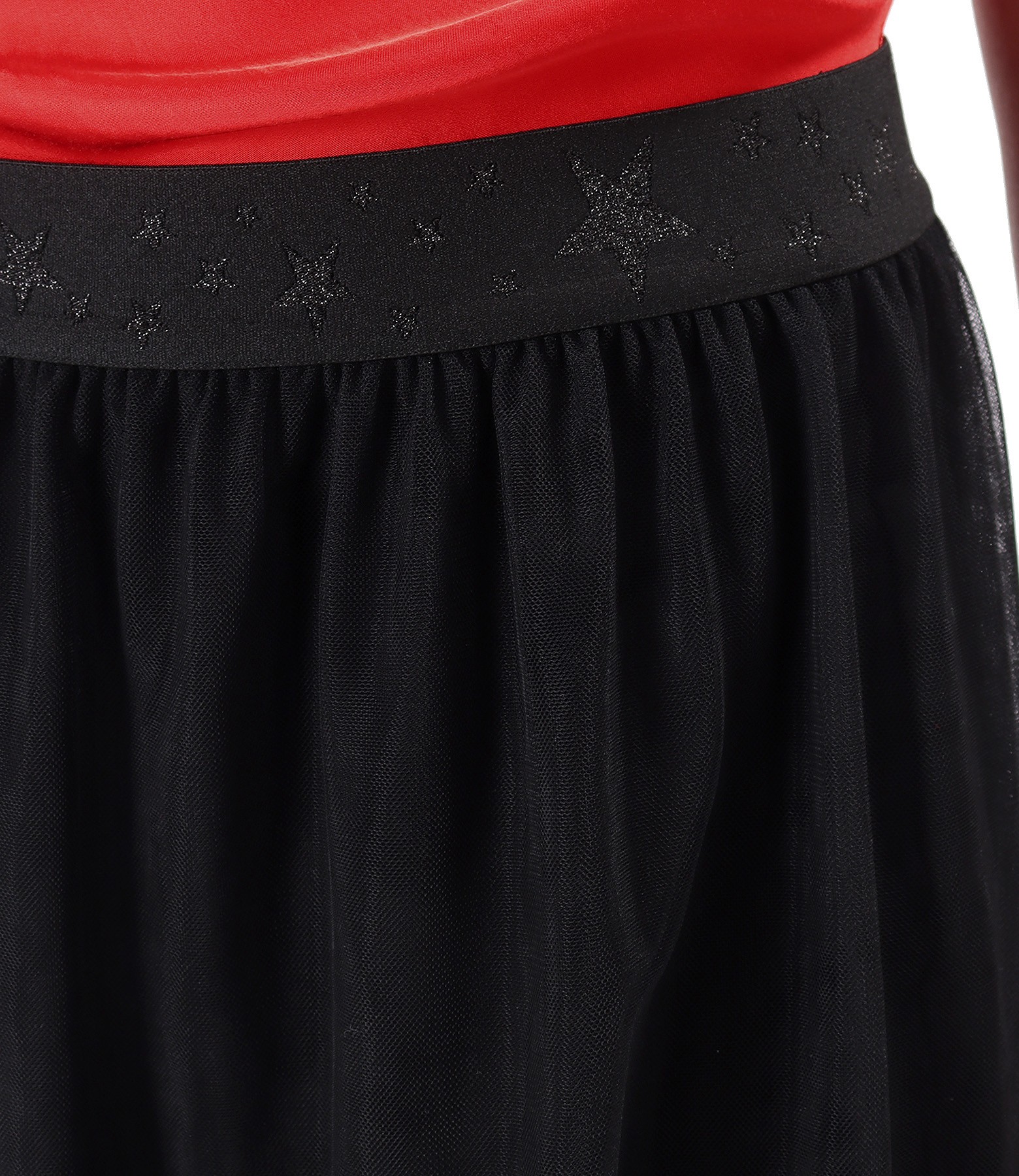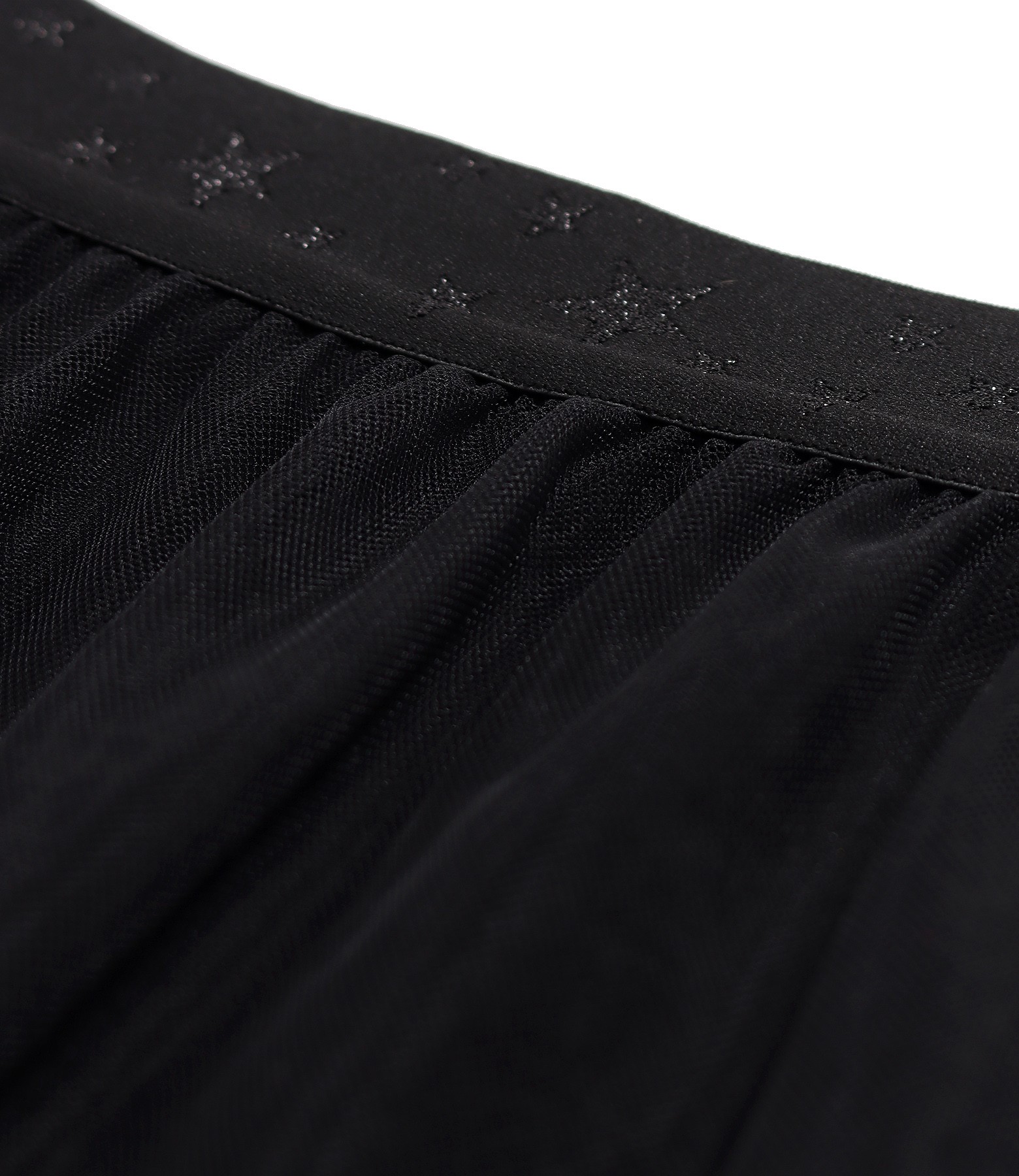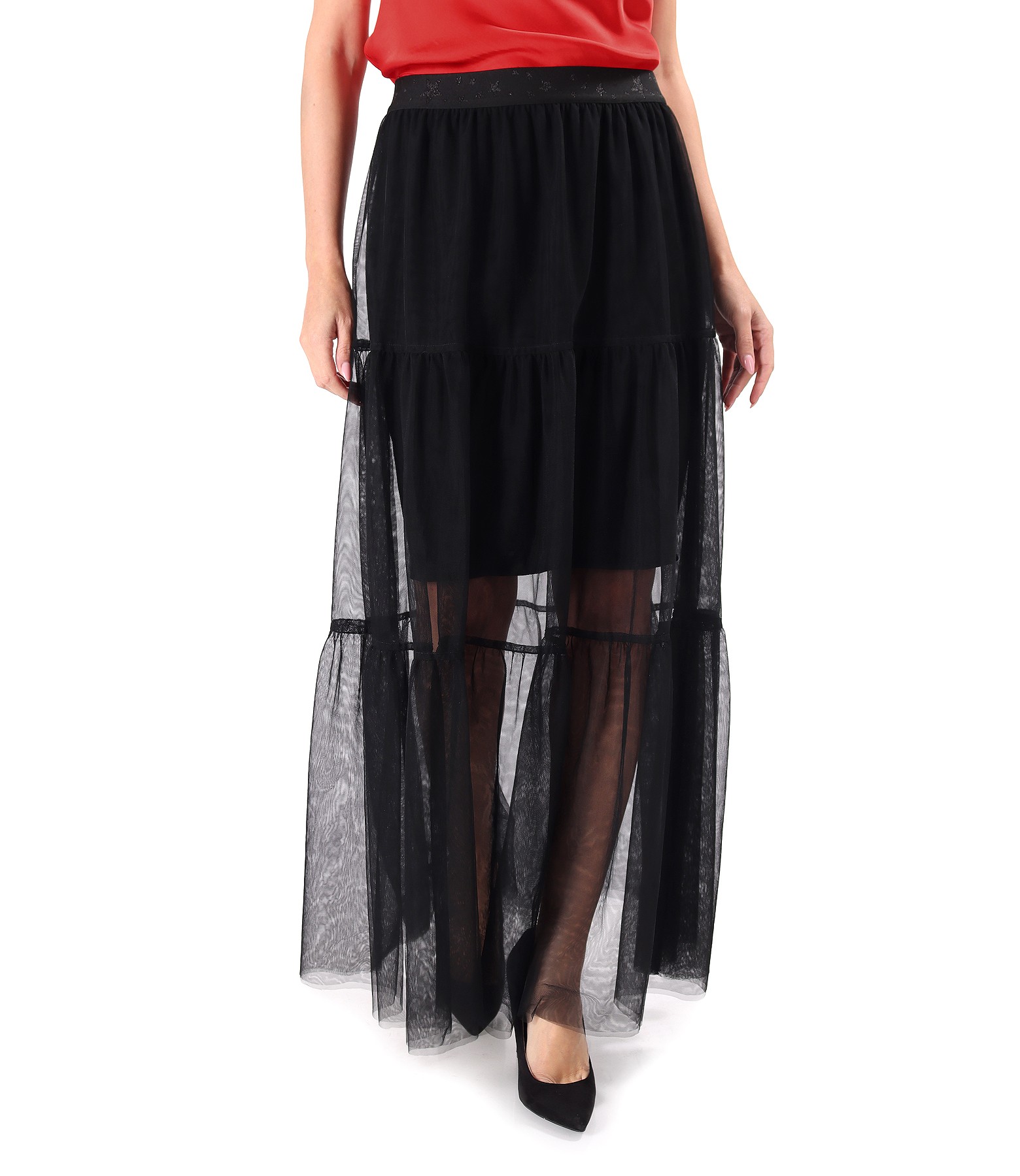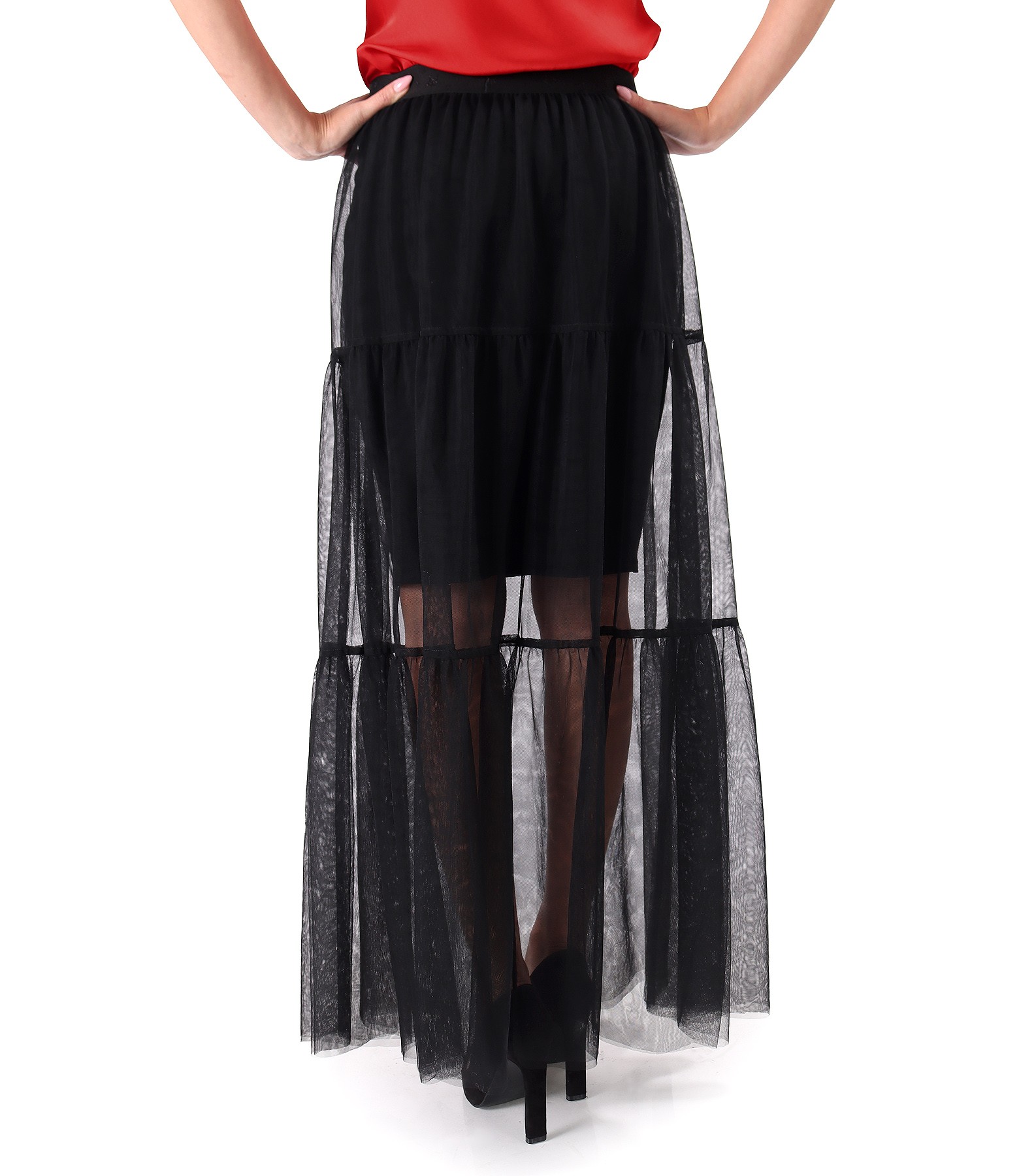 Long black tulle skirt with removable petticoat, frills, and a decorative elastic band at the waist.