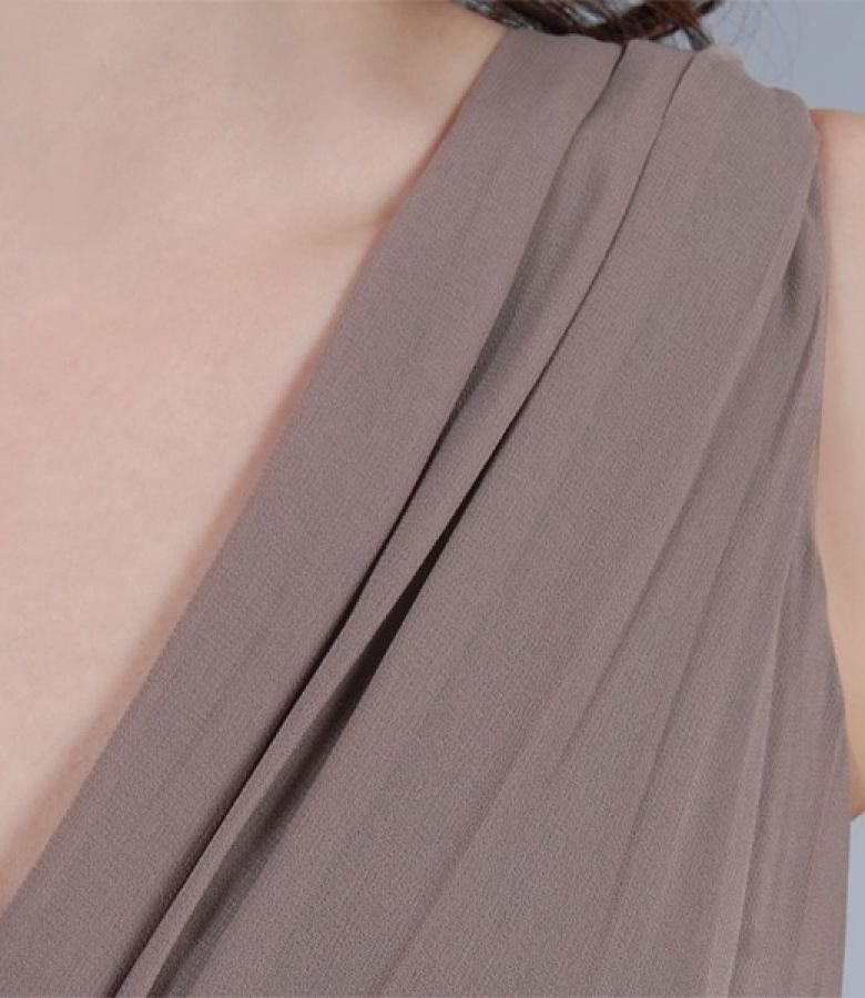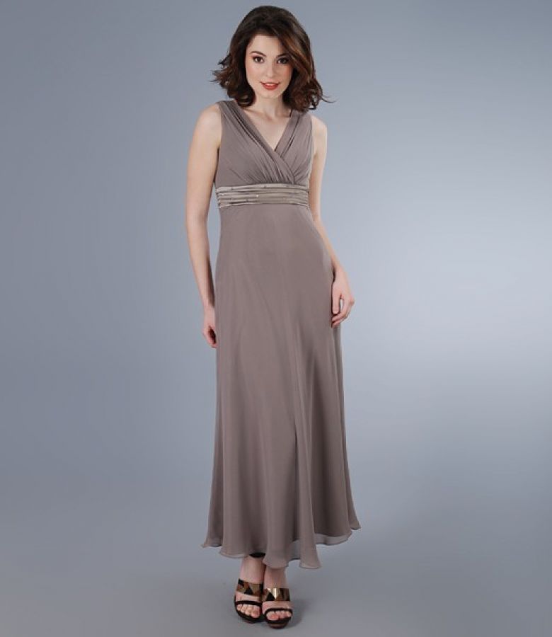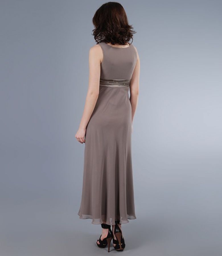 Long veil dress, no sleeves, overlapped chest with folds, deep neck-cut. Satin belt under breast, ruffled, with front and back crystals. Concealed left side zip fastening.