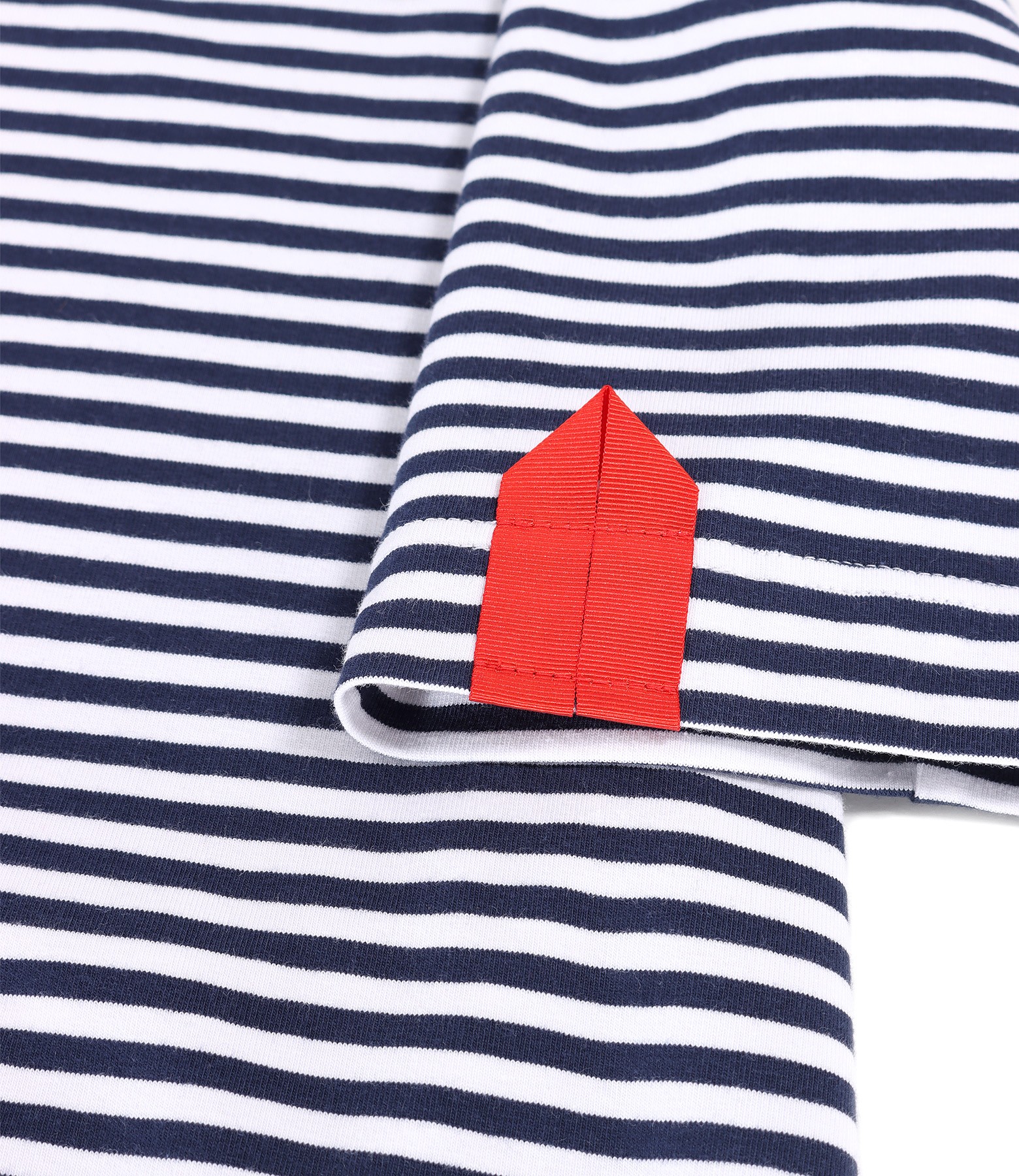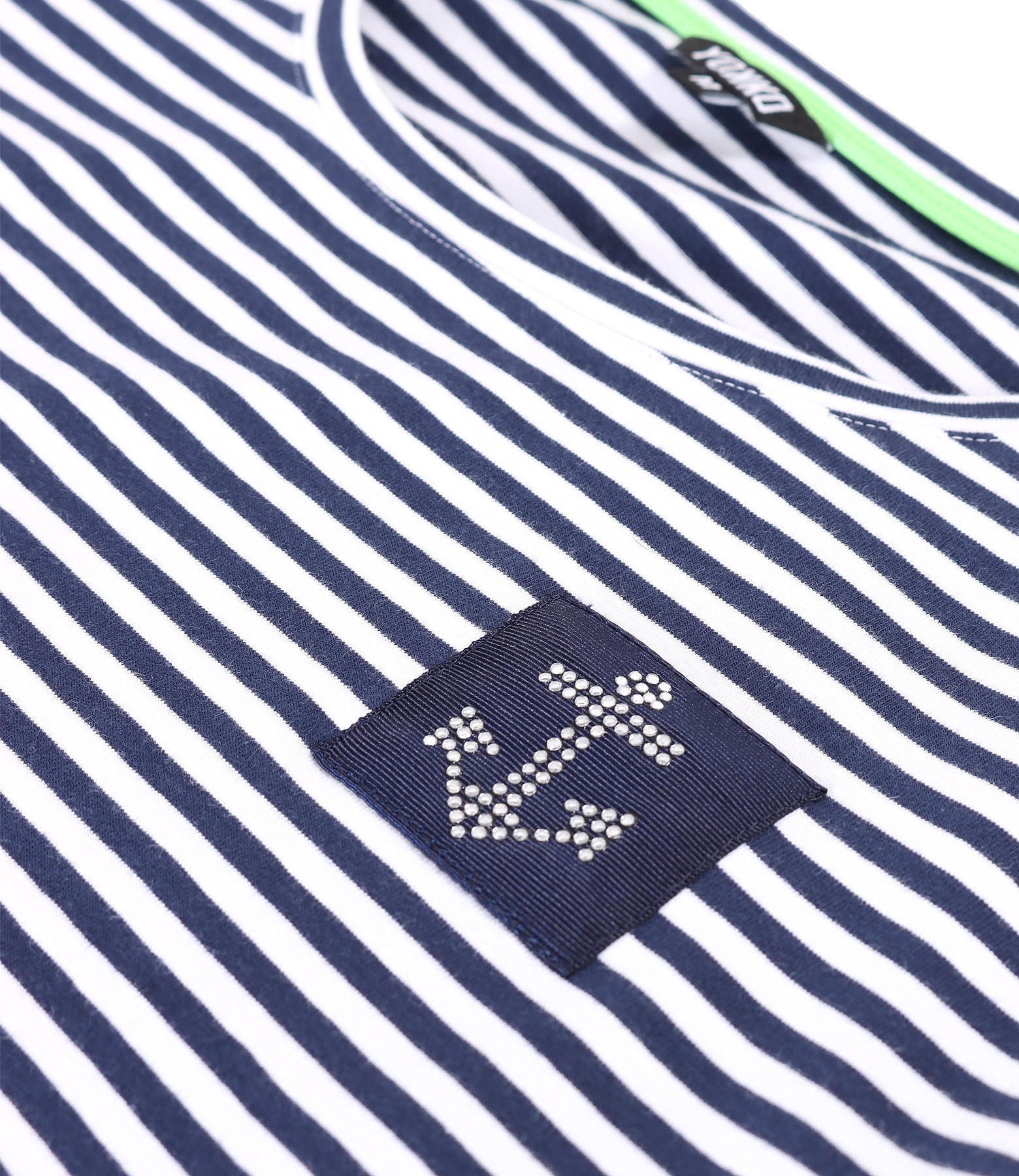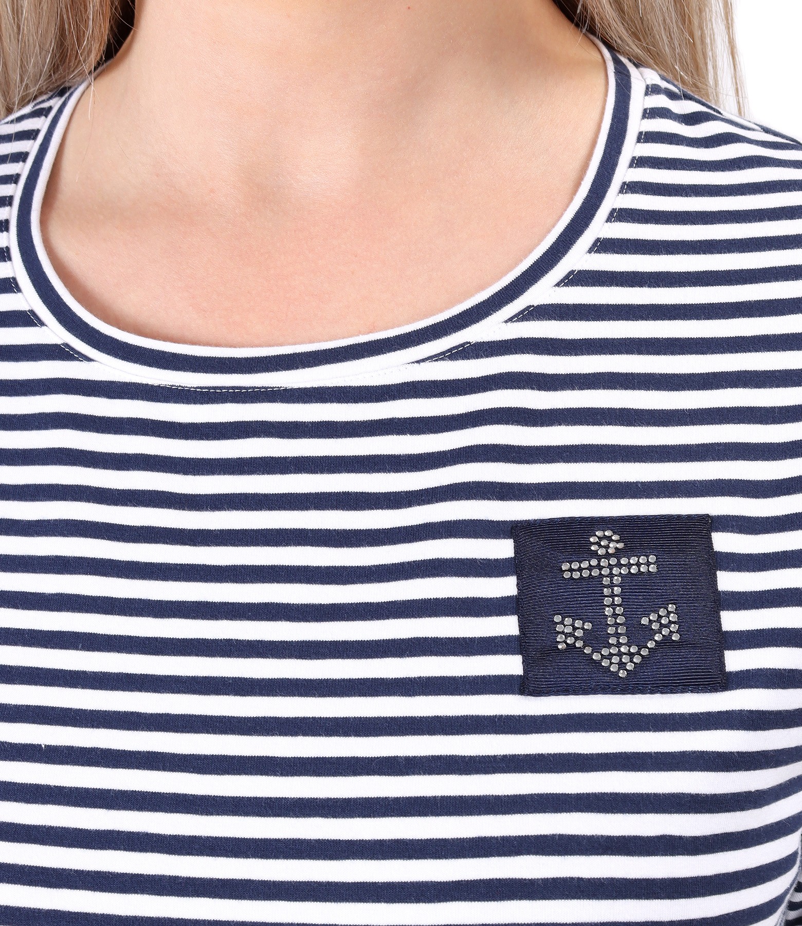 Long dress in striped elastic jersey, unlined, with short sleeves, round neckline with decorative application in the shape of an anchor and with side slits. Without closing system.
