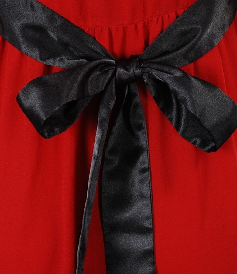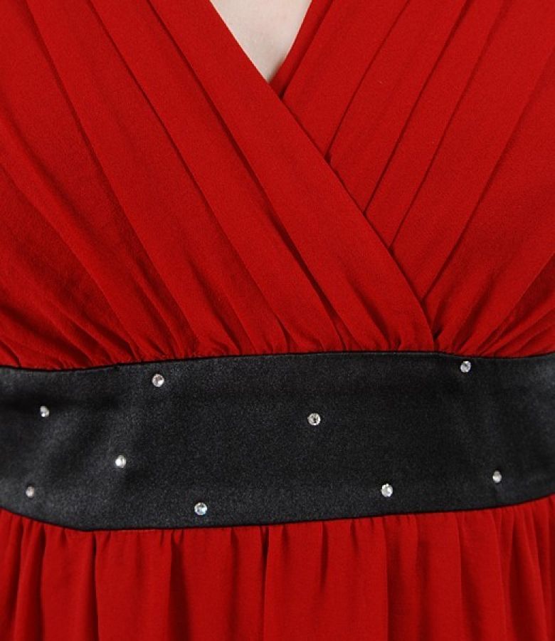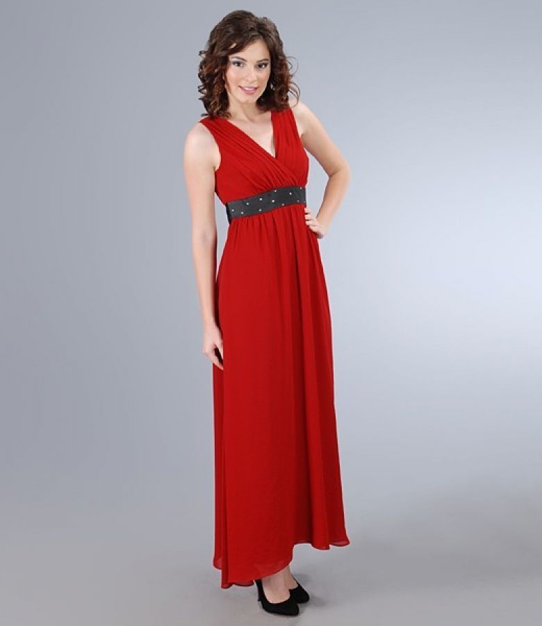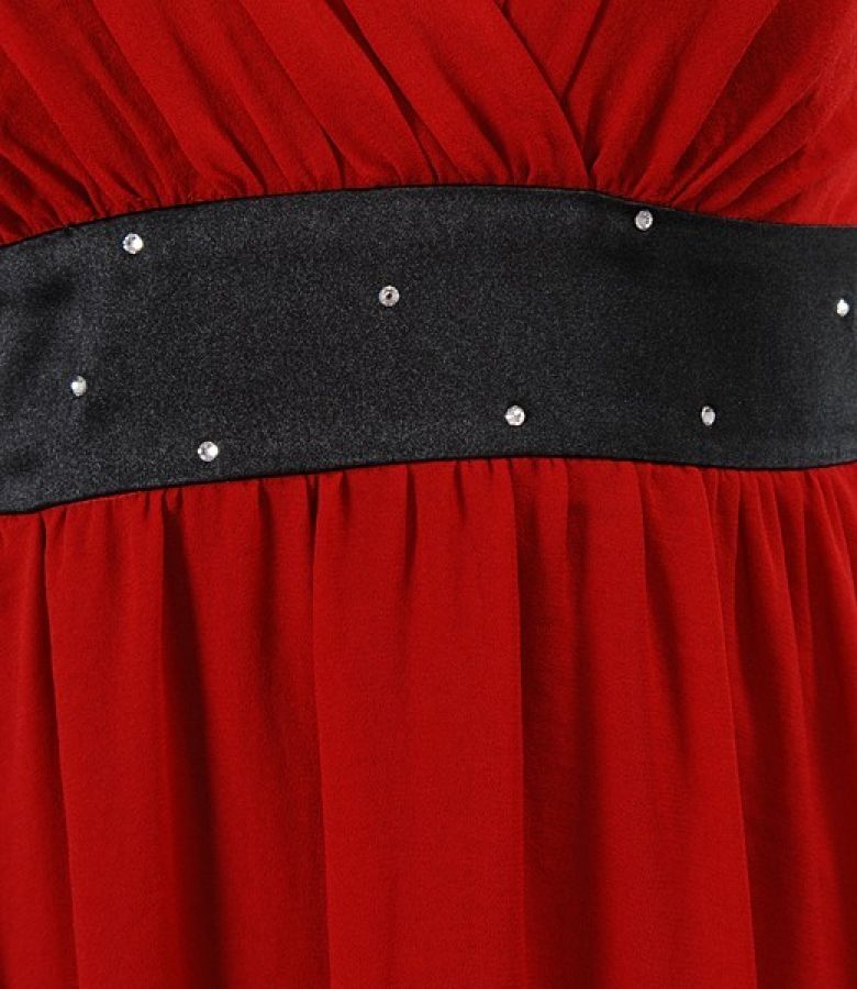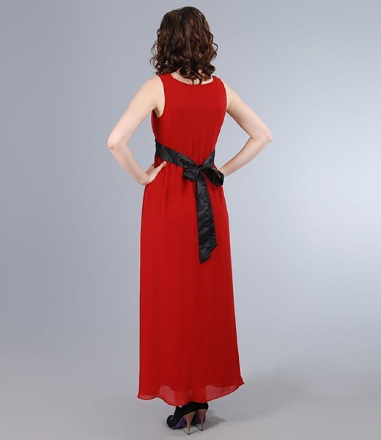 Long dress in red veil, no sleeves, overlapped chest with folds, sharp neck-cut in front. Contrast satin belt under bust, with applied crystal front and back and tight cords in bow on the back. Concealed left side zip fastening.