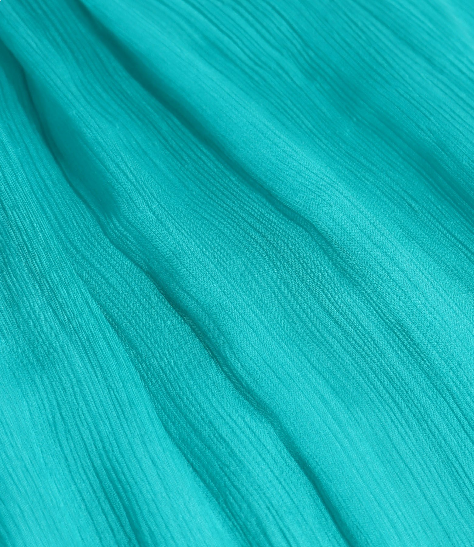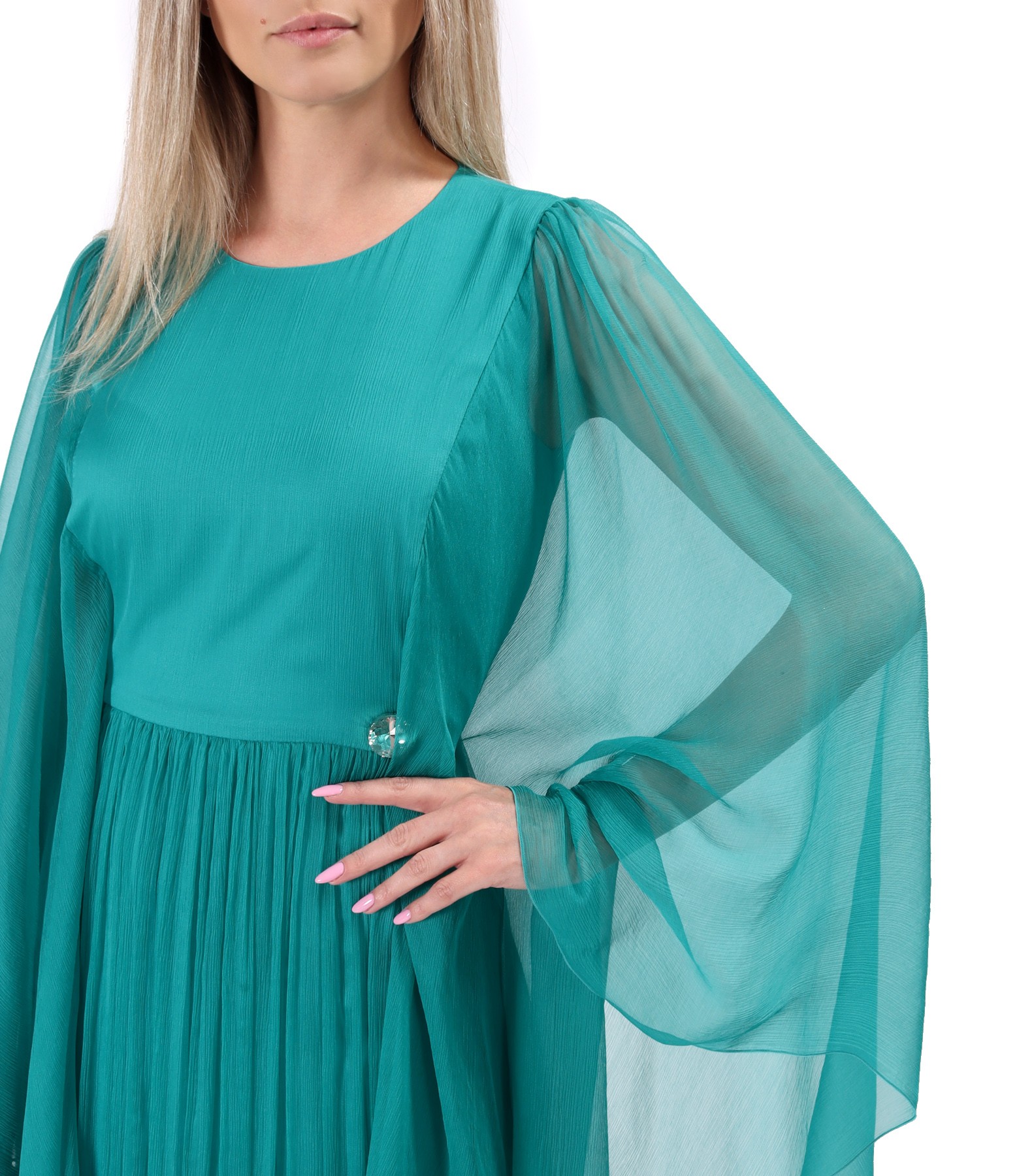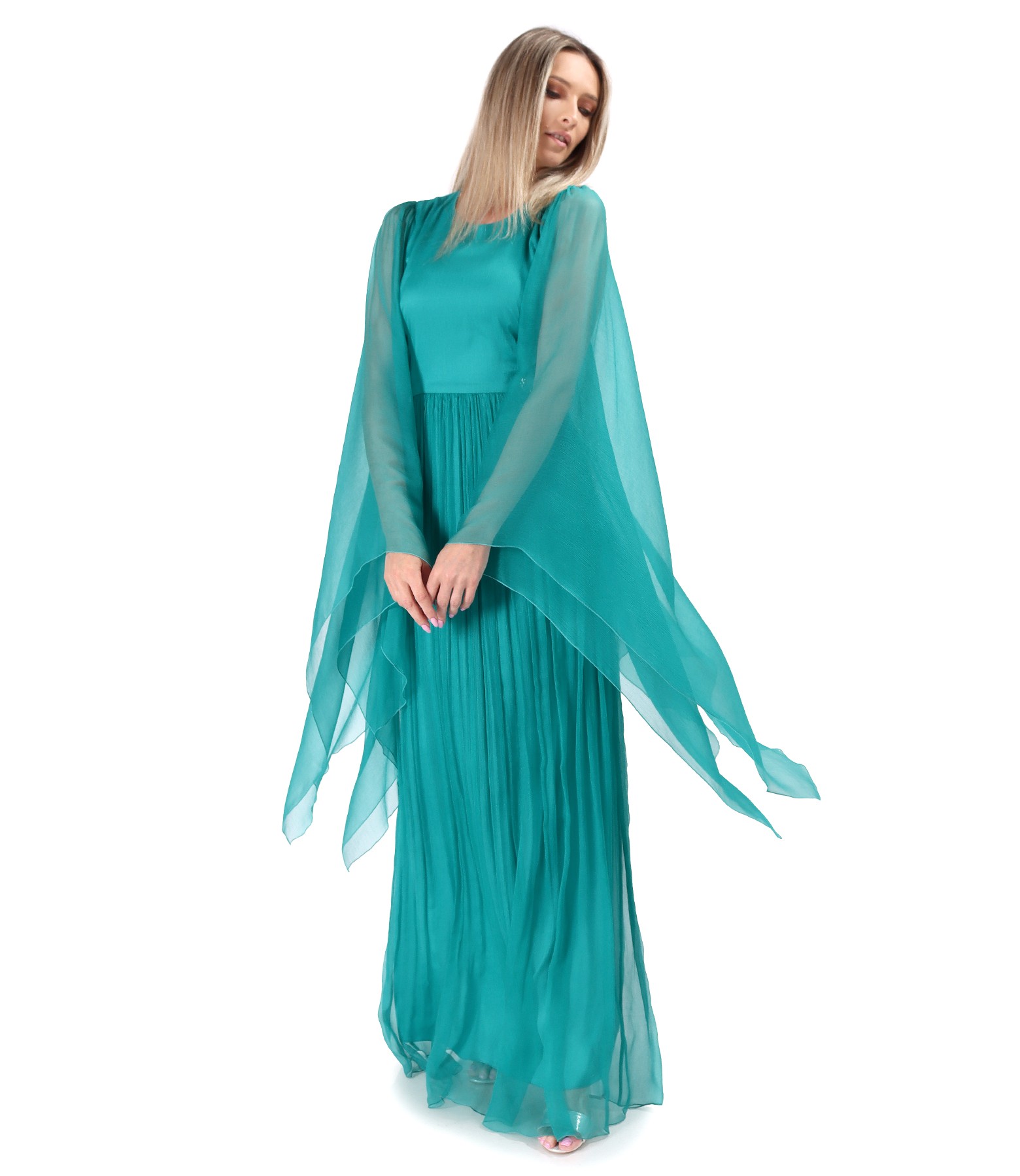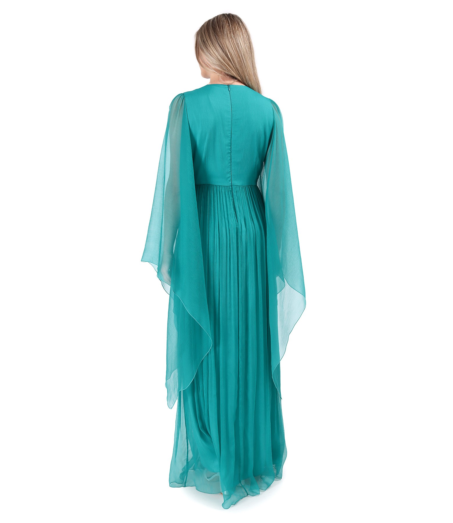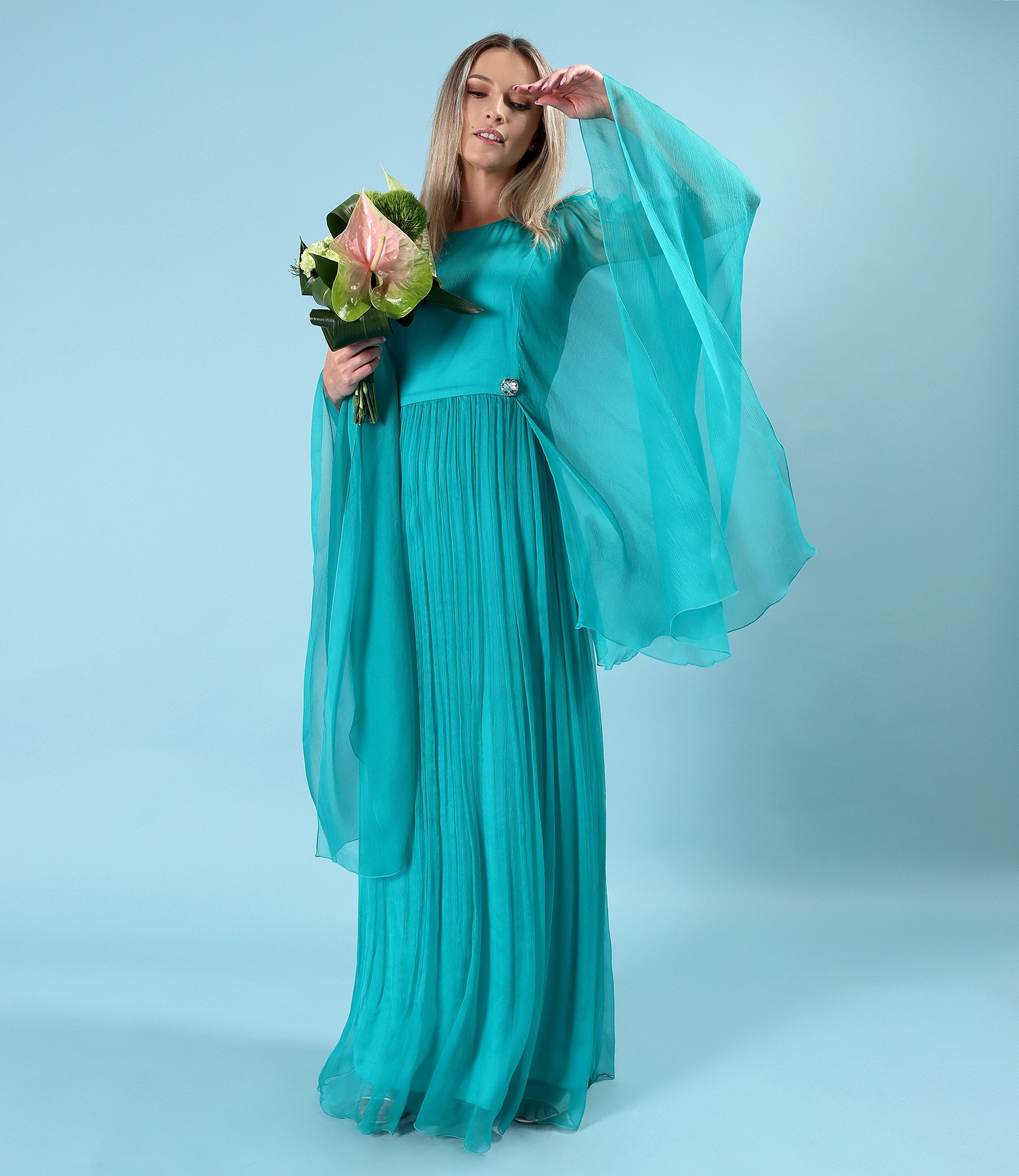 Long dress made of natural silk veil, doubled with satin, with a round neckline, long, ample butterfly-type sleeves and crystal at the waist. It closes with a hidden zipper in the middle of the back.