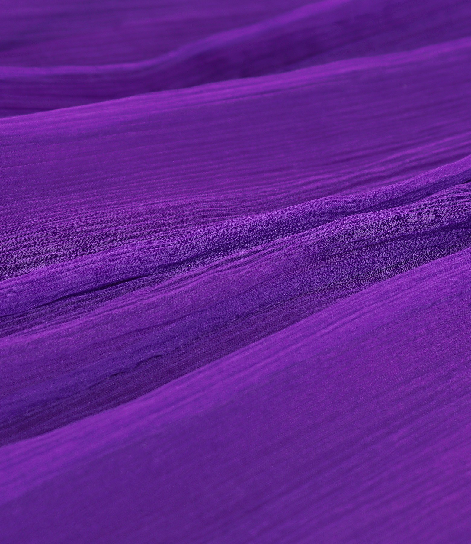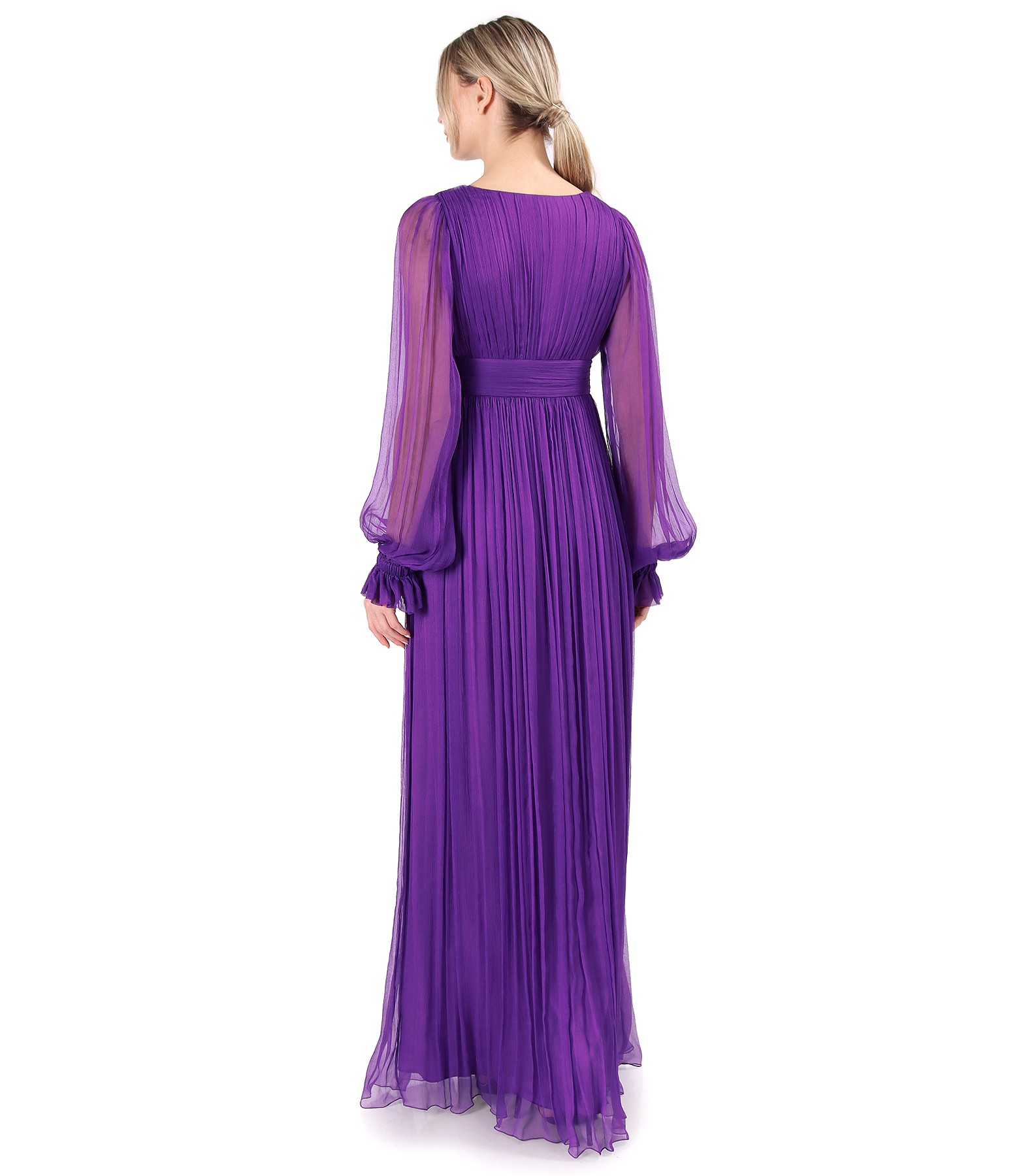 Long dress made of natural silk veil, doubled with satin, fringed on the bust, long wrinkled sleeves, and pearl sewn at the waist. It closes with a hidden zipper on the left side.