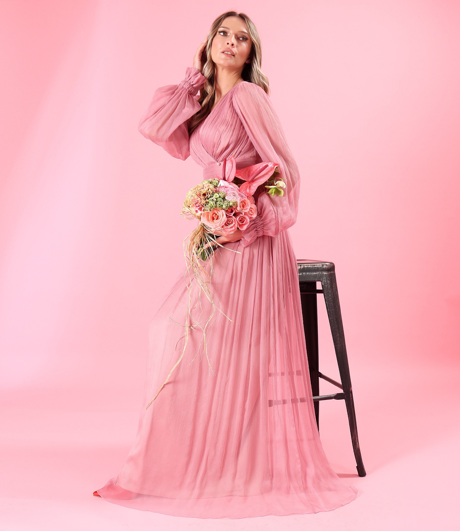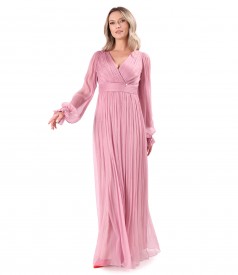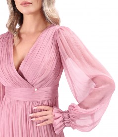 Long dress made of natural silk veil, doubled with satin, fringed on the bust, long wrinkled sleeves, and pearl sewn at the waist. It closes with a hidden zipper on the black.