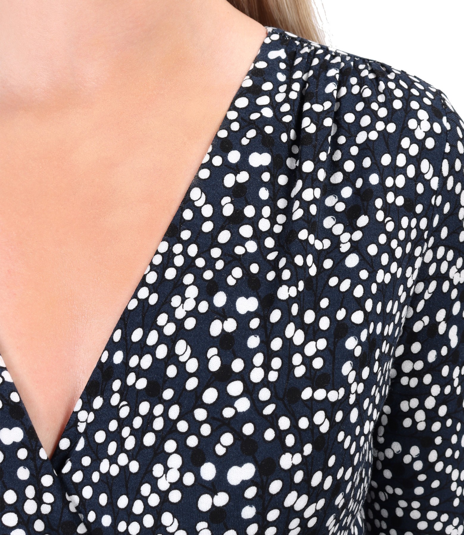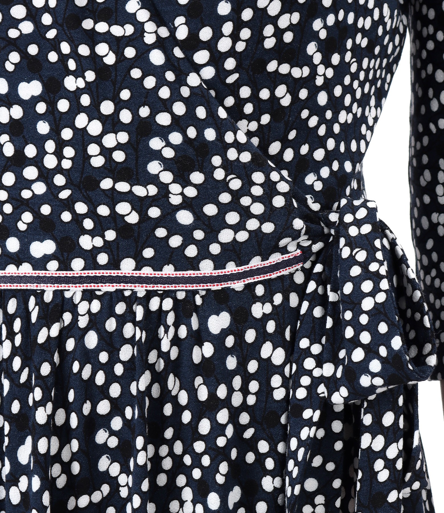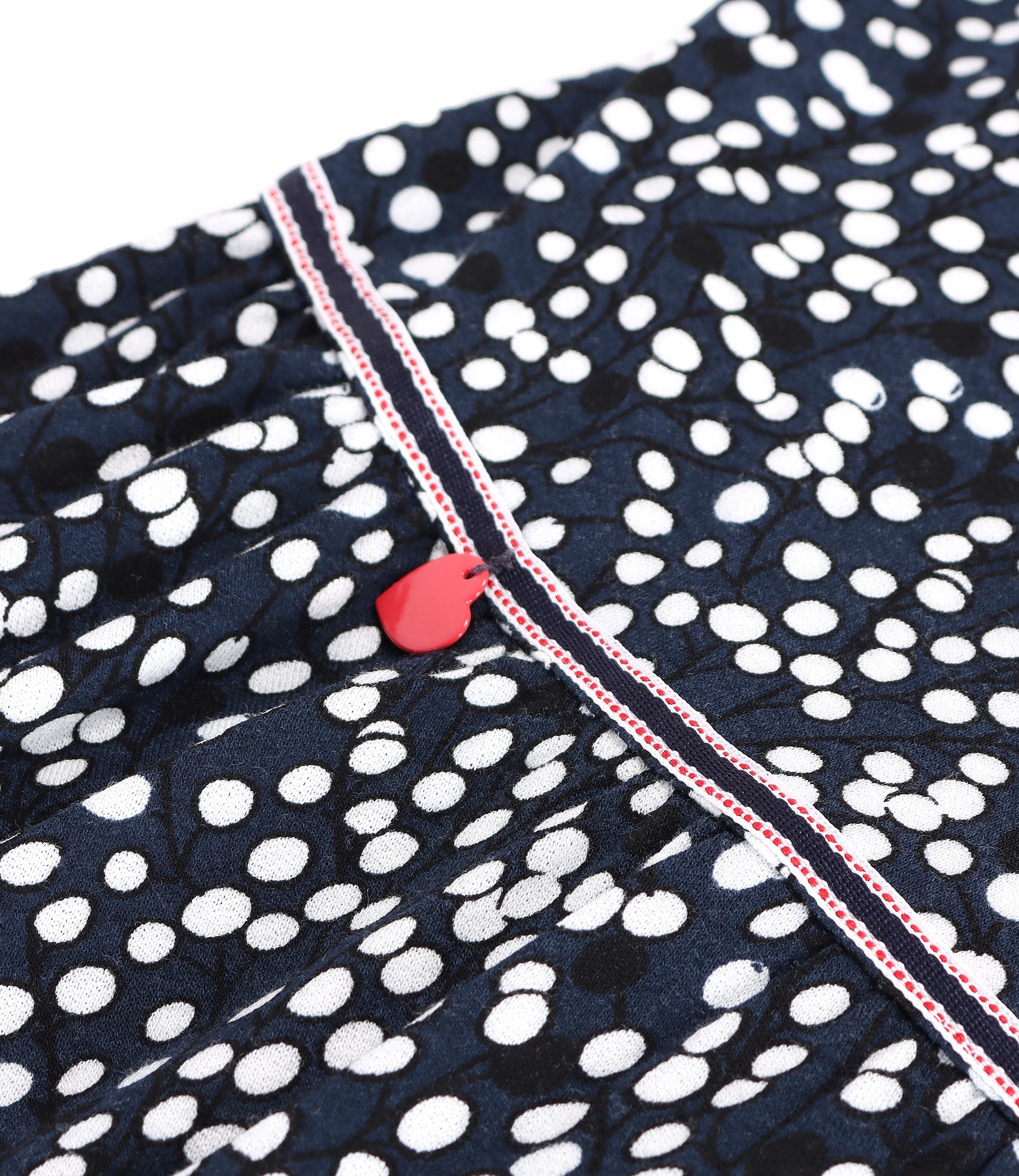 Long dress made of viscose elastic jersey printed with dots and twigs, doubled at the top with elastic jersey, with 3/4 sleeves and with rips band at the waist, decorated with a metallic heart. It closes with a drawstring at the waist.