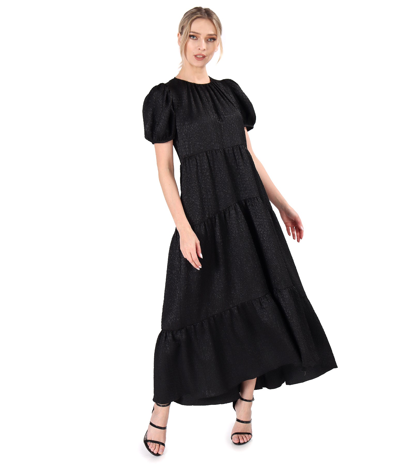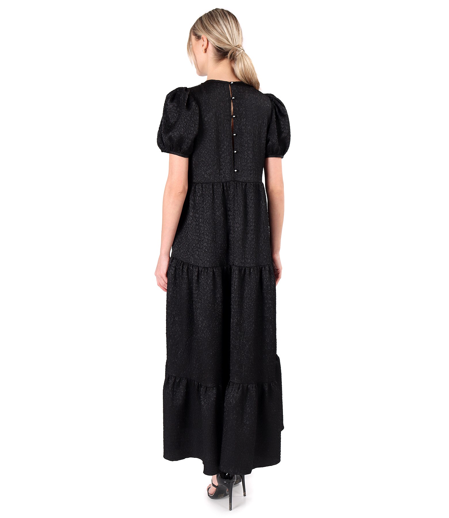 Long dress with asymmetric ruffles, unlined, round neckline, and short sleeves. It closes with 6 buttons on the middle back.