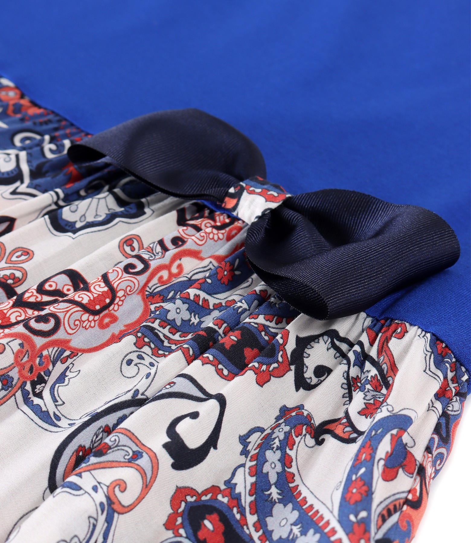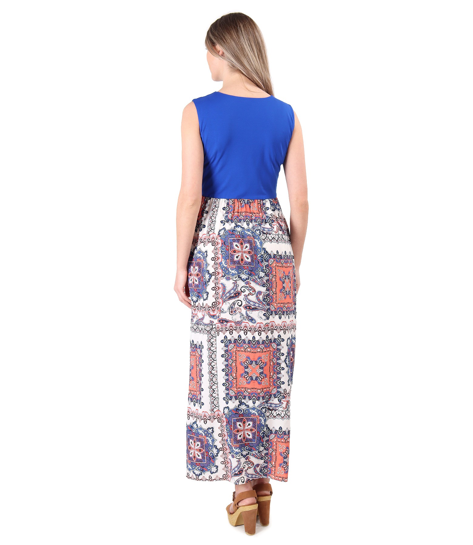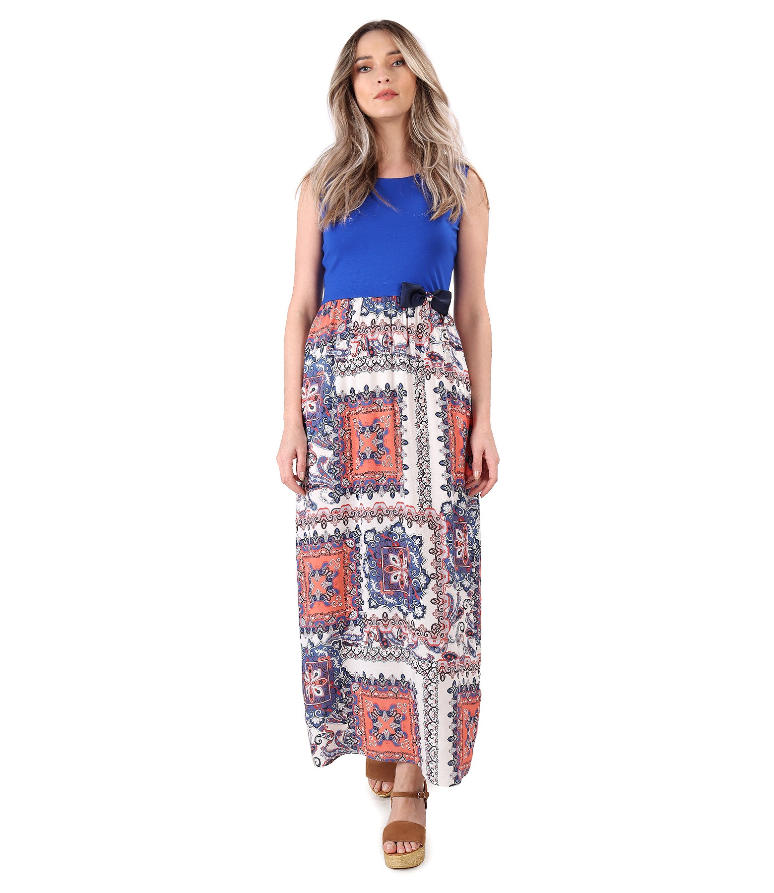 Long dress with printed viscose skirt, unlined, with the top made of plain elastic jersey, padded, without sleeves, and with decorative rips bow at the waist. Print position varies per product.