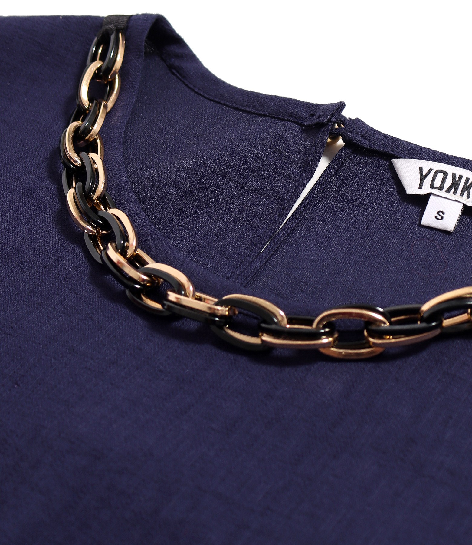 Elegant long dress made of viscose fabric, with a slit on the left side with golden tassels at the end and a round neckline with a decorative chain. It closes with a button on the middle back.