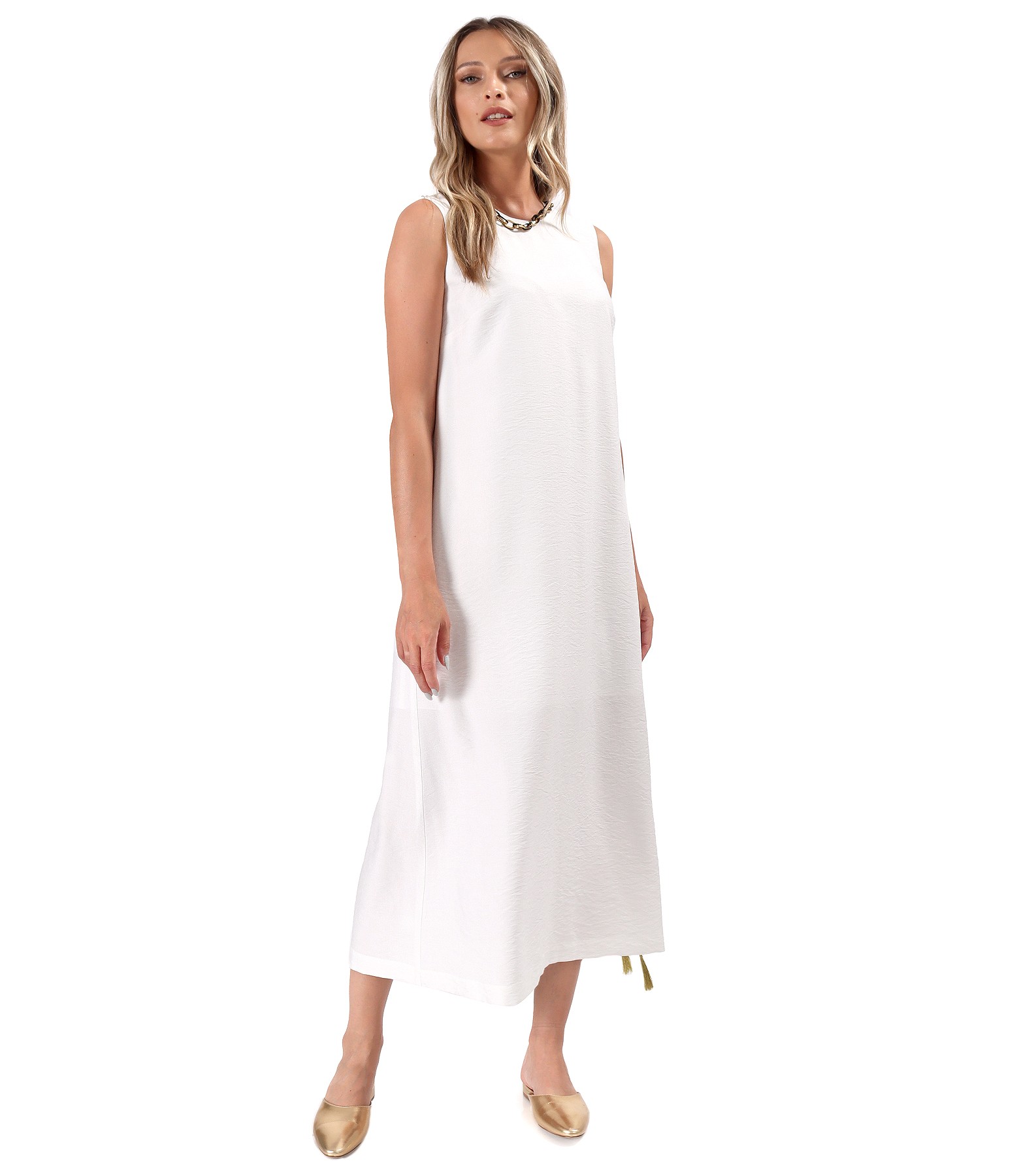 Elegant long dress made of viscose fabric, doubled with viscose, with a slit on the left side with golden tassels at the end and a round neckline with a decorative chain. It closes with a button on the middle back.
