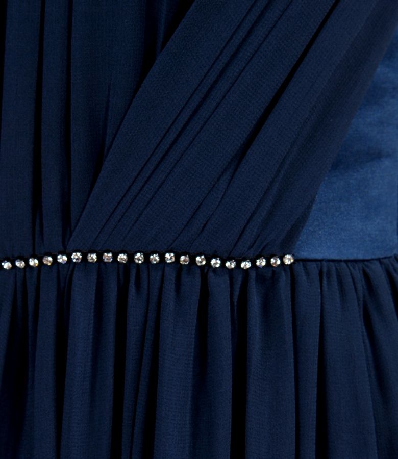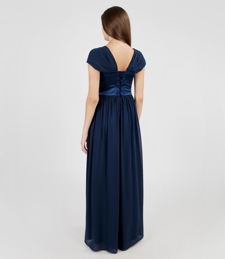 Long evening dress from veil and satin with crystals trim (Dark blue), size
