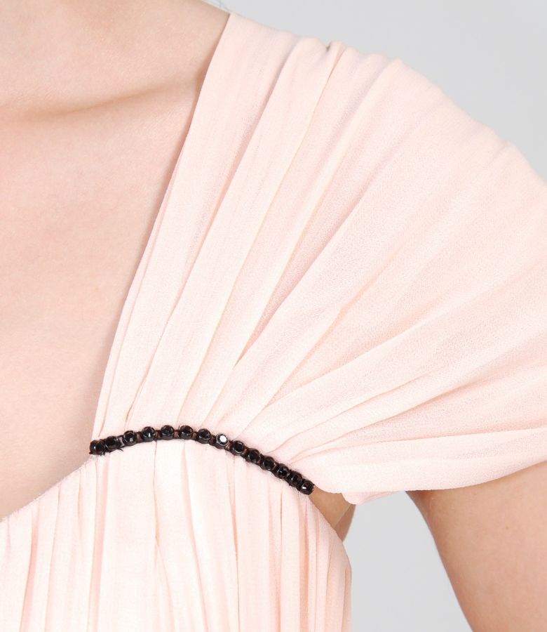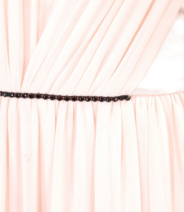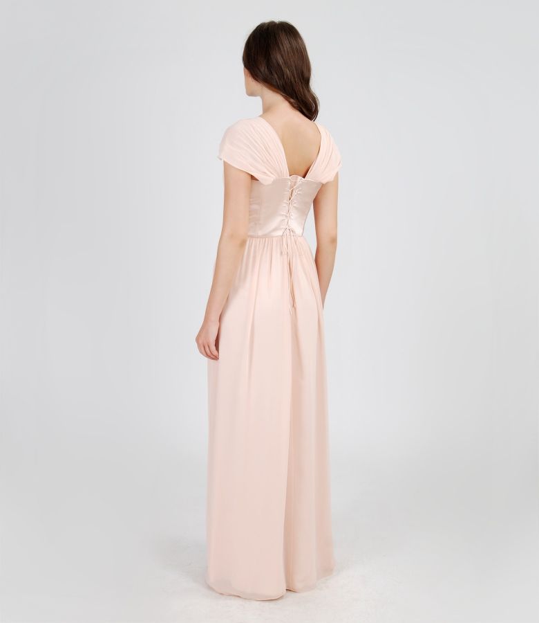 Long evening dress from veil and satin with crystals trim (Nude pink), size