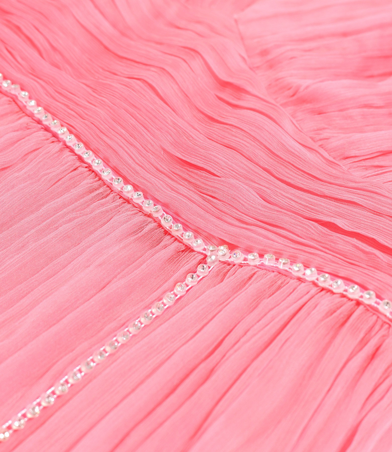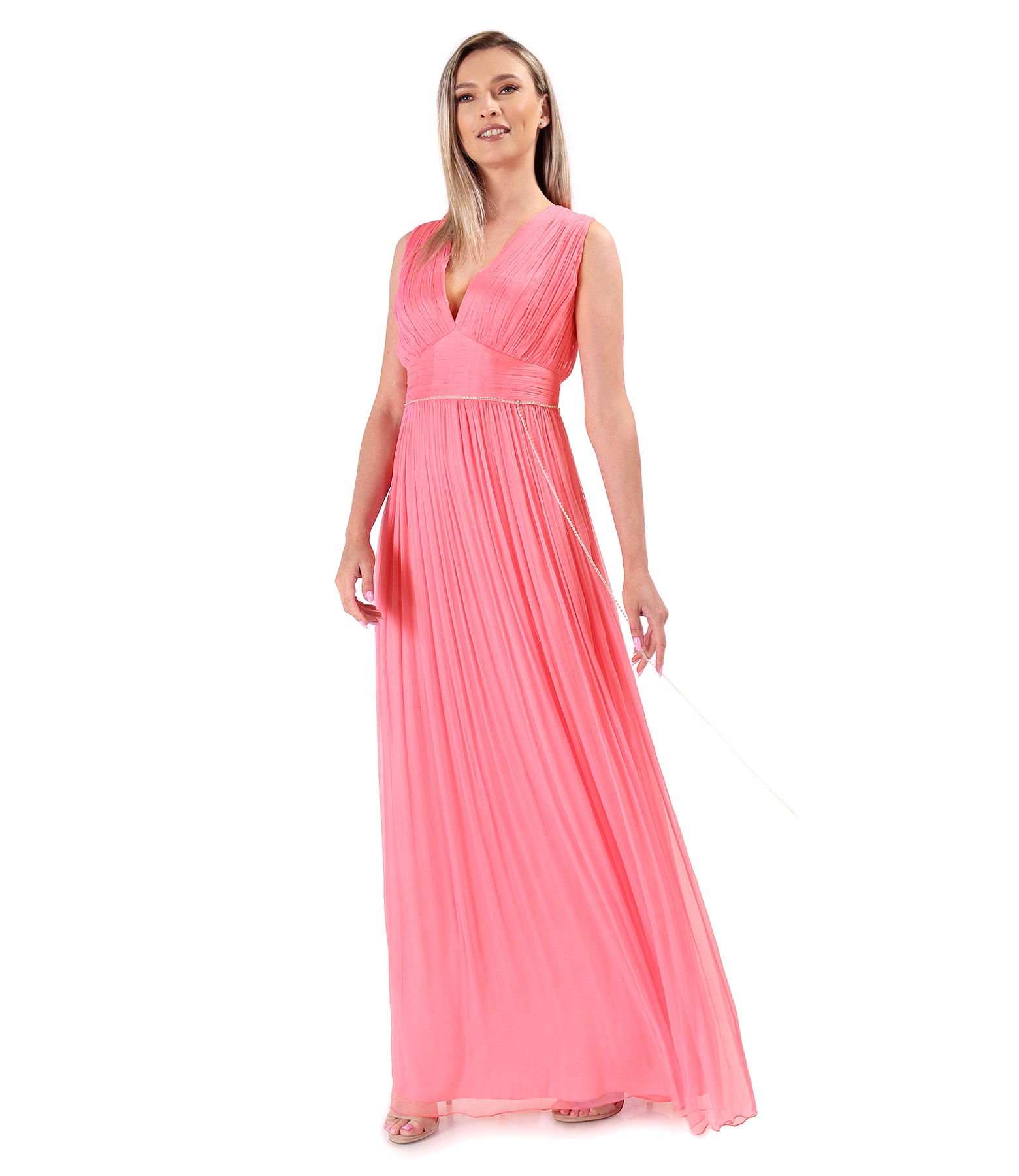 Long dress made of natural silk veil, doubled with satin, with a deep V-neckline, without sleeves, and with crystal appliqué at the waist. It closes with a hidden zipper in the middle of the back.