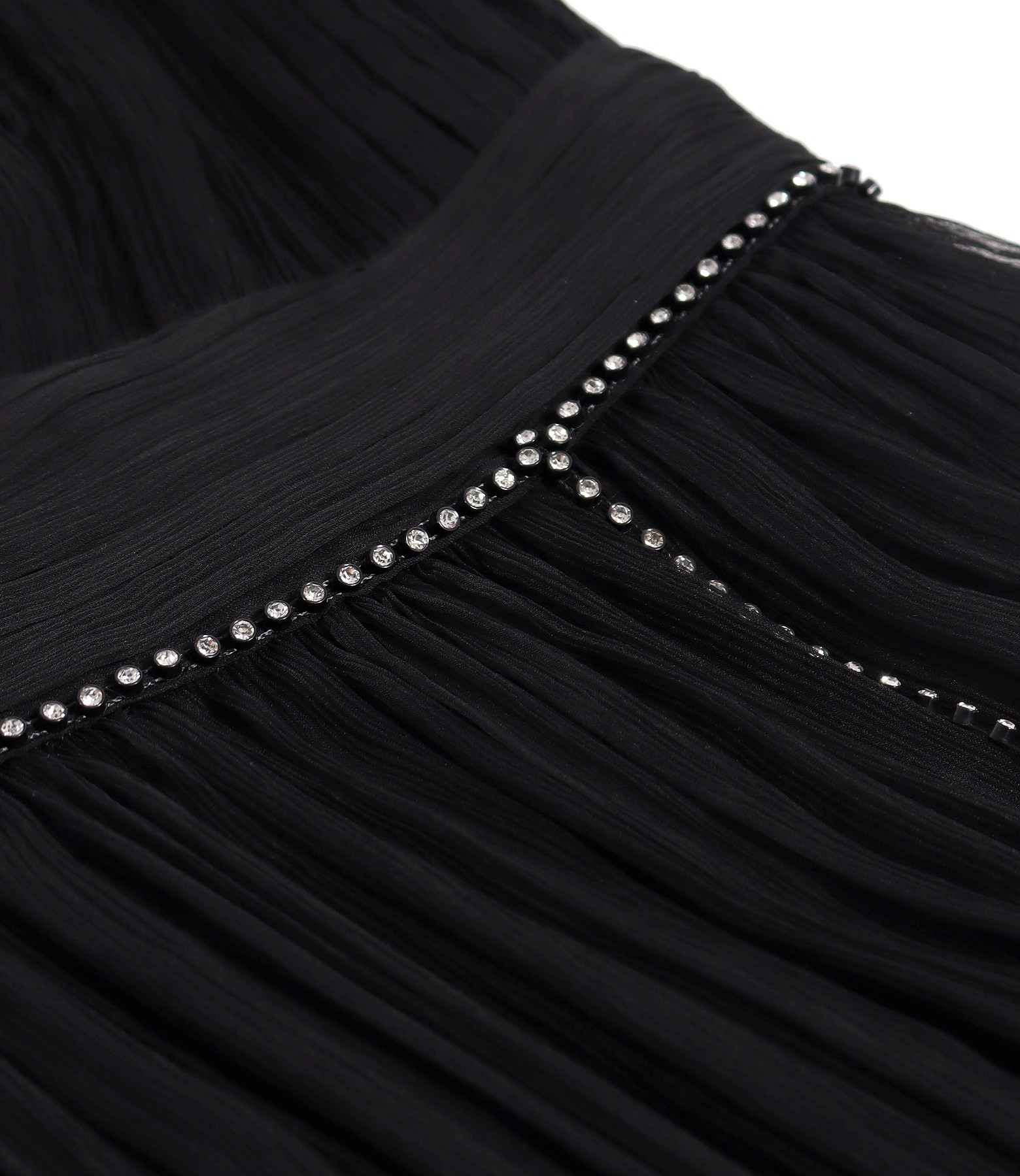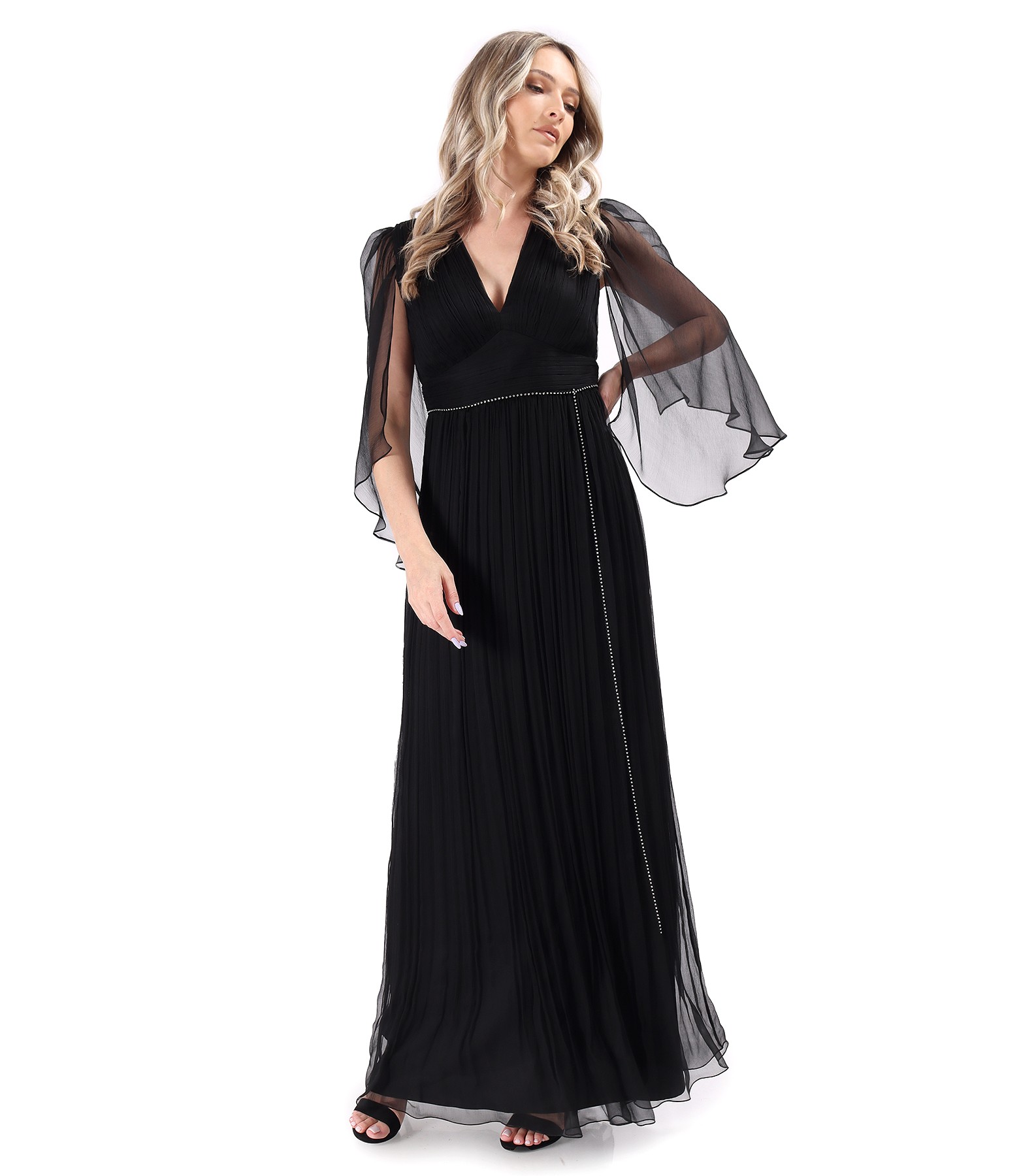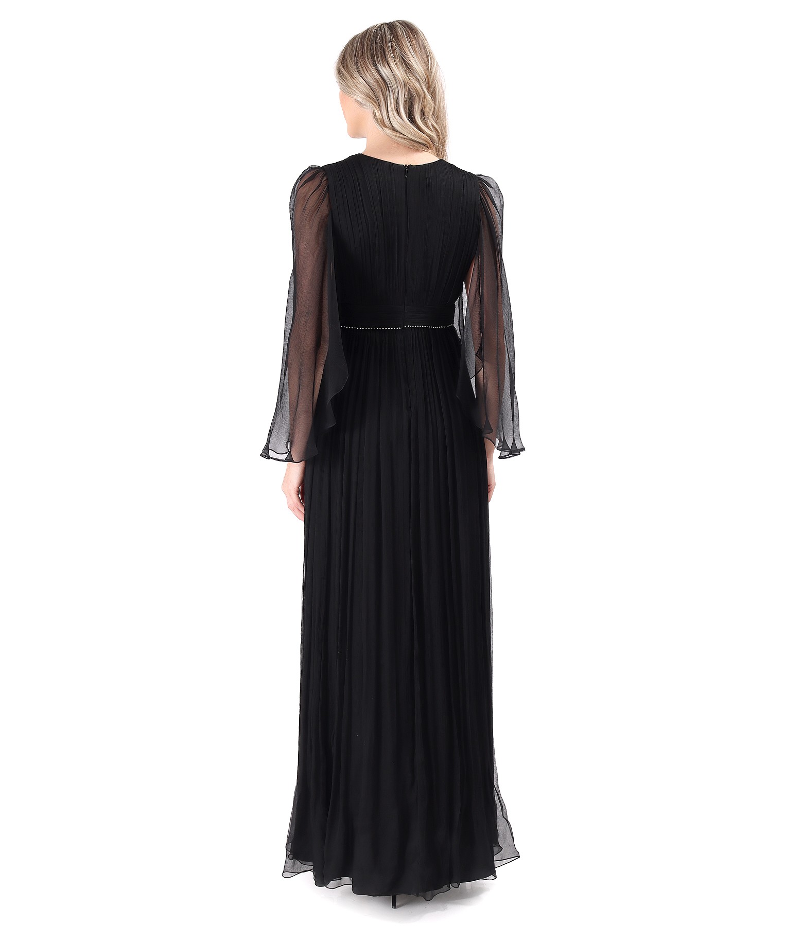 Long dress made of natural silk voile, doubled with satin, voile sleeves, and a crystal cord at the waist. It closes with a hidden zipper in the middle of the back.