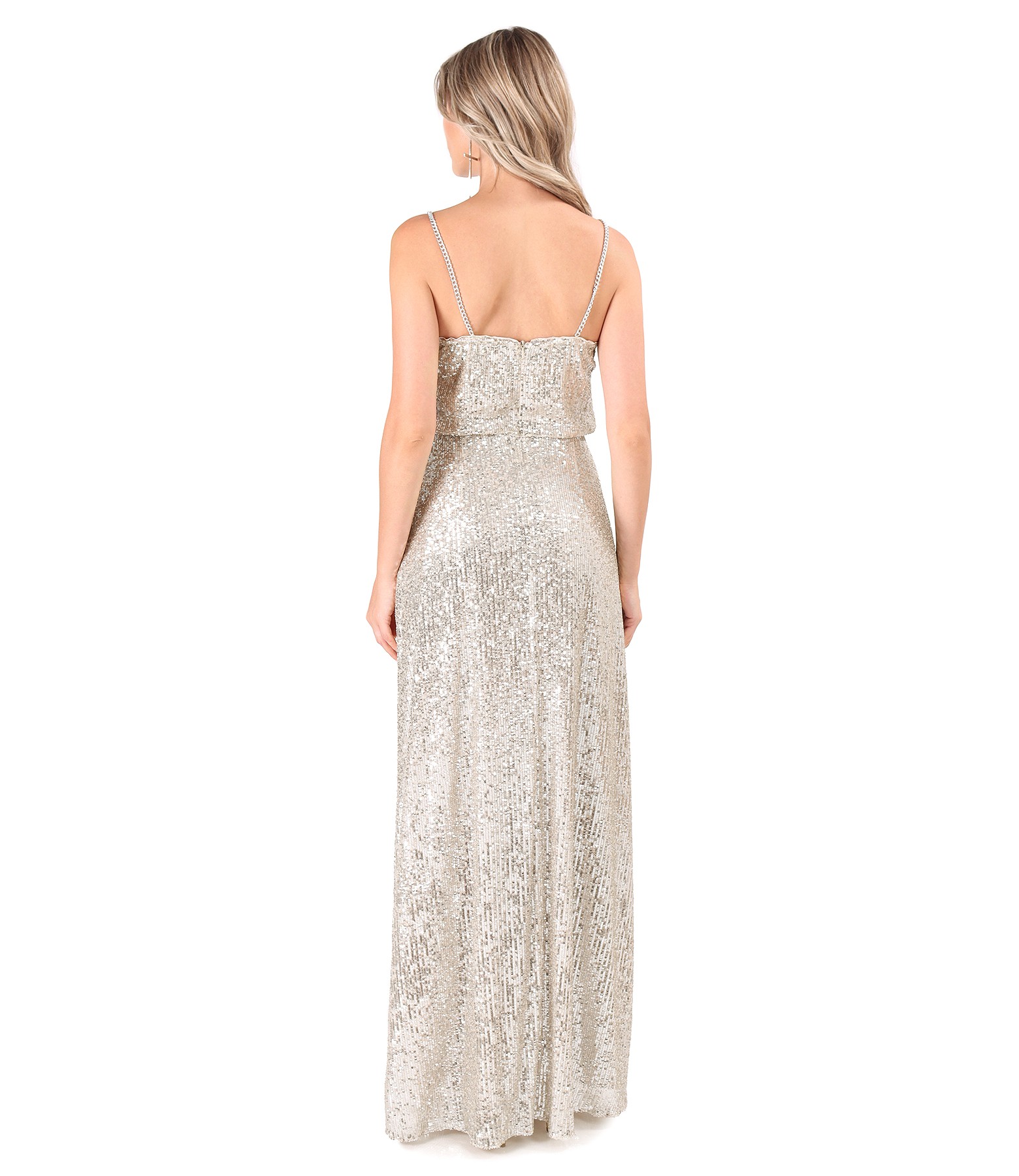 Long evening dress made of sequins with chain straps, padded with satin. It closes with a hidden zipper on the middle back.
