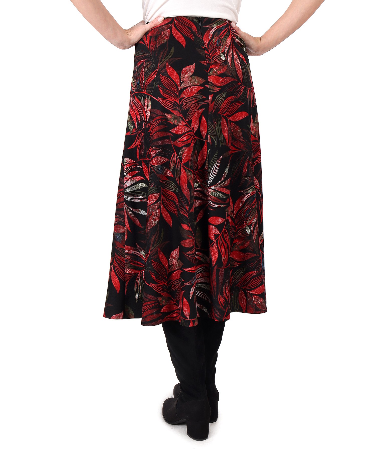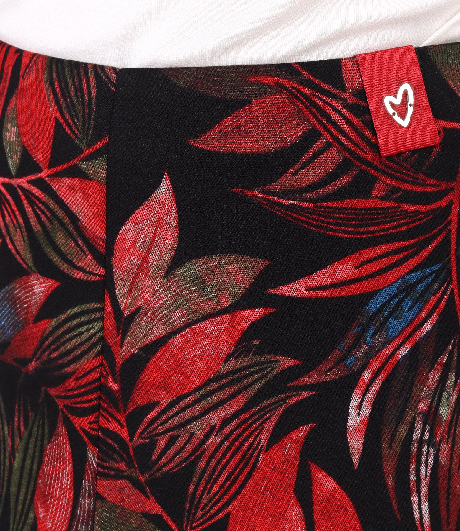 Long flared skirt made of thick elastic jersey printed with floral motifs, unlined and with rips with decorative heart at the waist. Closes with a hidden zipper on the middle back.