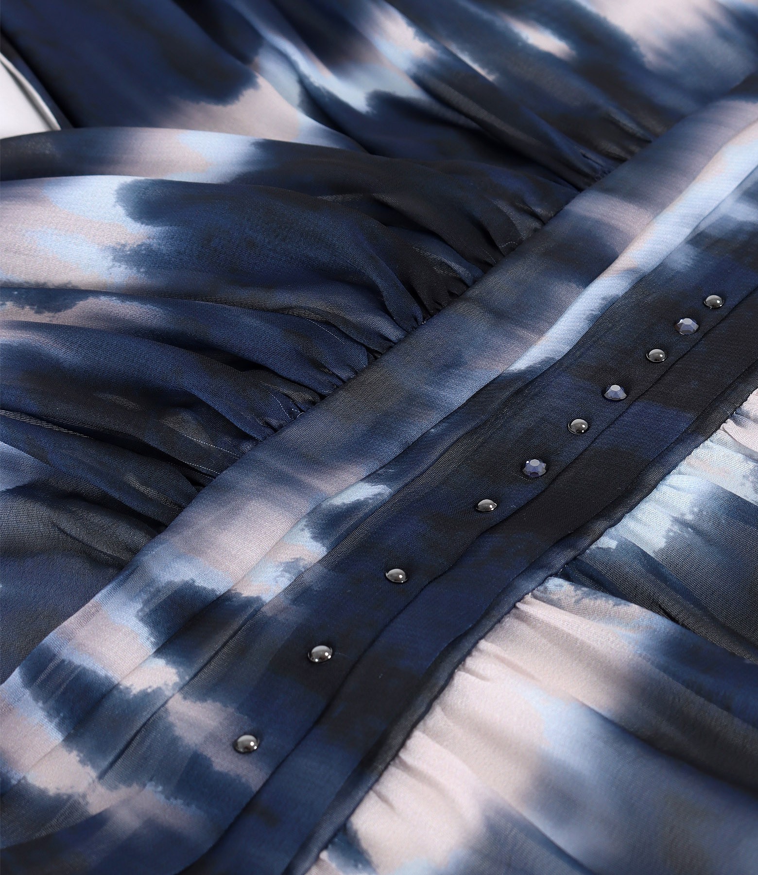 Long gradient veil dress, padded with viscose, wrinkled at the shoulders and with an overlapping chest. It closes with a zipper hidden on the left side.