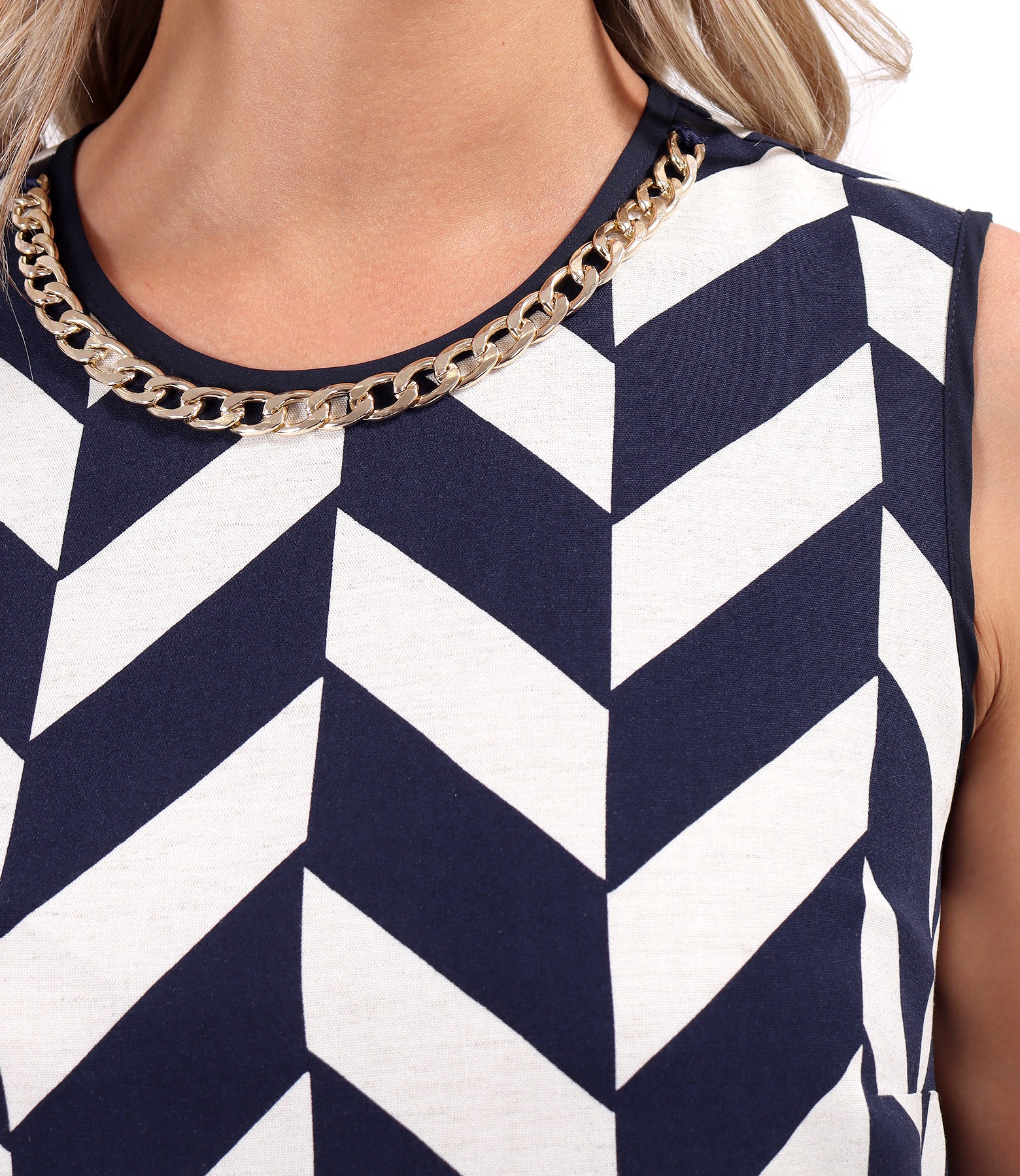 Long dress made of viscose and linen printed with stripes, with a slit on the left side with golden hems at the end and a round neckline with a decorative chain. It closes with a button on the middle back.