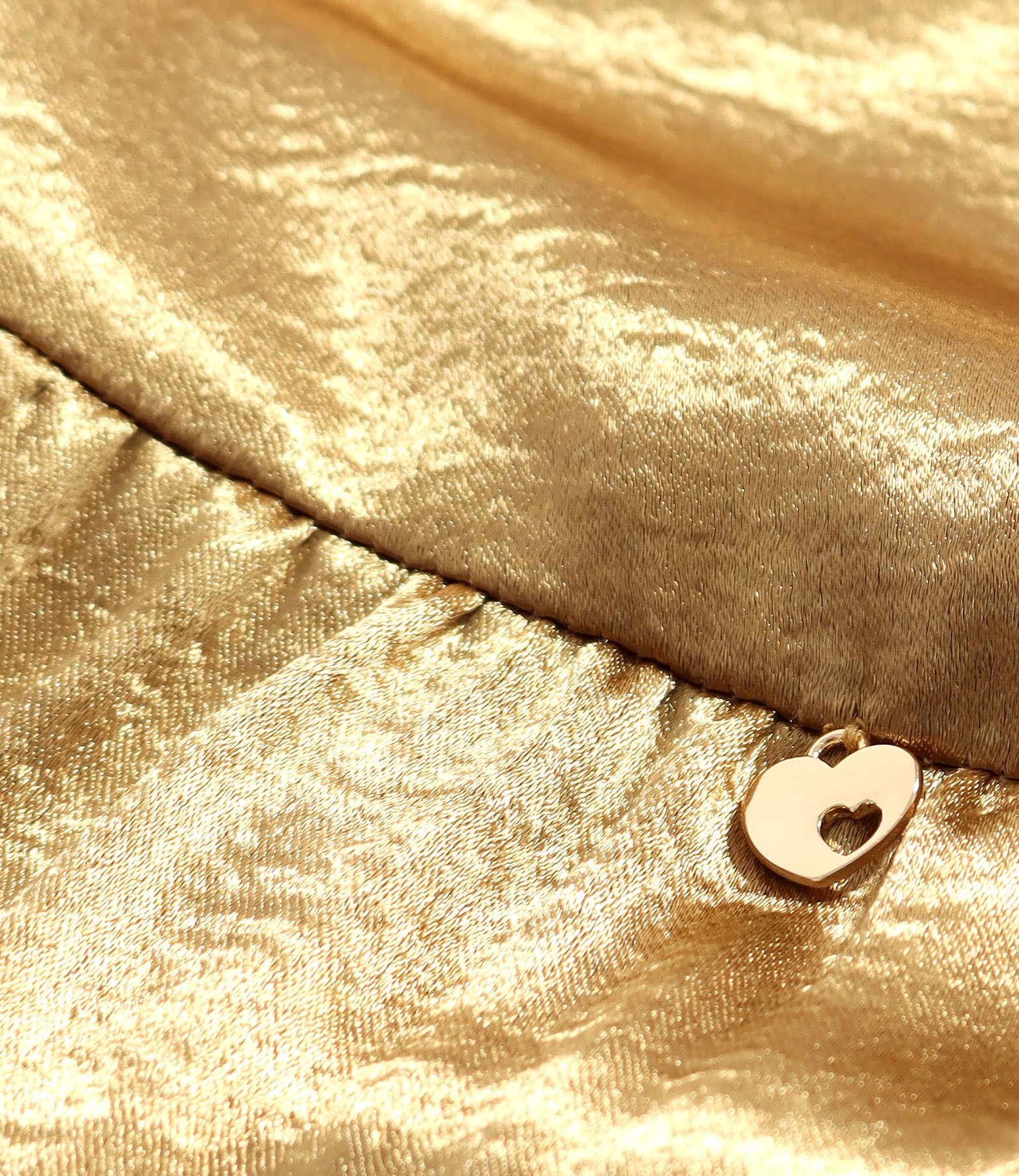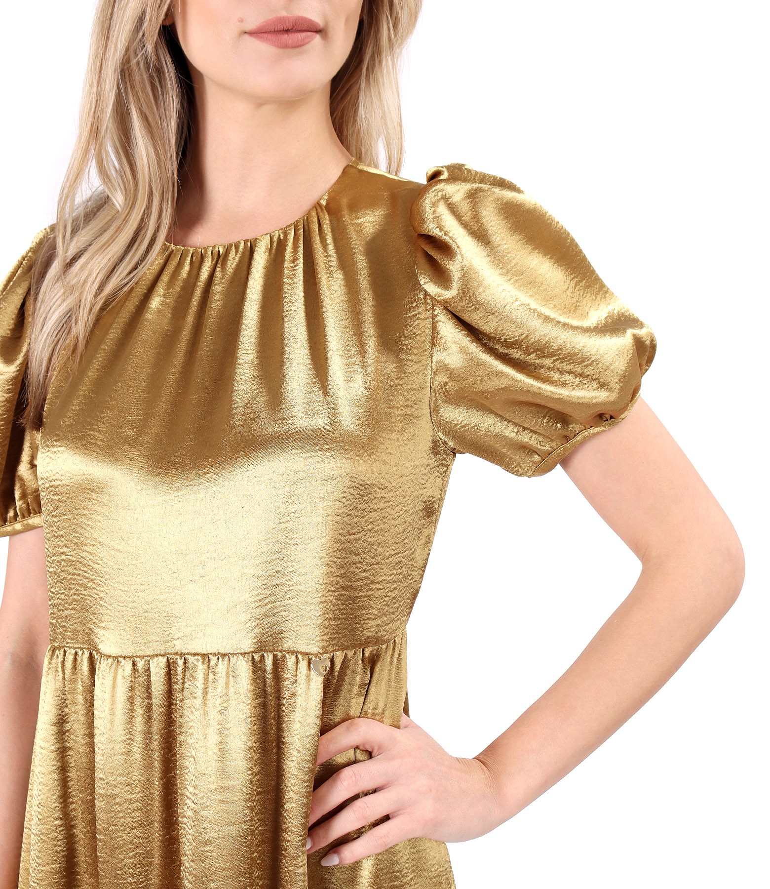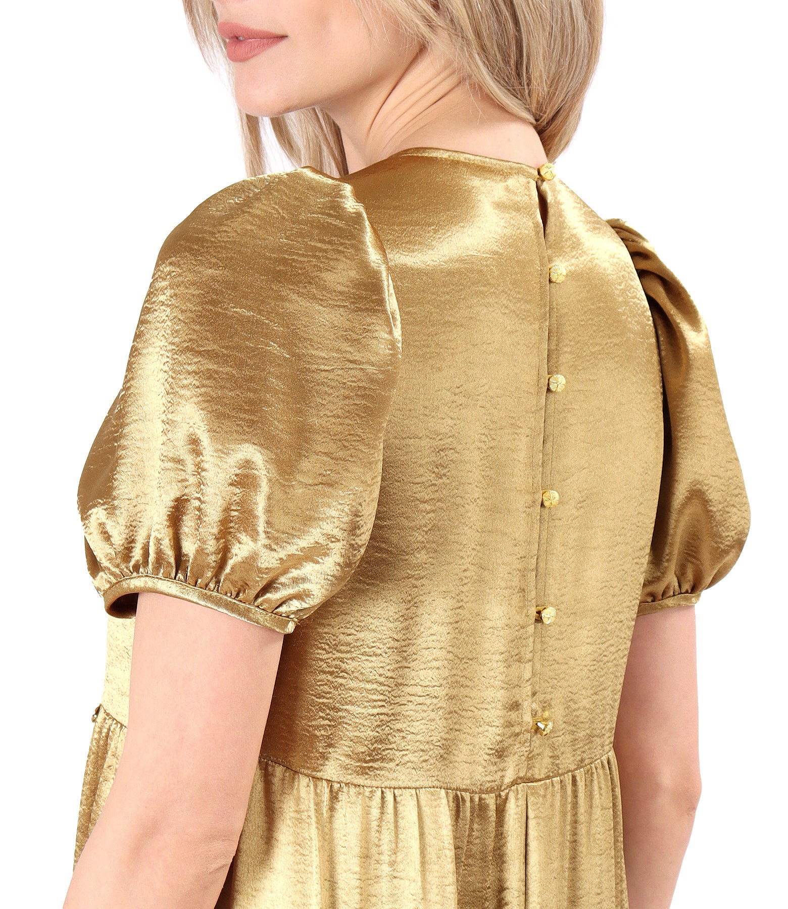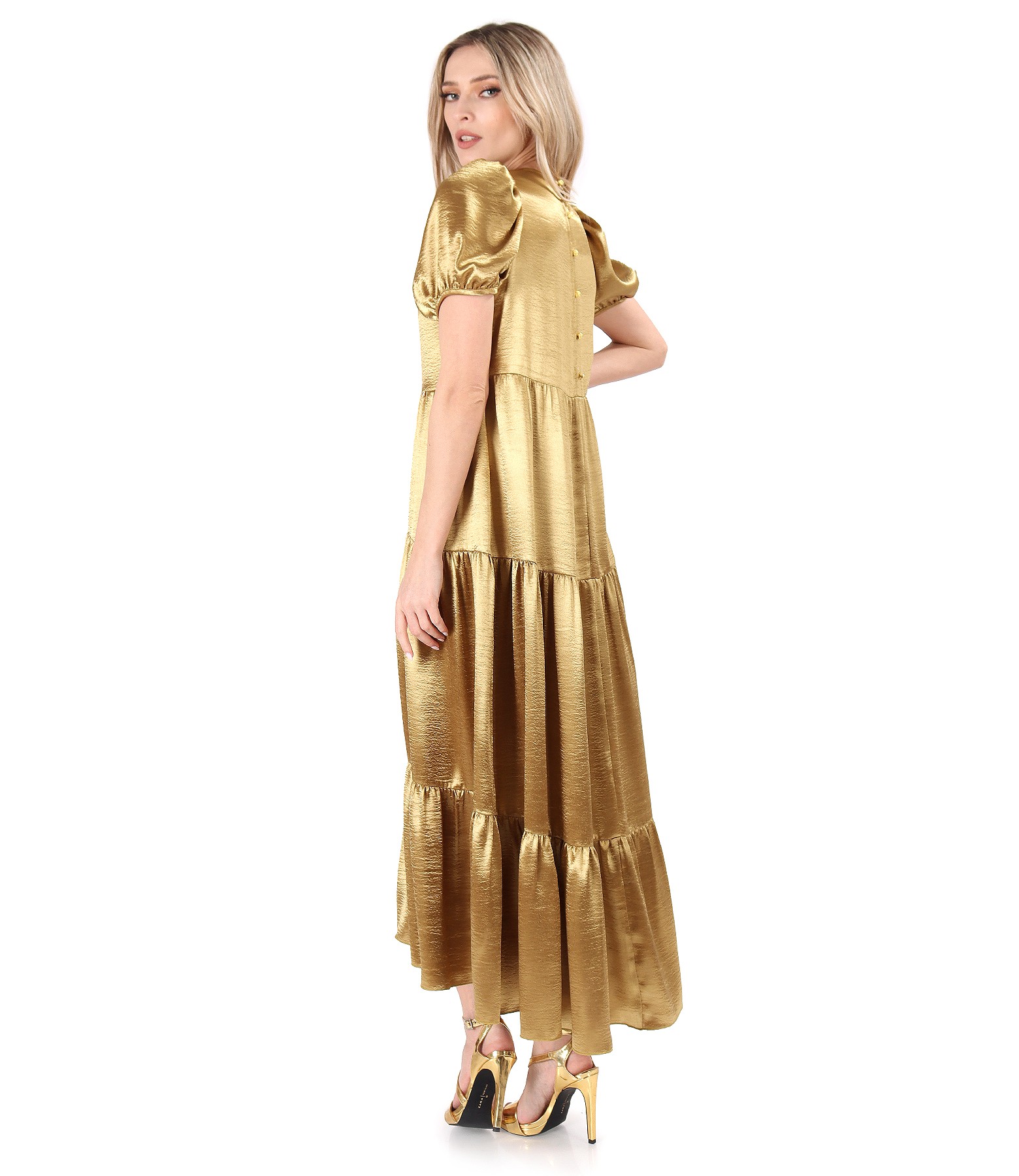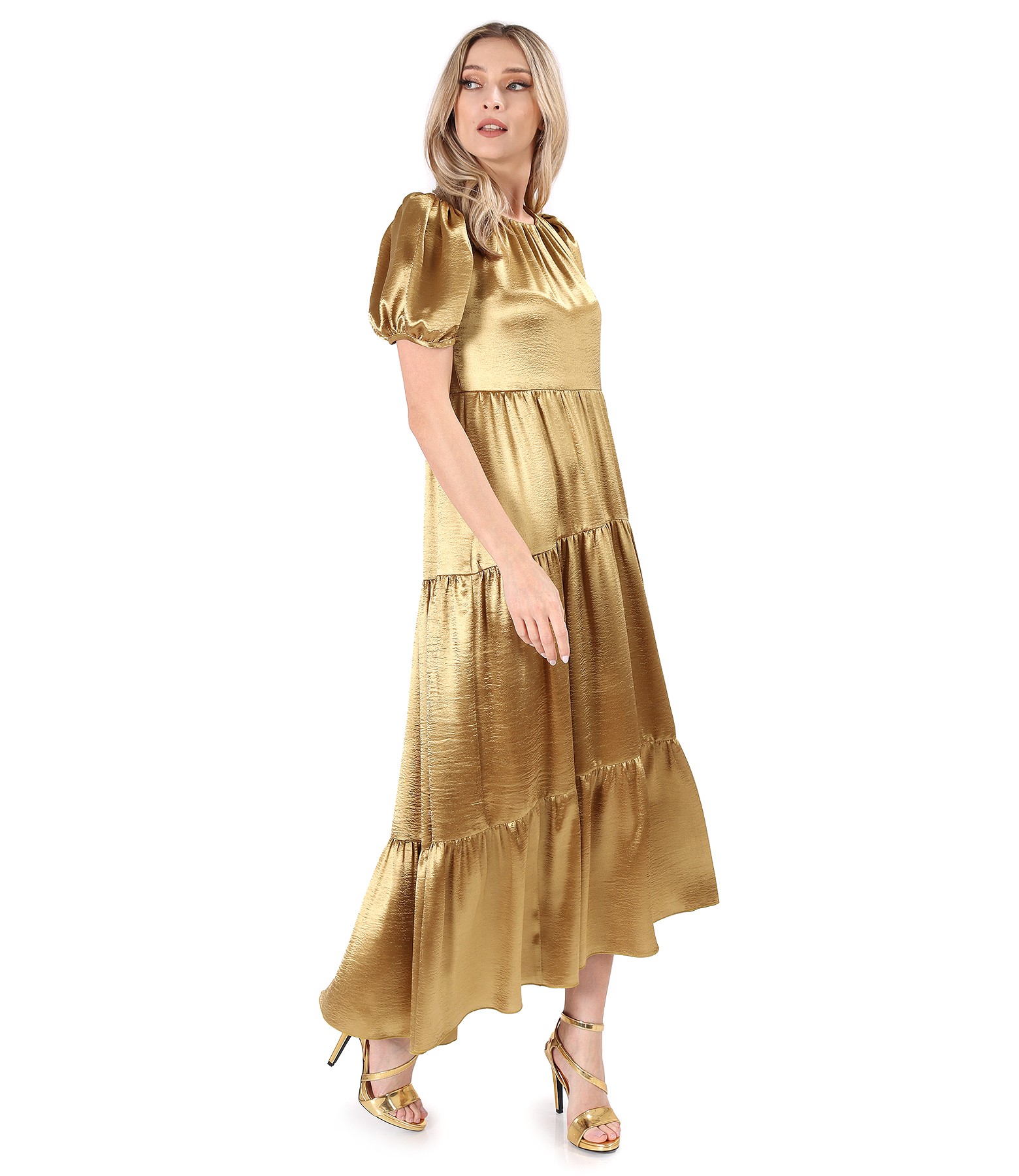 Long satin dress with asymmetric ruffles, unlined, round neckline, and short sleeves. It closes with 6 buttons on the middle back.