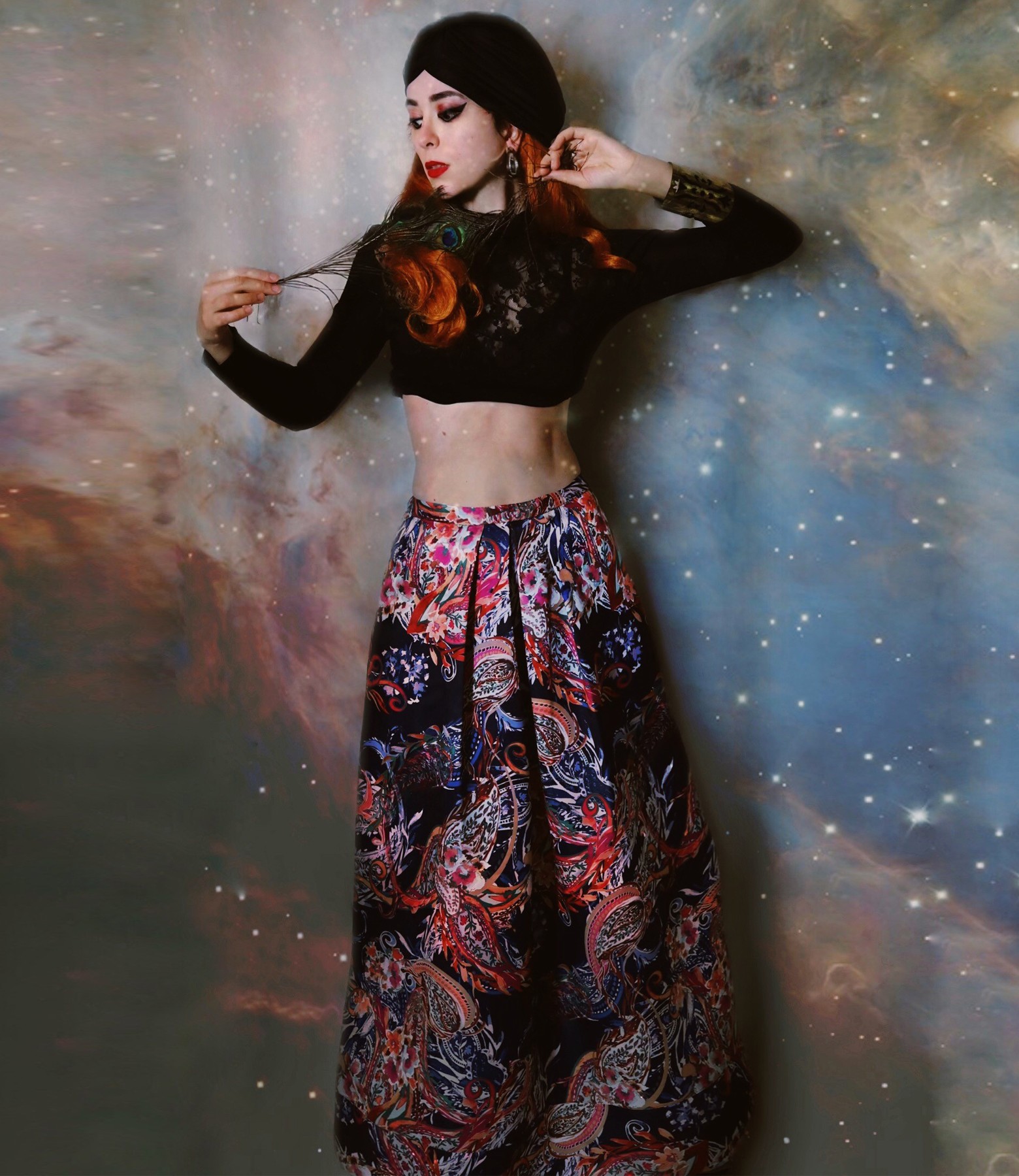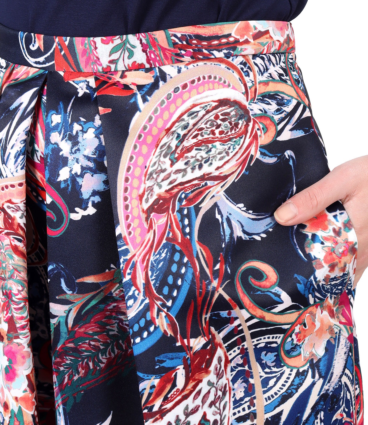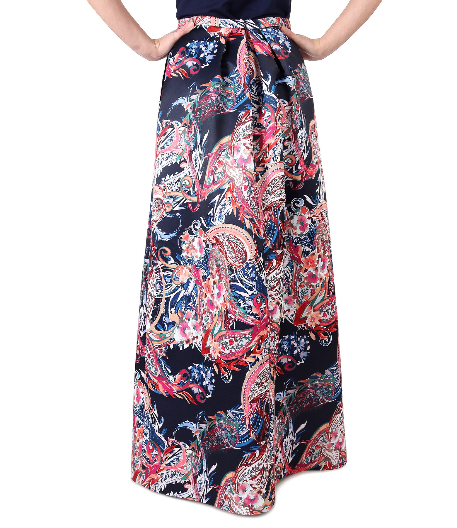 Long satin Duchesse skirt printed with oversized flowers, padded, with side pockets and pleats on the front and back. Closes with a zipper hidden in the middle of the back.
