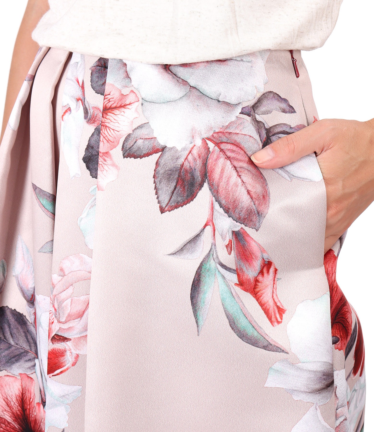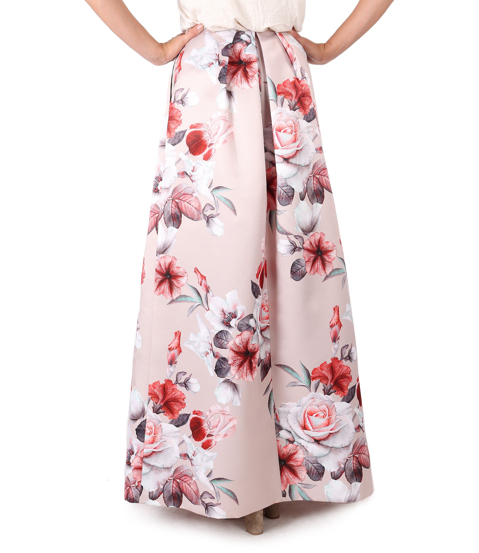 Long skirt printed with floral motifs, padded, with pleats and side pockets. It closes with a zipper hidden in the middle of the back.