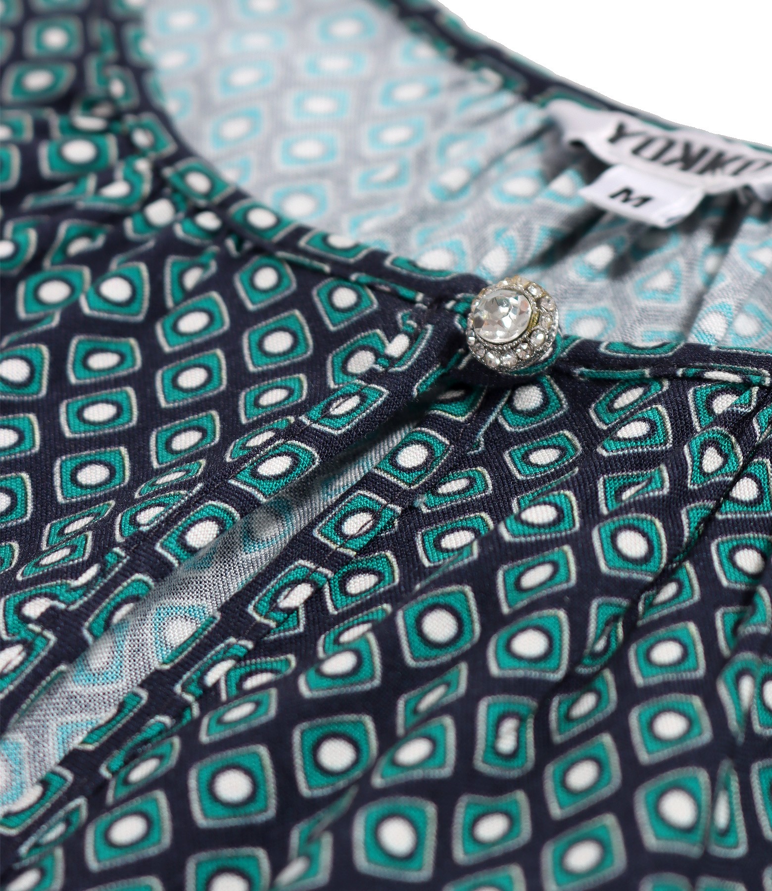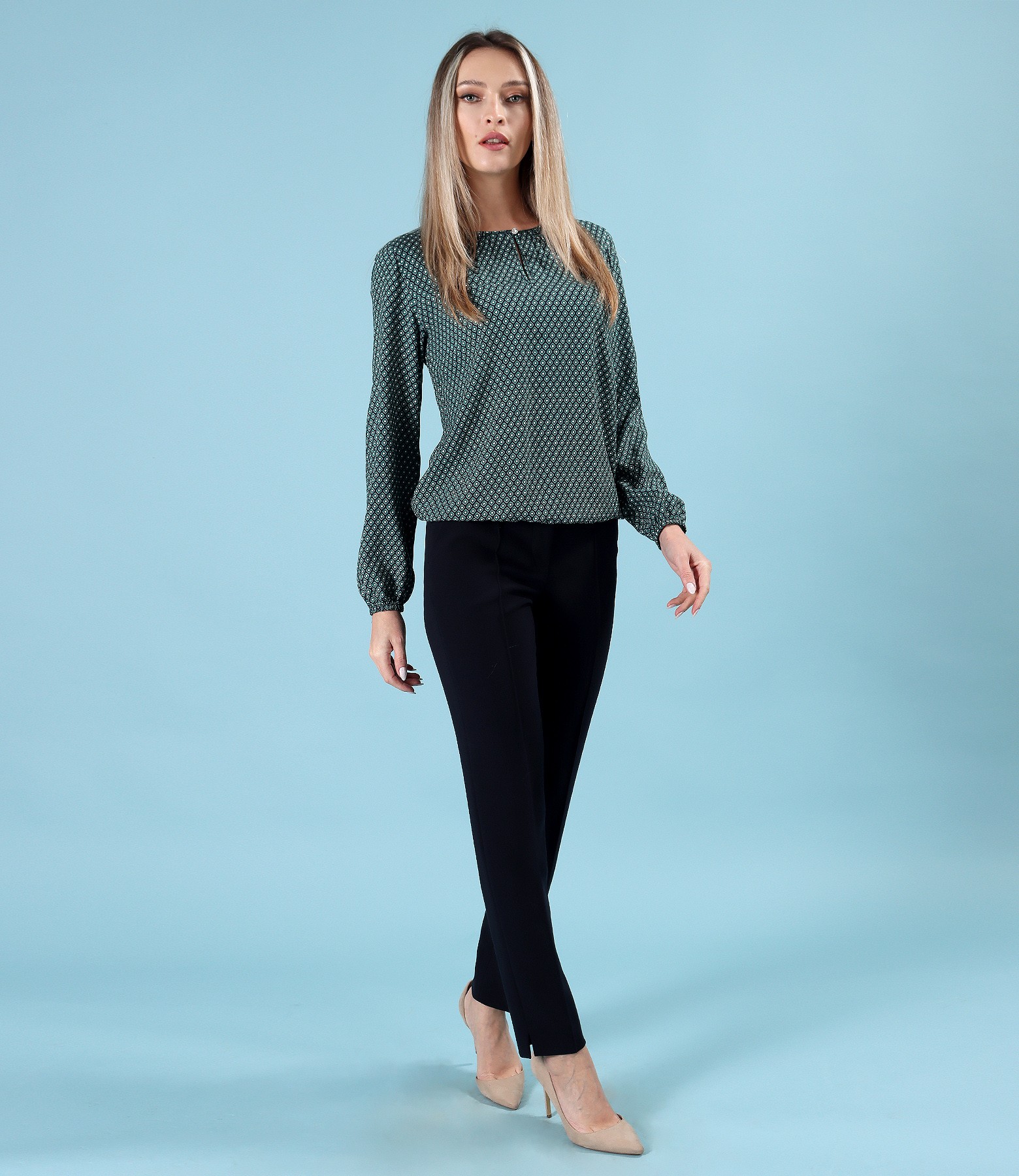 Long-sleeved viscose blouse printed with geometric motifs, with a round neckline and elastic waist. It closes with a button in the middle of the front.