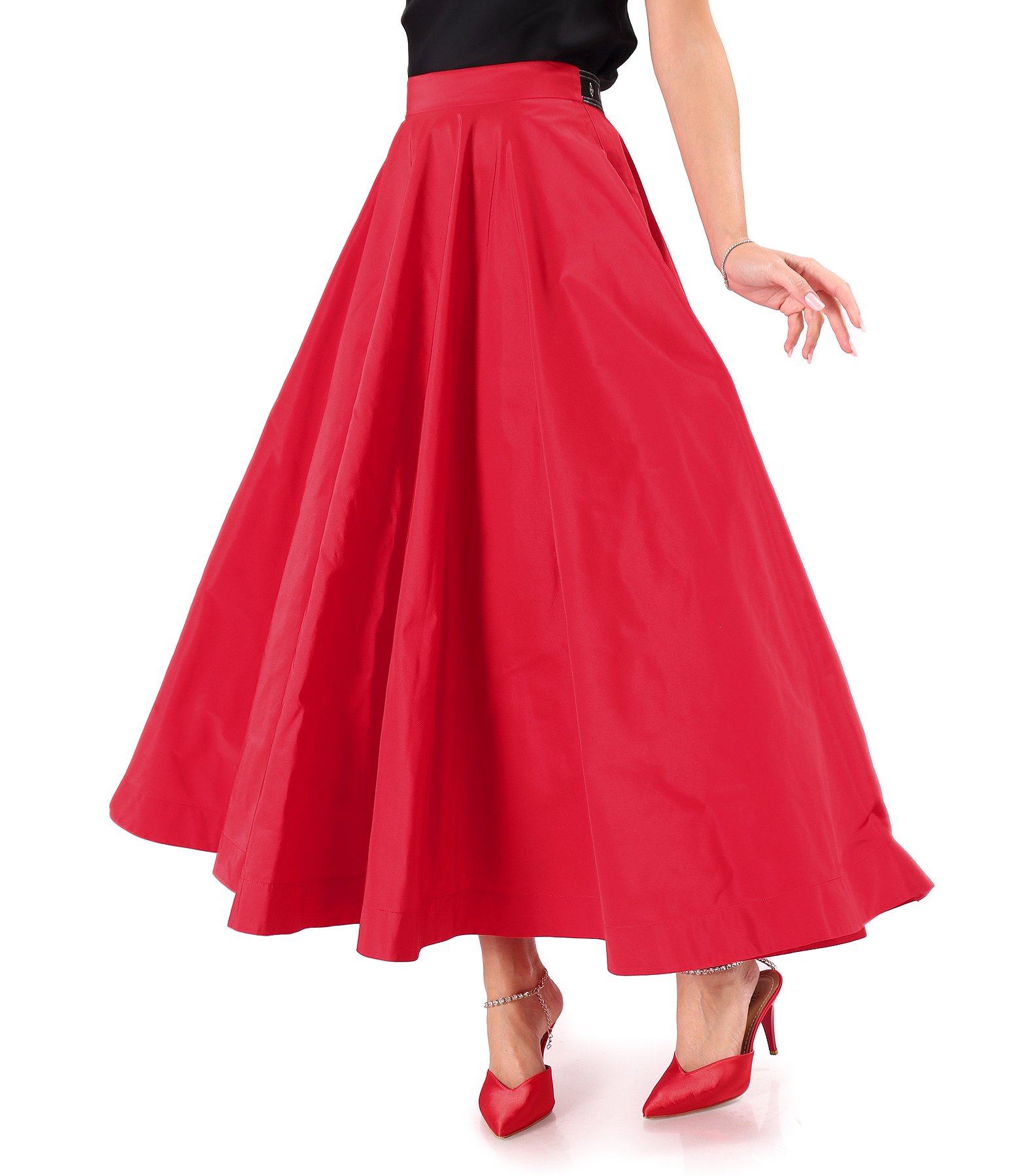 Long taffeta skirt with a matte finish, featuring decorative crystal elastic at the back and side pockets. It fastens with a concealed zipper at the center back
