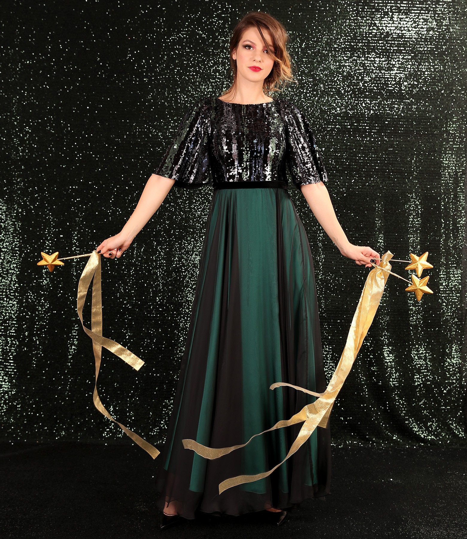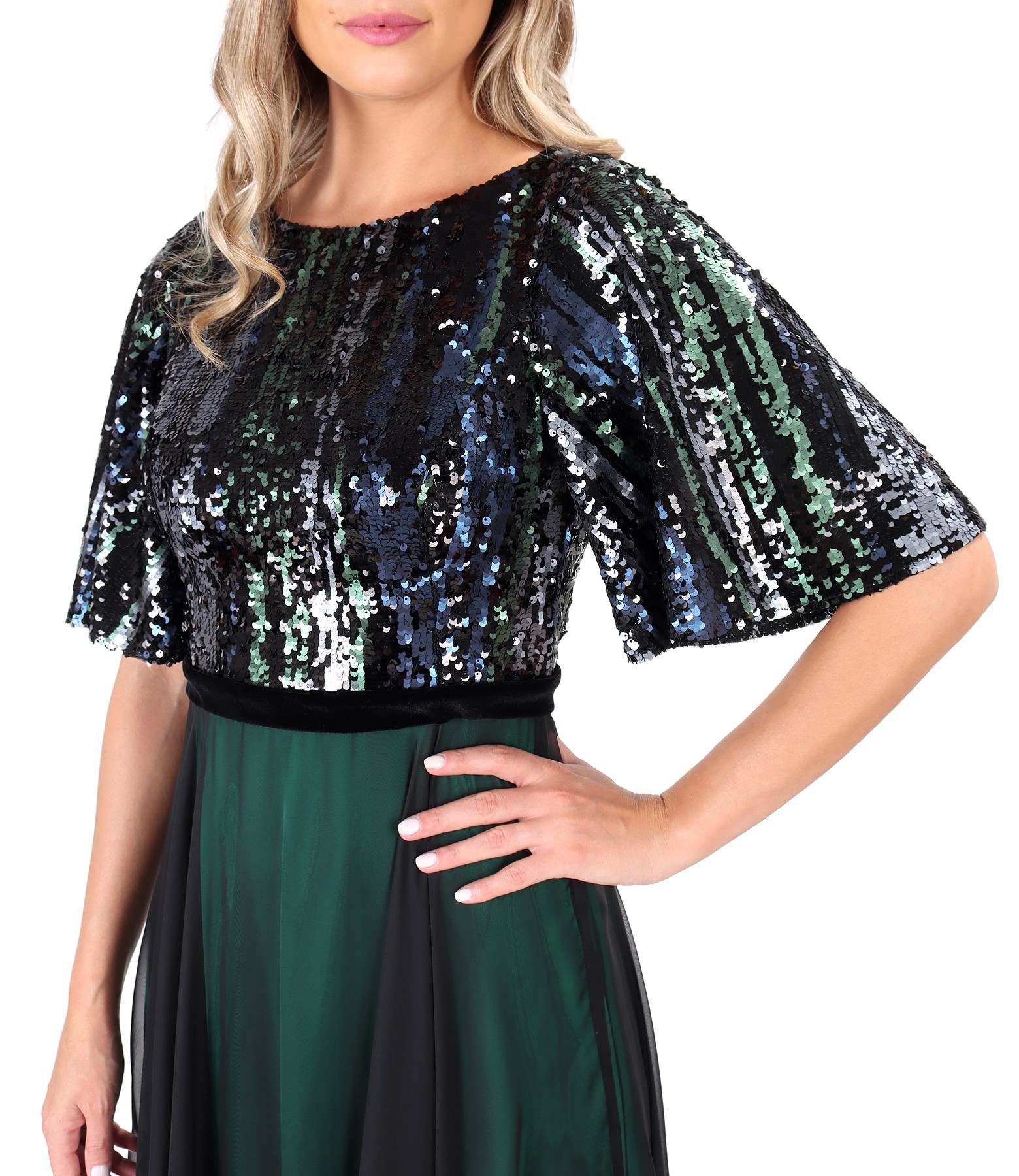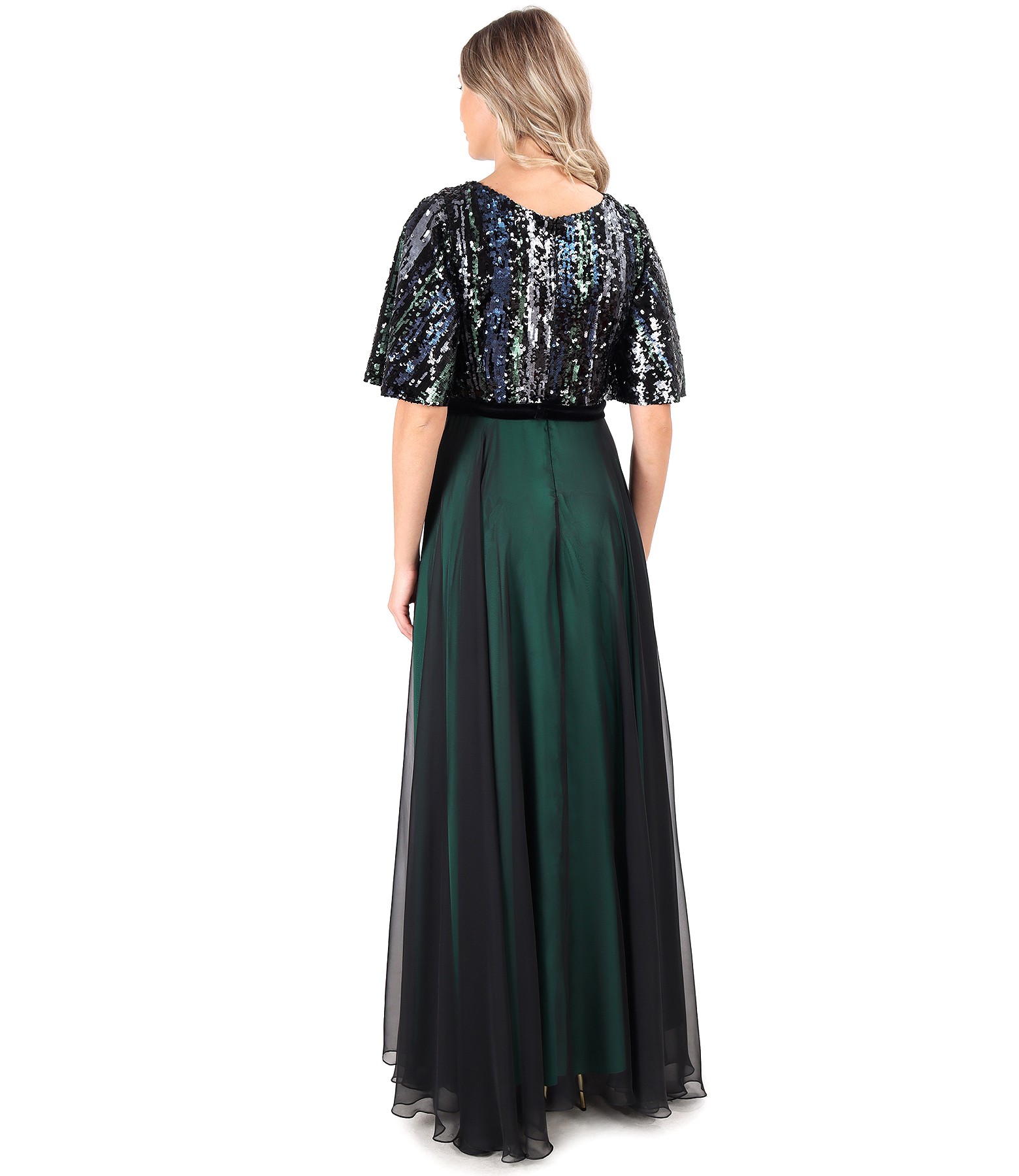 Long veil evening dress with bodice and sequin sleeves (Green), size