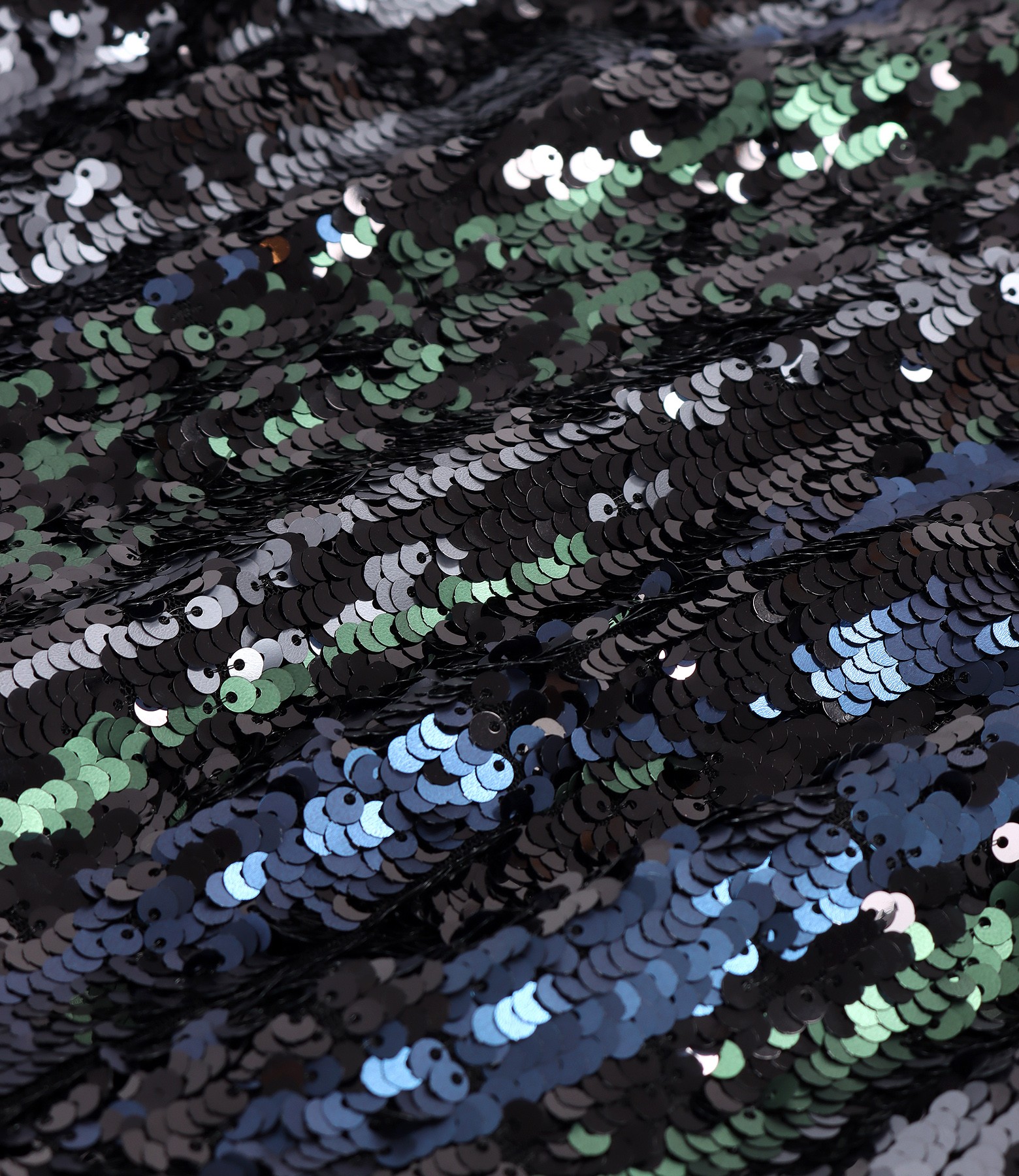 Long occasion dress made of mouselline veil, with multicolored sequin bodice, padded with contrasting elastic satin. It has a black velvet cord, wide sleeves made of multicolored sequins, and a round decolletage. Closes with a zipper hidden in the middle of the back.