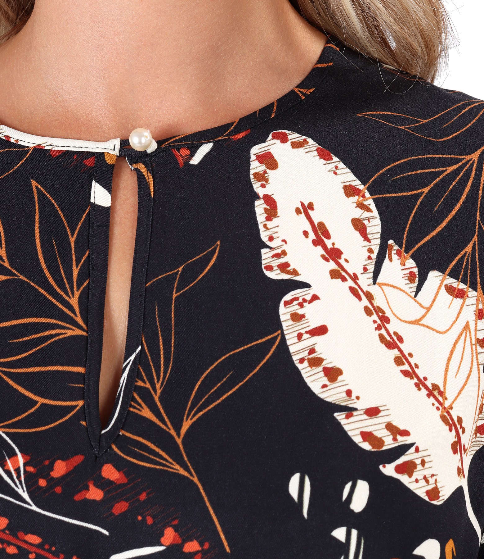 Long dress, made of viscose printed with floral motifs, unlined, with long sleeves with elastic at the ends, ruffle at the bottom and round neckline with V closed on the front with a staple. It closes at the waist with a wide cord with two staples.