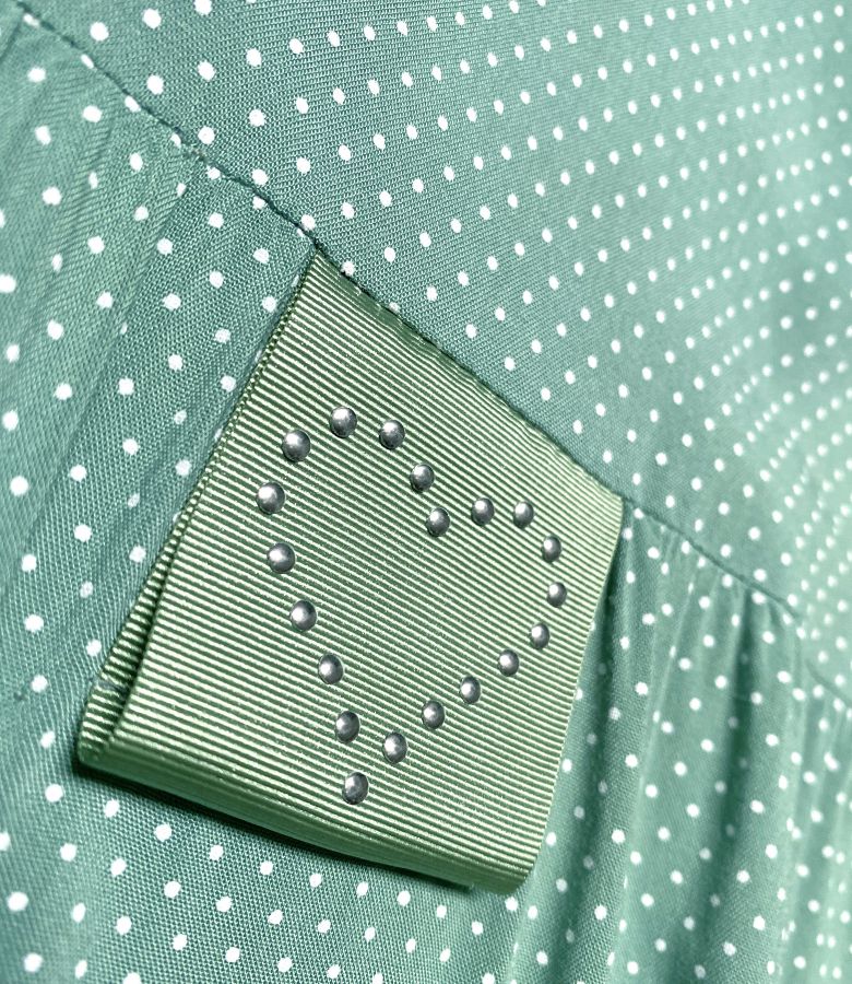 Long viscose dress with ruffles printed with dots, unlined, with short sleeves, V neckline and decorative heart-shaped application at the waist. Without closing system.