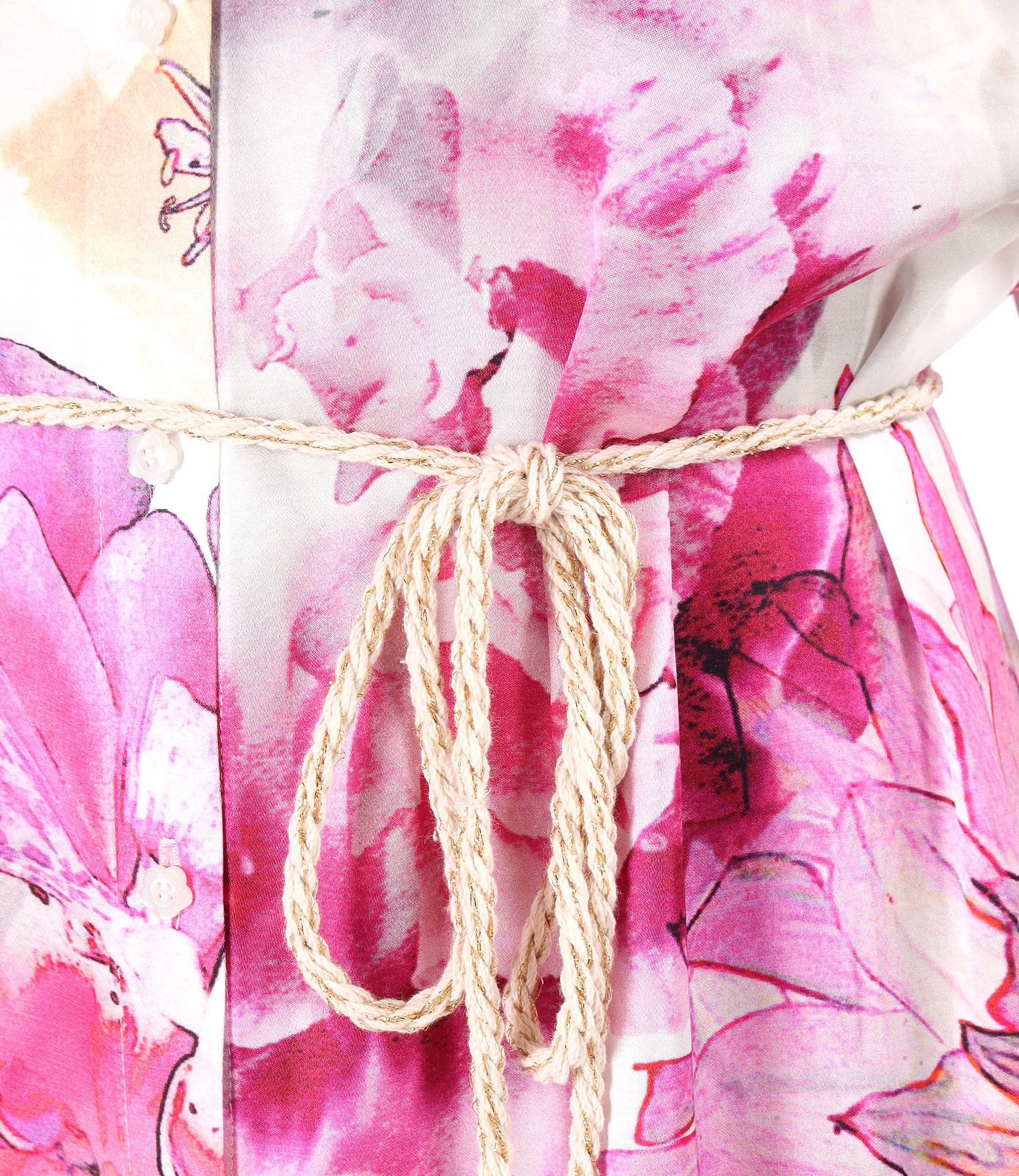 Long shirt-type dress in viscose printed with oversized floral motifs, with long sleeves, drawstring waist, and side pockets. It closes with 11 buttons on the middle front.