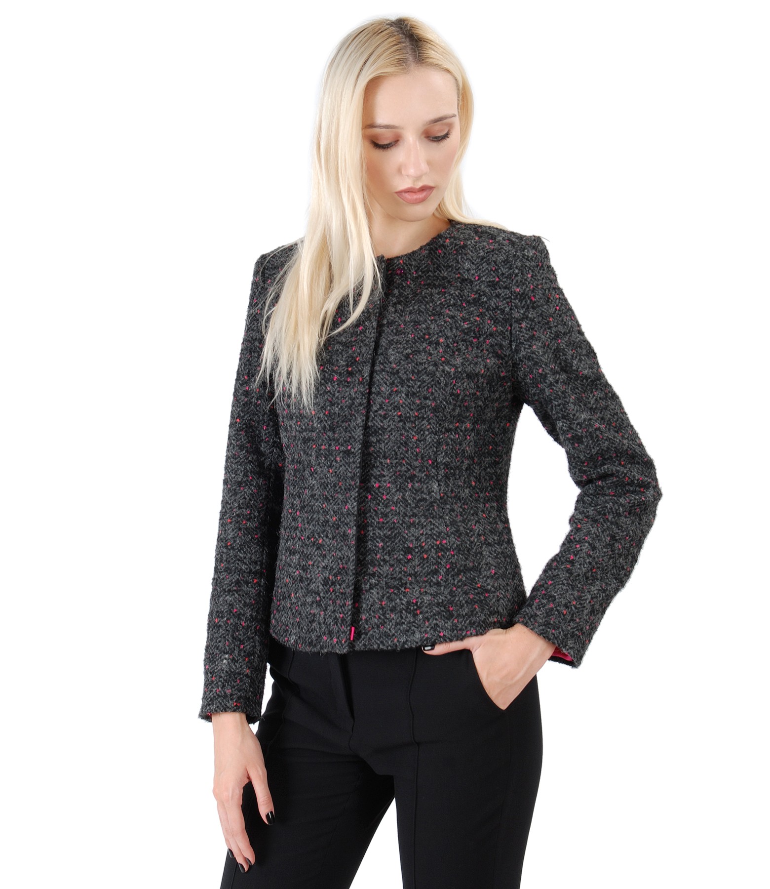 Jacket without collar, made of wool and alpaca loops, lined, with neckline around the neck embellished with crystals at the decolletage. It closes with 5 mos-baba staples on the front.