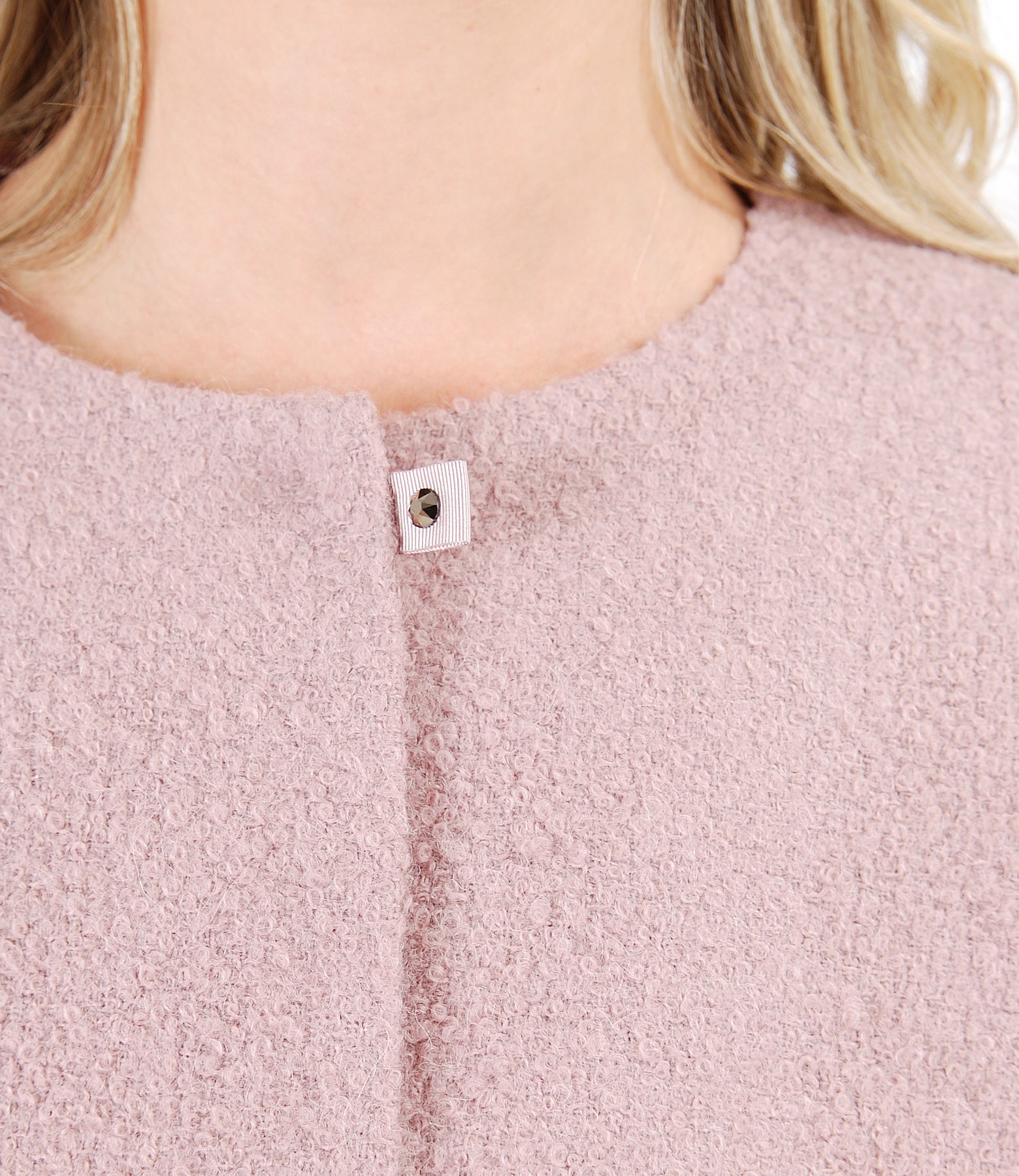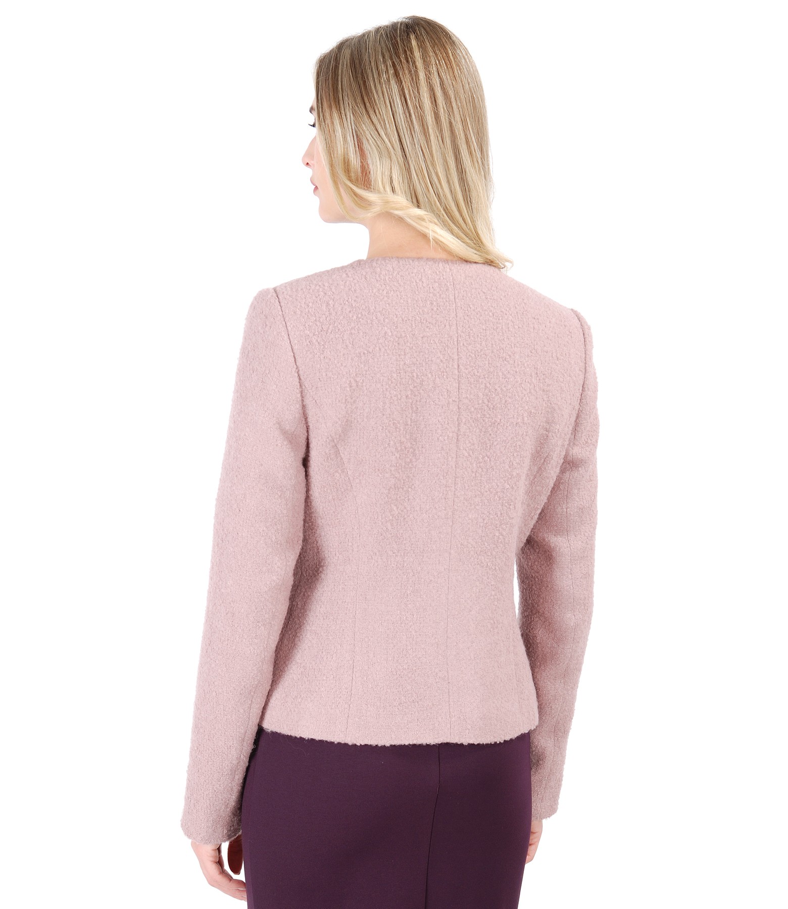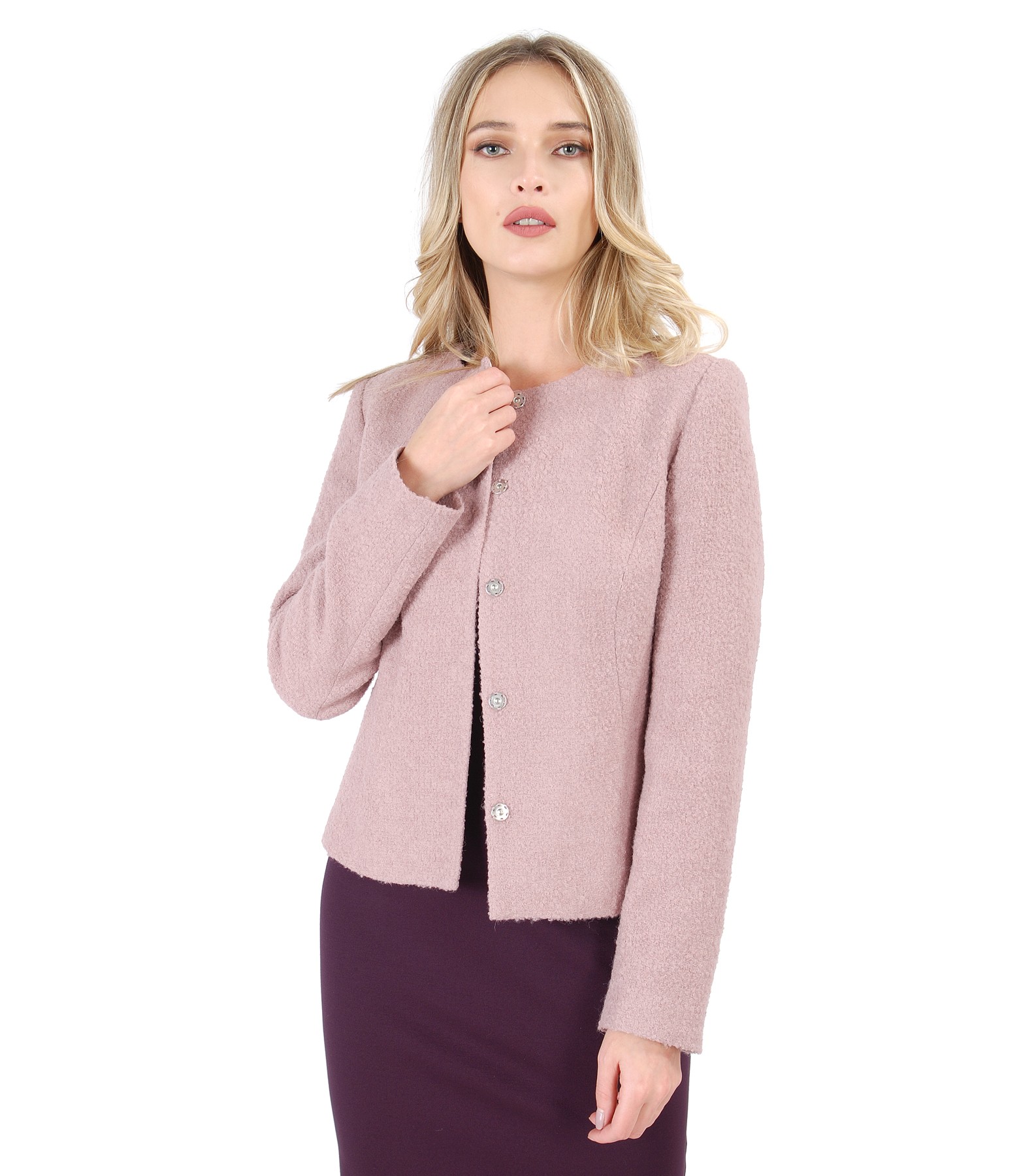 Jacket without collar, made of wool and alpaca loops, padded, embellished with crystals. Closes with a button and 5 front staples.