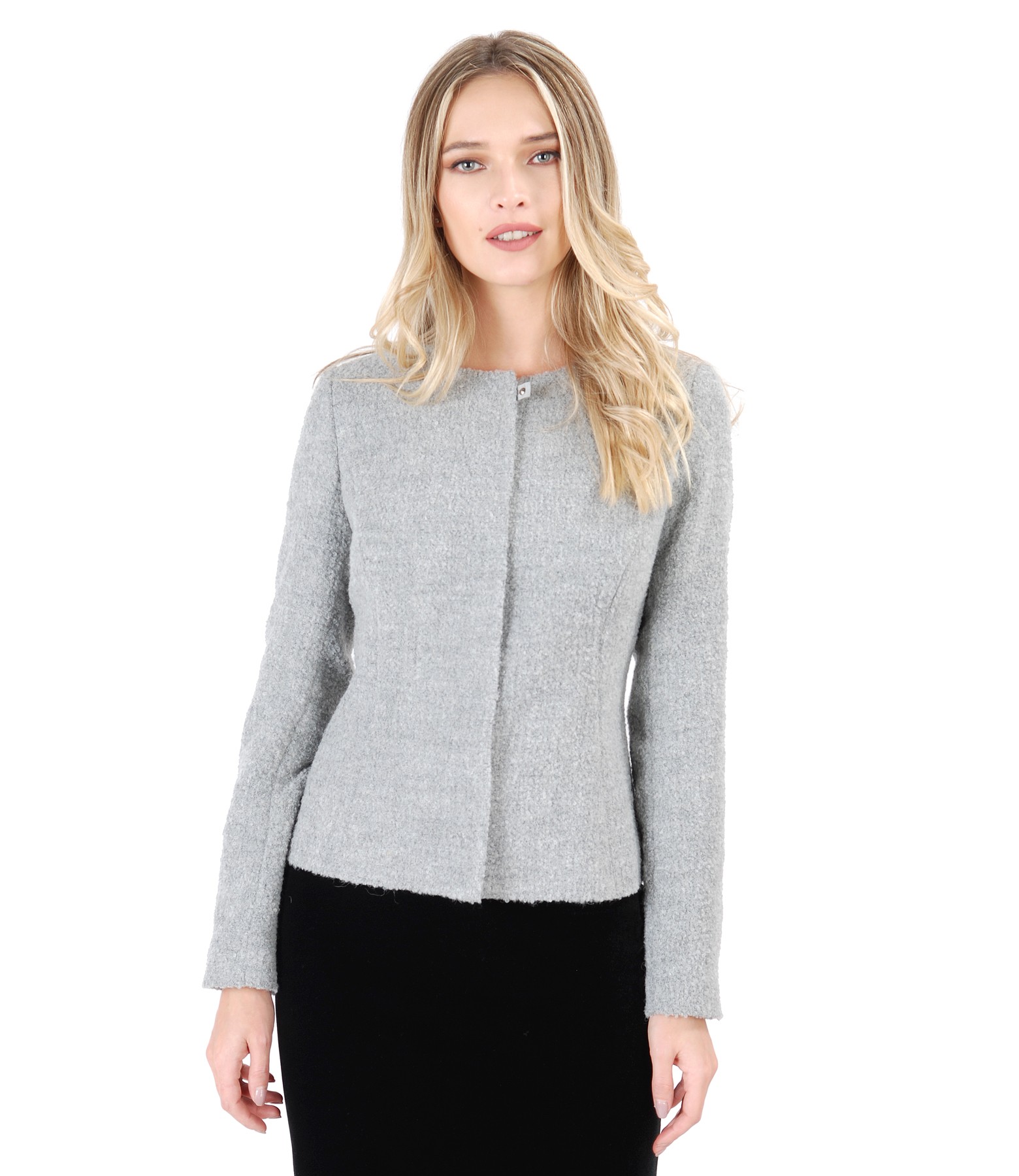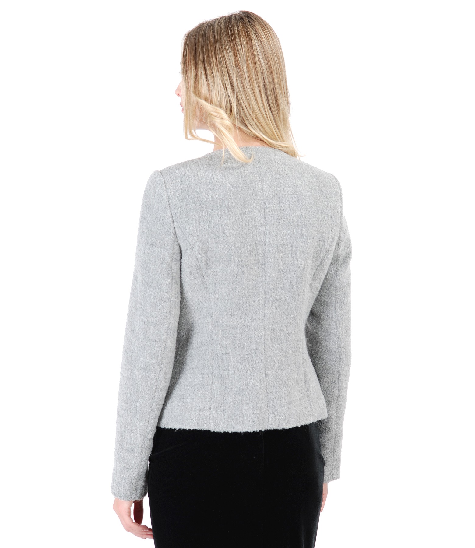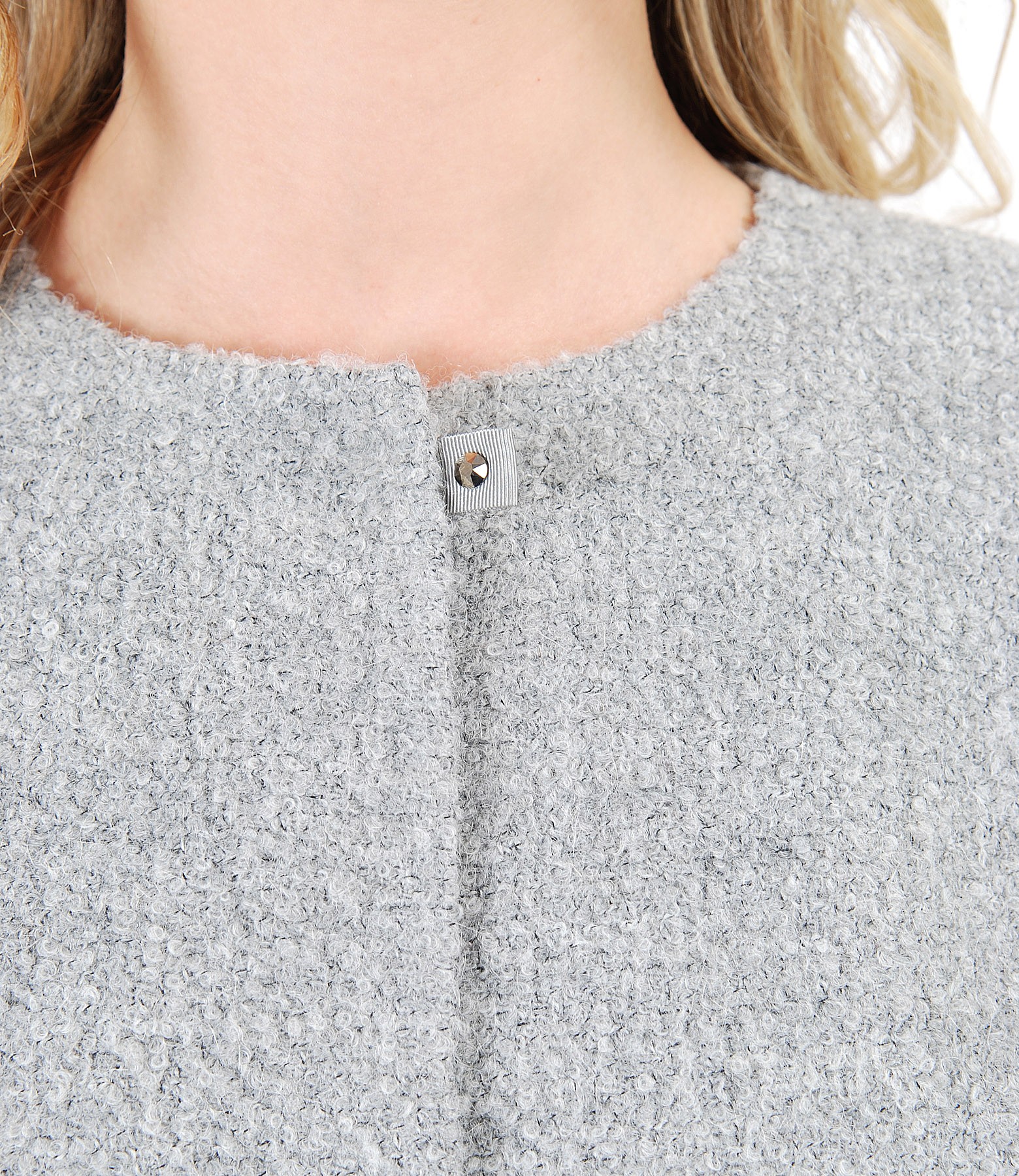 Jacket without collar, made of wool and alpaca loops, padded, embellished with crystals. Closes with a button and 5 front staples.