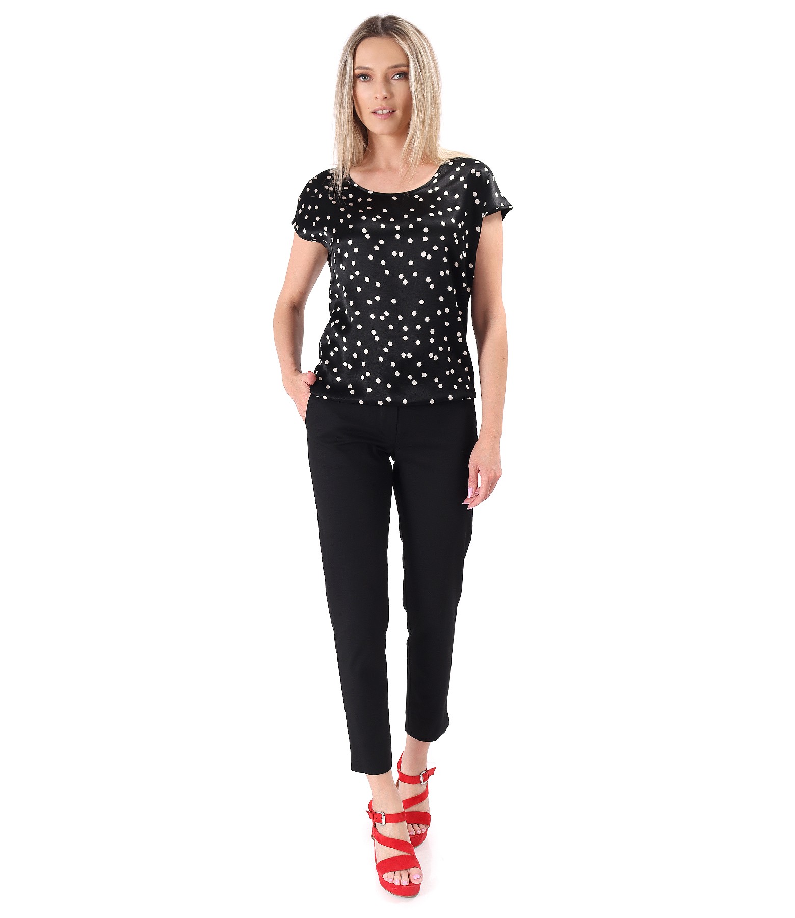 Ankle pants made of tencel with cotton, with front pockets and multicolored elastic at the waist. They close with a normal zipper, anti-button, and 2 staples on the face.