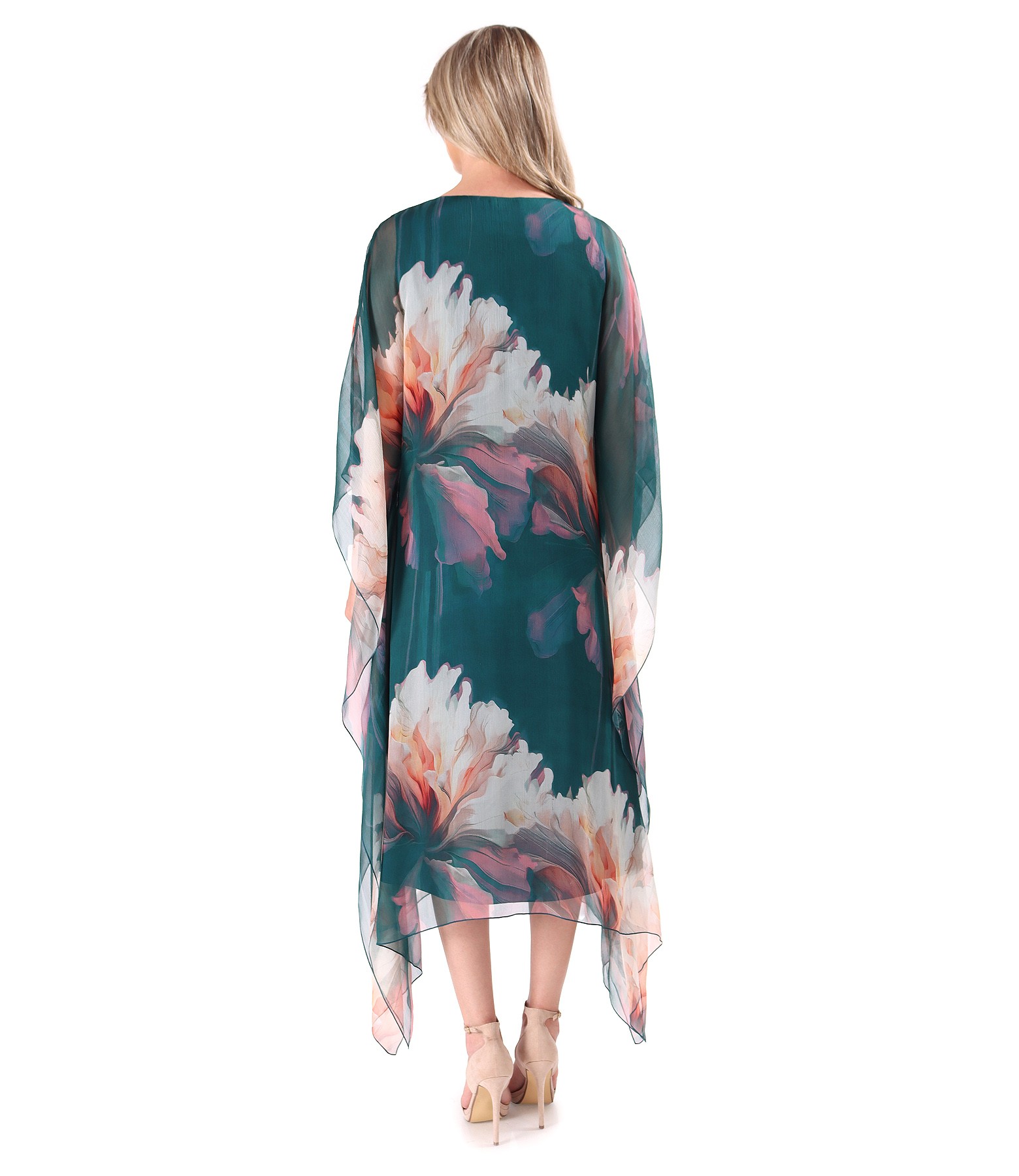 Midi butterfly dress in natural silk chiffon printed with oversized floral motifs, lined with viscose, sleeveless, and featuring a round neckline. It does not have a fastening system. The print placement varies per product.