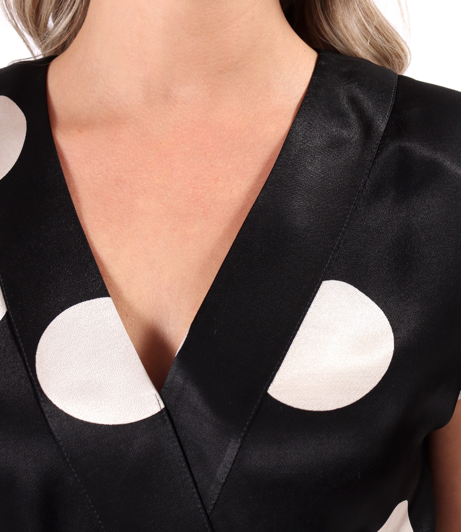 Midi dress in printed viscose satin with polka dots with high shoulders, , waist cord and short sleeves.